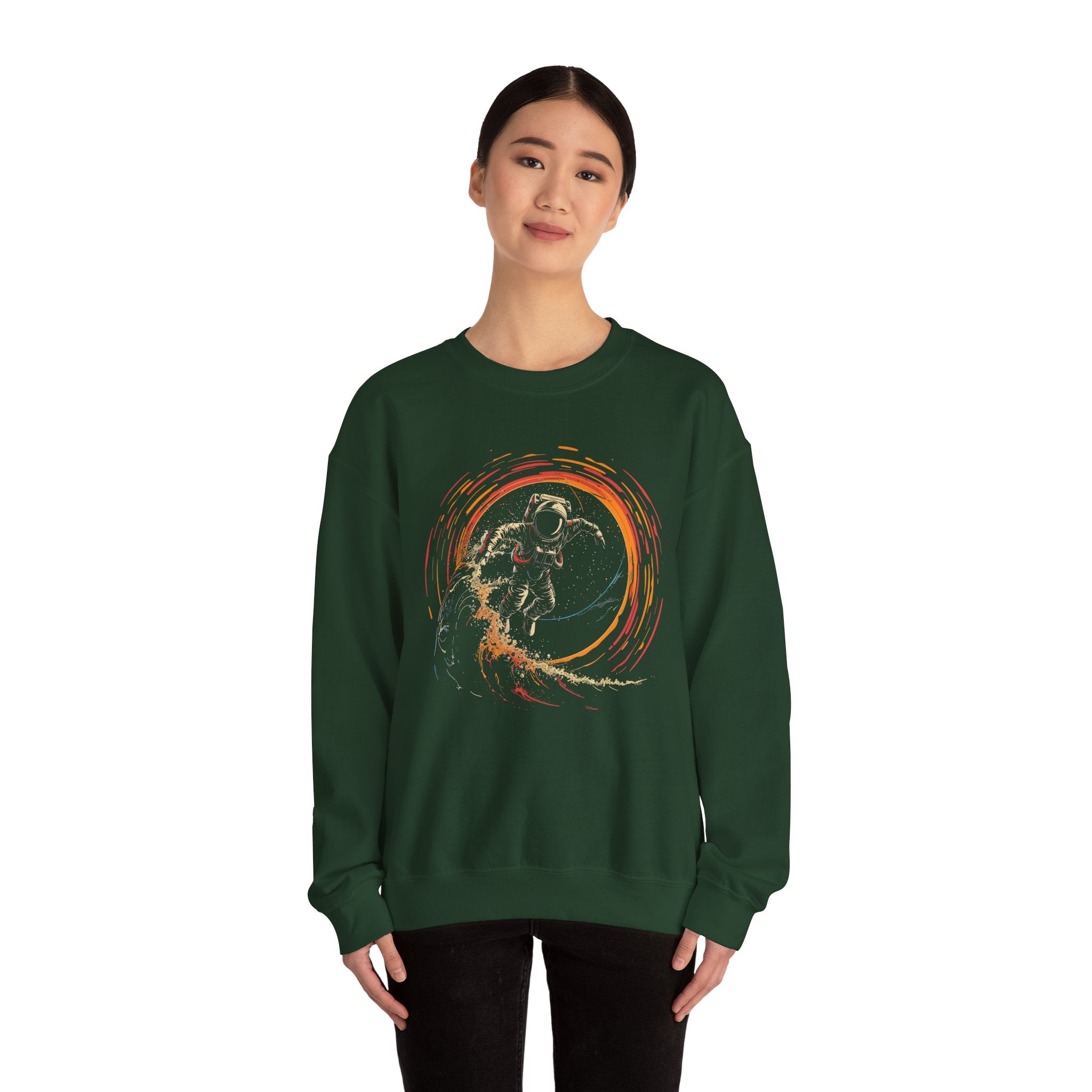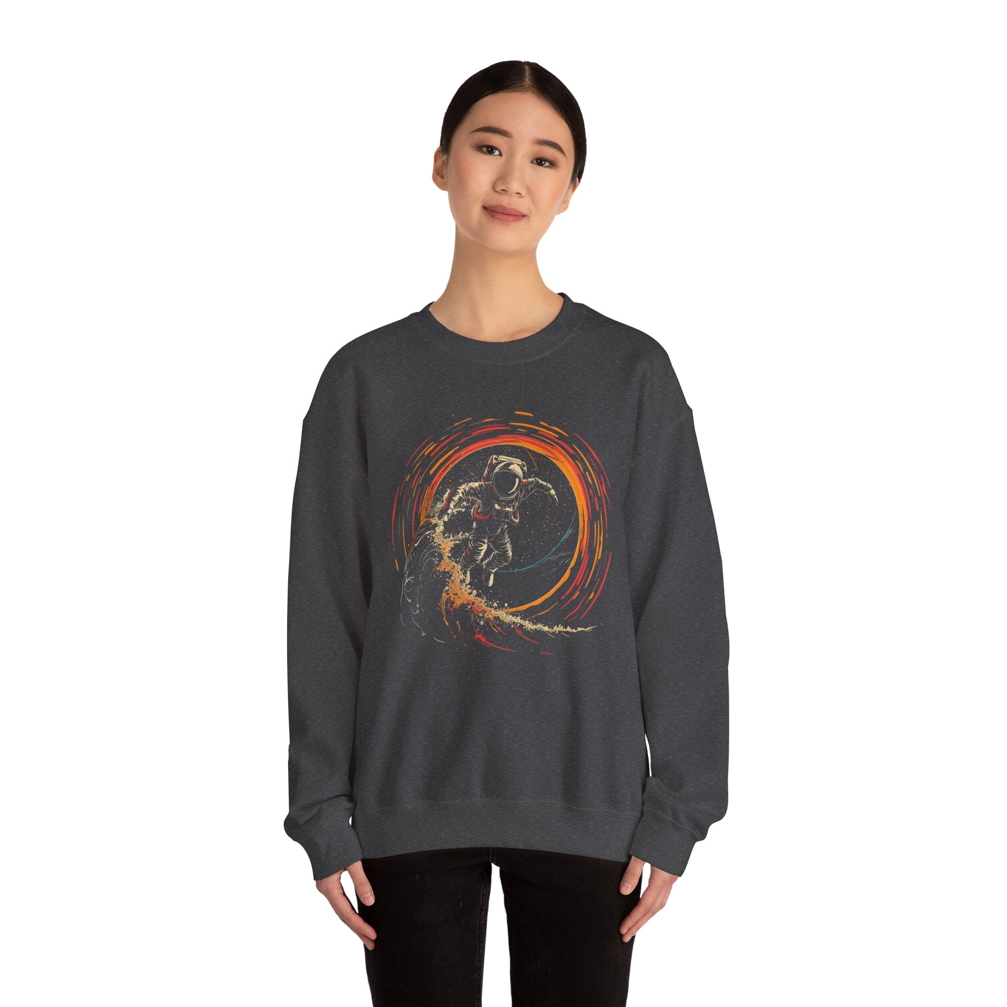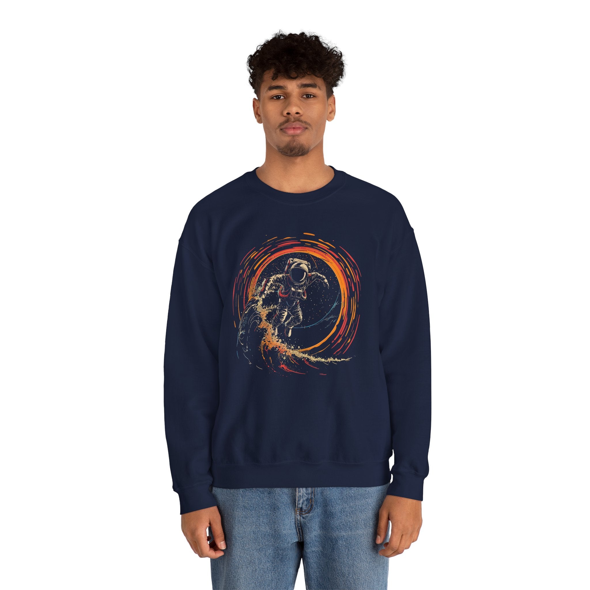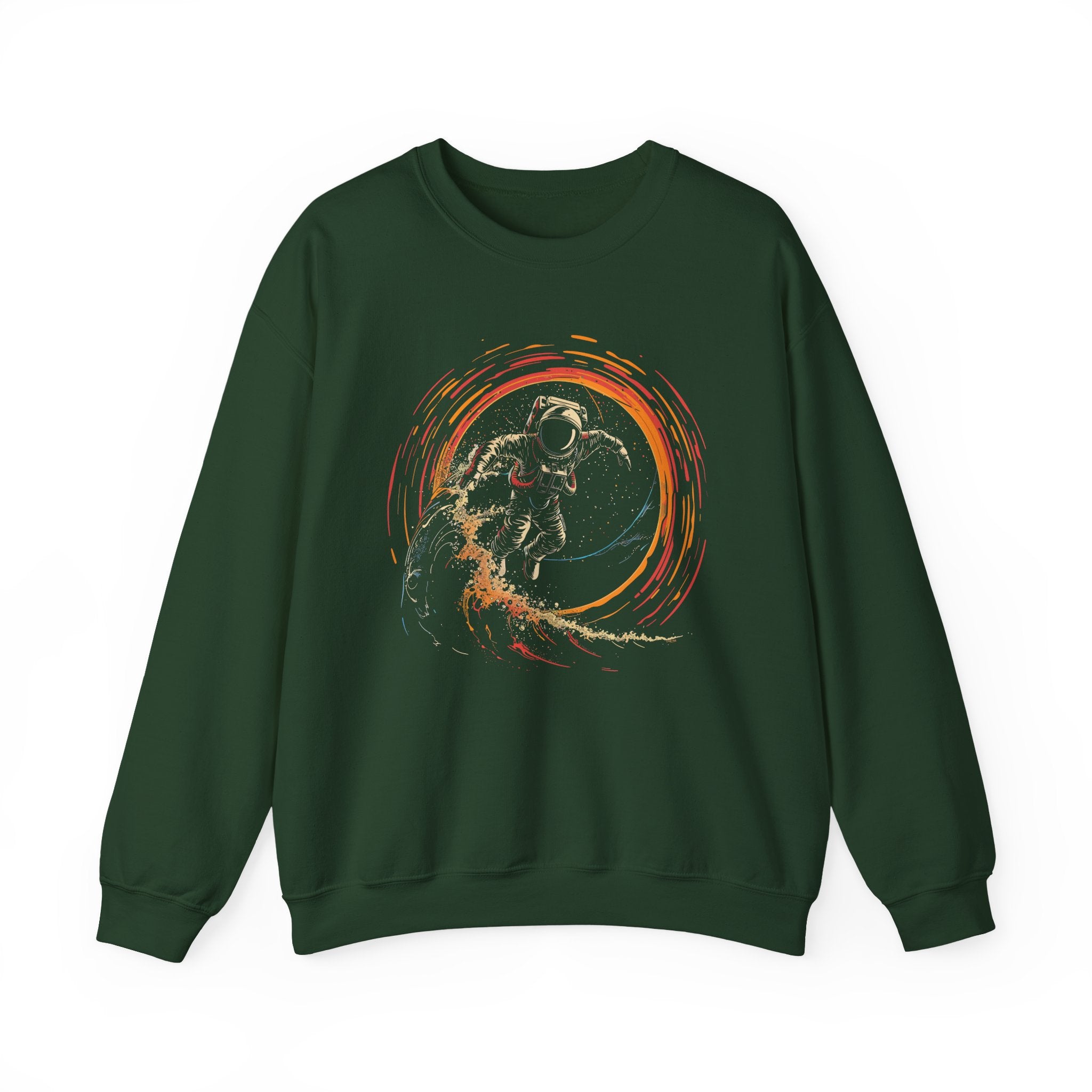 Astronaut Surfing Crewneck Sweatshirt — Space Skateboarder Cosmic Wave Design