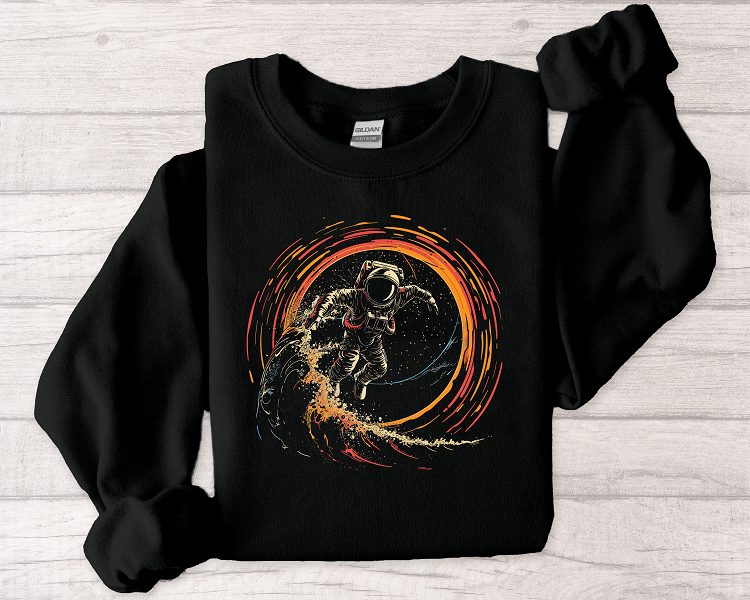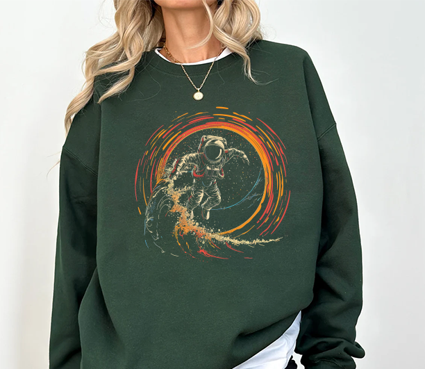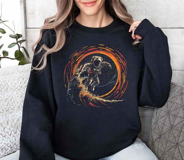 This cozy crewneck sweatshirt blends everyday comfort with adventurous, artful style. A bold astronaut graphic rides a fiery, circular wave across a deep black background — a subtle mix of retro-punk and cosmic surf that catches the eye without shouting. The medium-heavy 50/50 cotton-poly fabric drapes cleanly in a classic fit, while ribbed collar and cuffs keep shape day after day. Wear it on cool evenings by the fire, to weekend meetups with fellow stargazers, or while sketching ideas in a coffee shop. The embroidered and printed detailing options add tactile character, and OEKO-TEX dyes plus ethical US-cotton sourcing give this sweatshirt a thoughtful, responsible edge.