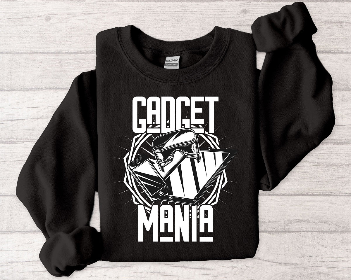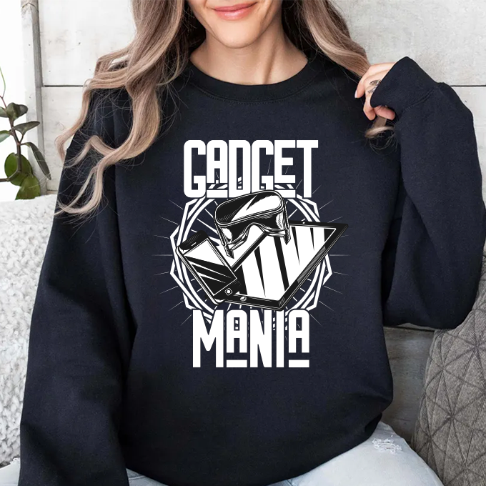 Black crewneck sweatshirt with bold monochrome art that reads “GADGET MANIA” around a stylized, helmeted figure. The design feels athletic and retro-comic, high-contrast lines and geometric framing give it an energetic, collectible vibe. Wear it to show off fandom without shouting: the graphic sits confidently on the chest, while the clean black background keeps the look wearable every day. The midweight fabric and classic cut make it a dependable layer for cool evenings, travel, rehearsals, or meetups. Embroidery and printed label options add subtle, durable detailing for a finished, long-lasting piece.