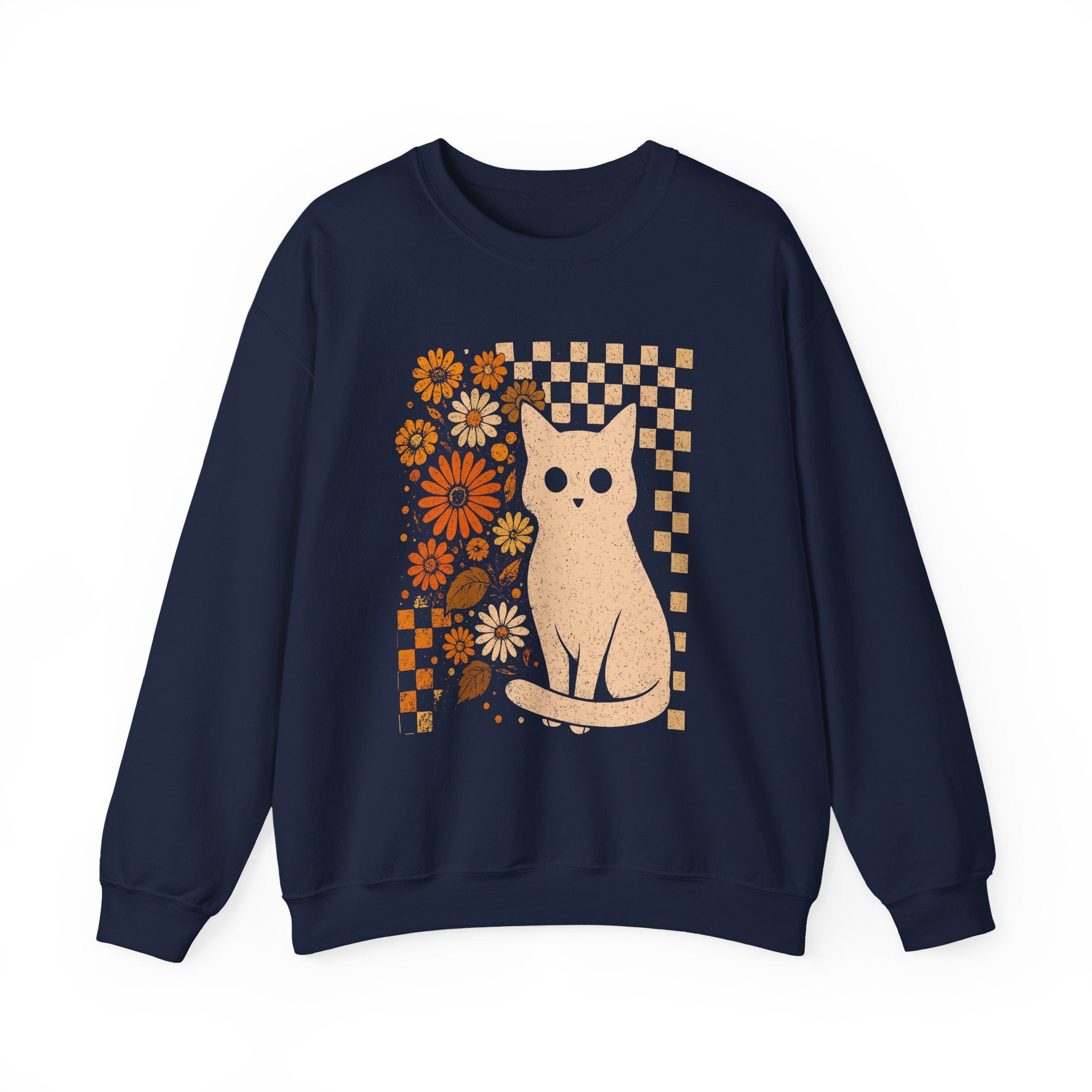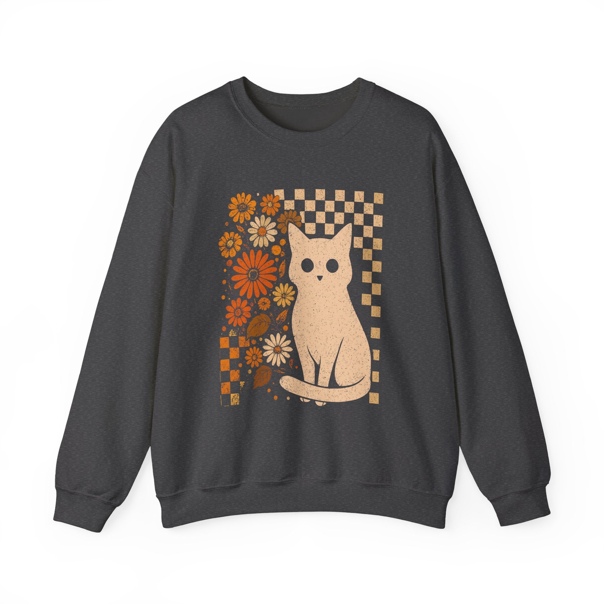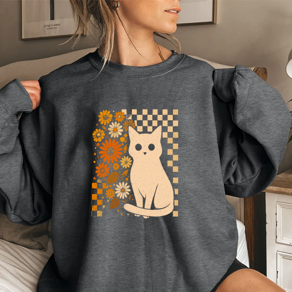 A cozy, thoughtfully made crewneck that feels like a quiet afternoon with a purring friend. Softly brushed medium-heavy fabric holds a warm, vintage-inspired print of a serene cream cat set against a checkerboard and a cascade of retro daisies in burnt orange and golden tones. The relaxed, classic fit and ribbed collar keep the silhouette clean while double-needle stitching reinforces seams for everyday wear. Wear it on slow mornings, during long drives to the countryside, or when curling up with a book — it brings a calm, nostalgic vibe to everyday moments.