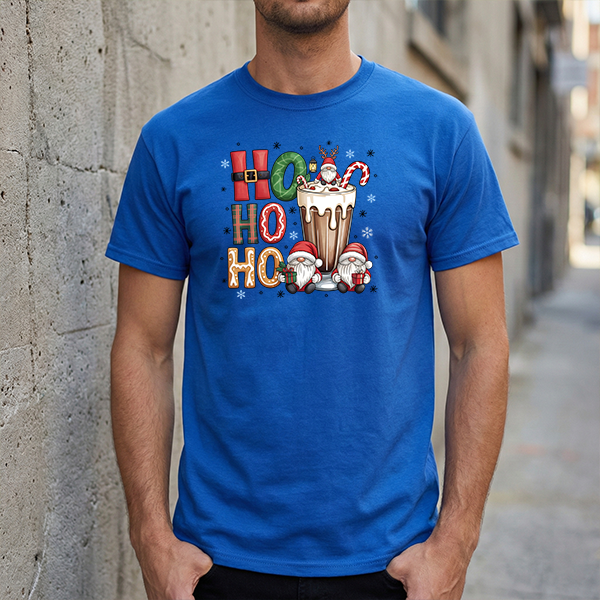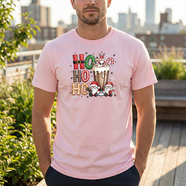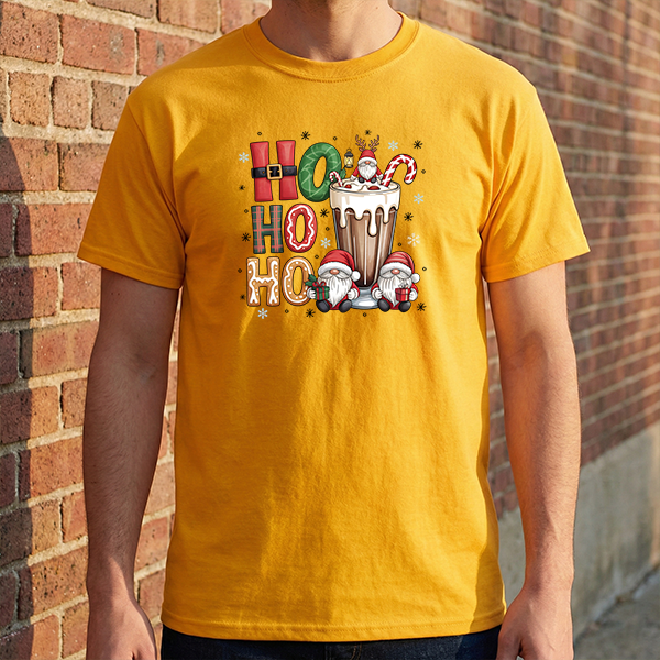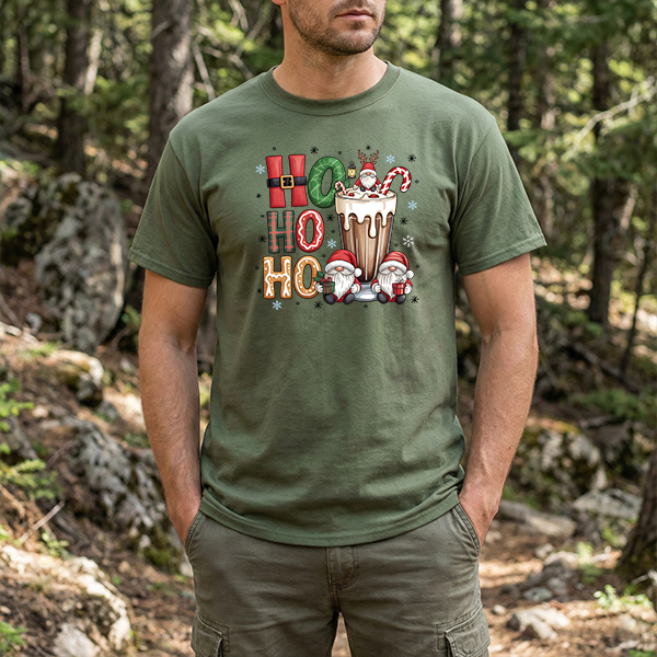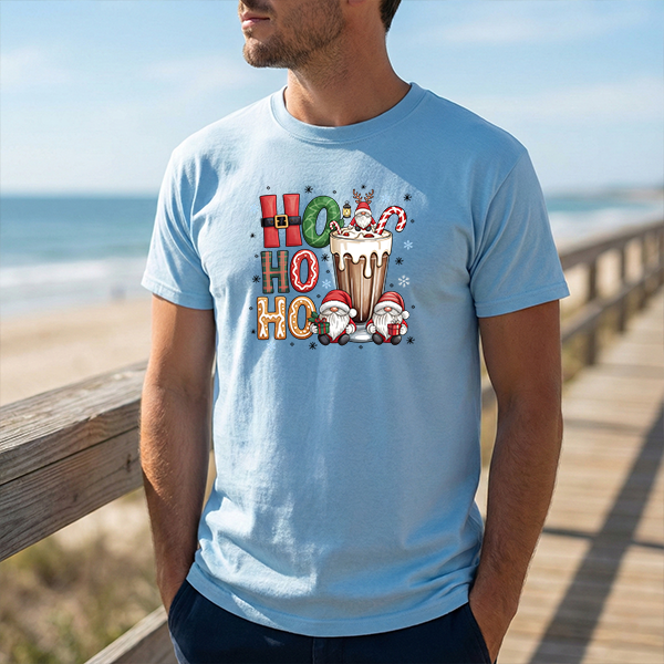 This soft, classic-fit tee brings cozy holiday cheer to casual winter days. A warm, playful print centers on steaming cocoa, candy canes and tiny gnomes, with stacked “HO HO HO” lettering in festive red, green and gingerbread tones. Wear it layered under a cardigan for a Christmas market stroll, or paired with jeans while wrapping presents and sipping something hot. The medium-weight cotton feels sturdy yet breathable, and the ribbed crew neck keeps its shape through washes. Little details like shoulder twill, tear-away label, and durable printing give this tee a comfortable, lived-in feel that stays bright season after season.