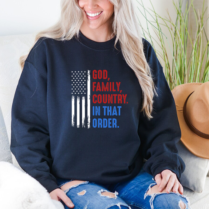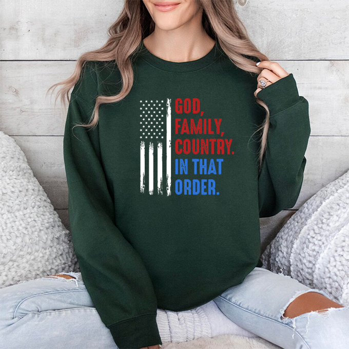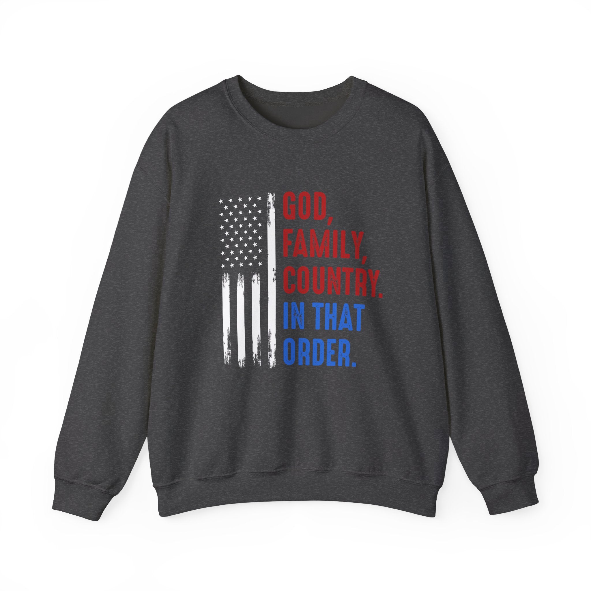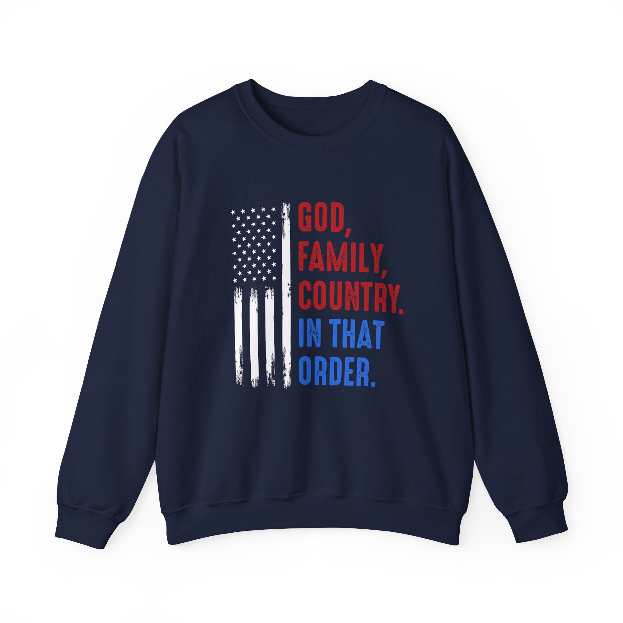 Crewneck Sweatshirt — "God, Family, Country. In That Order." Patriotic American Flag Design