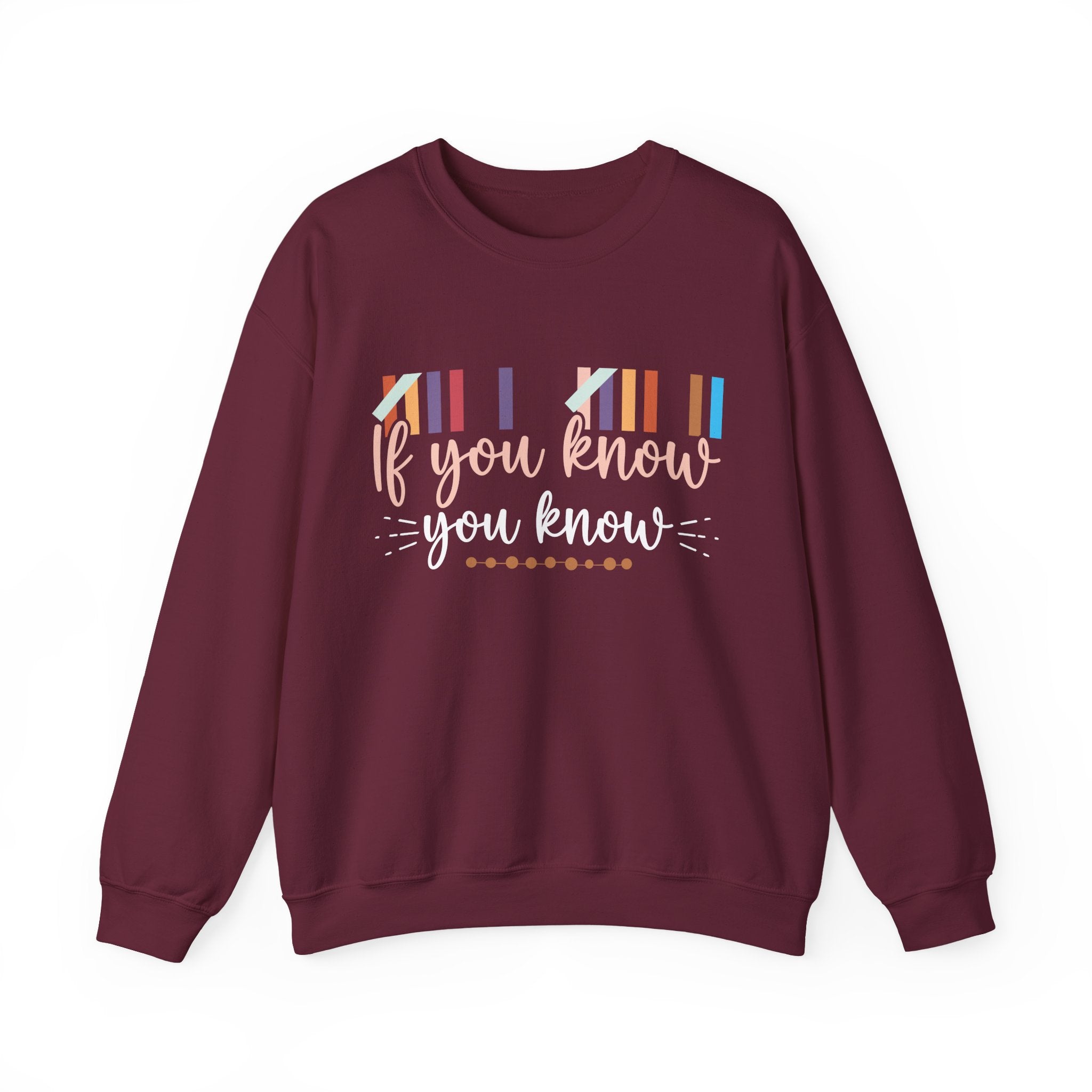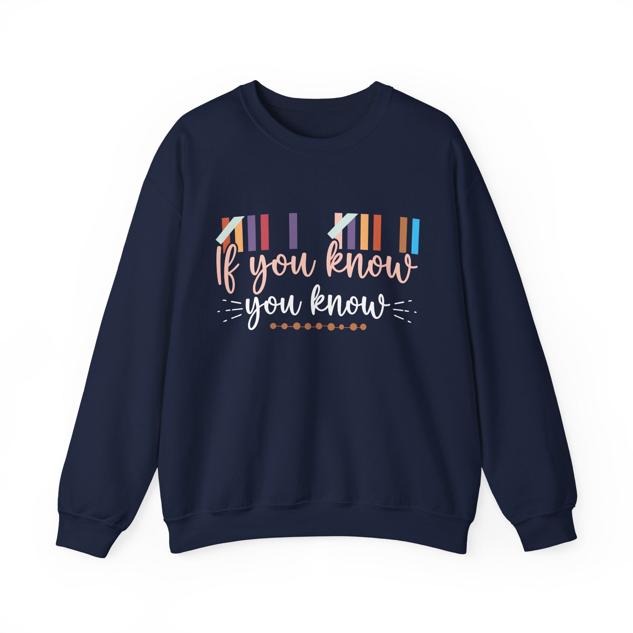 Soft, roomy, and quietly confident — this crewneck sweatshirt feels like a cozy nod between friends who share the same inside joke. The front reads “If you know — you know” in playful script surrounded by colorful barcode-like stripes, giving it a low-key, clever vibe. Wear it on slow mornings with coffee, layered for movie nights, or as your go-to travel sweater for flights and long drives. The fit is relaxed and familiar; the fabric is medium‑heavy so it holds its shape while staying comfortable. It’s the kind of piece you reach for when you want warmth, subtle personality, and a little wink to anyone who gets the reference.