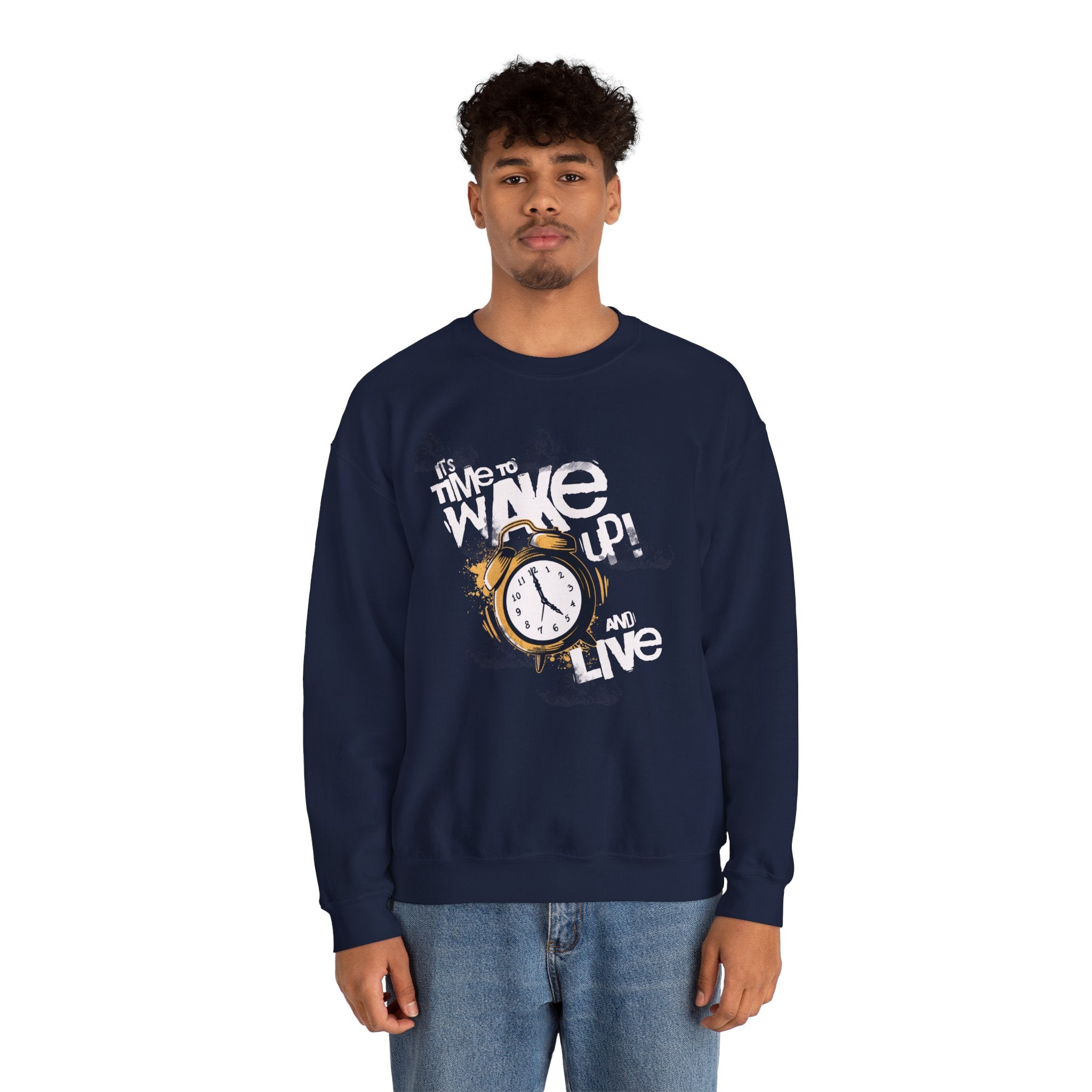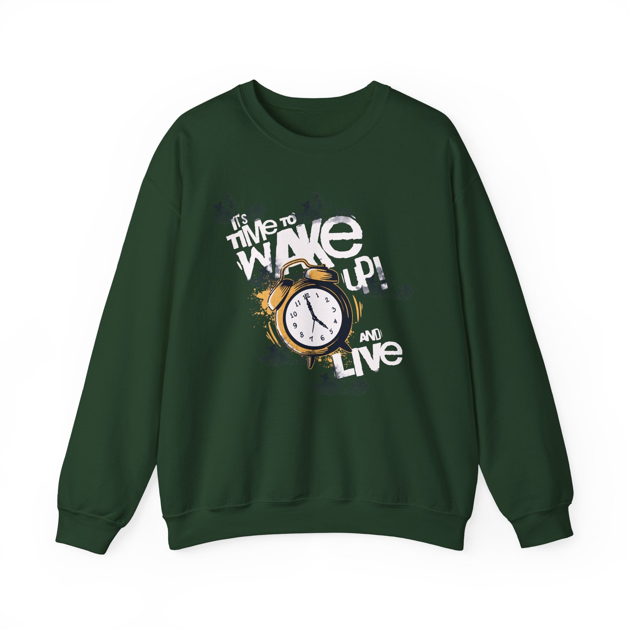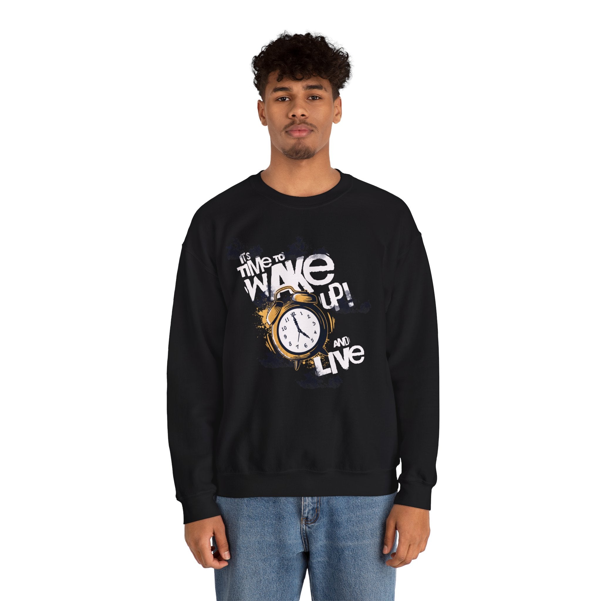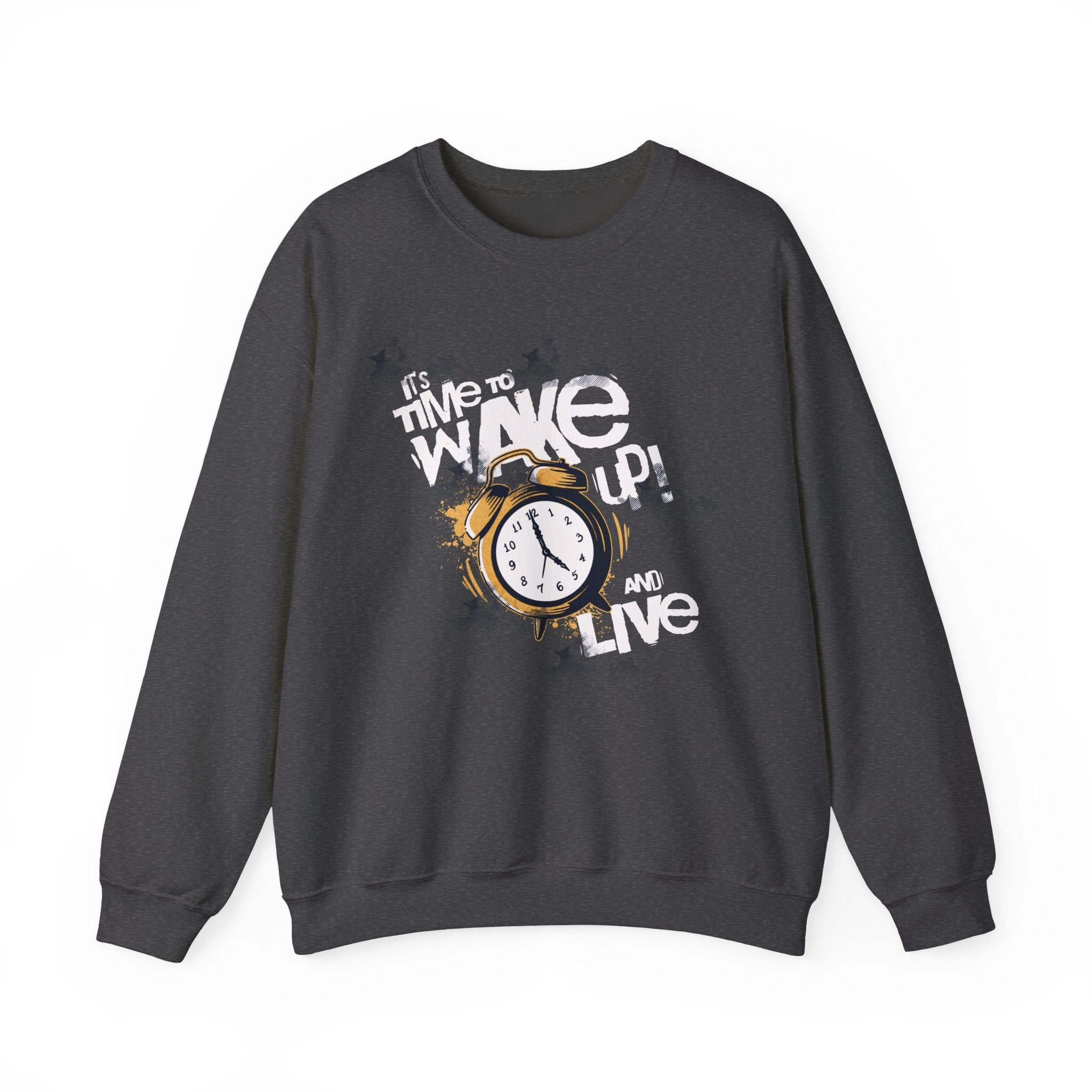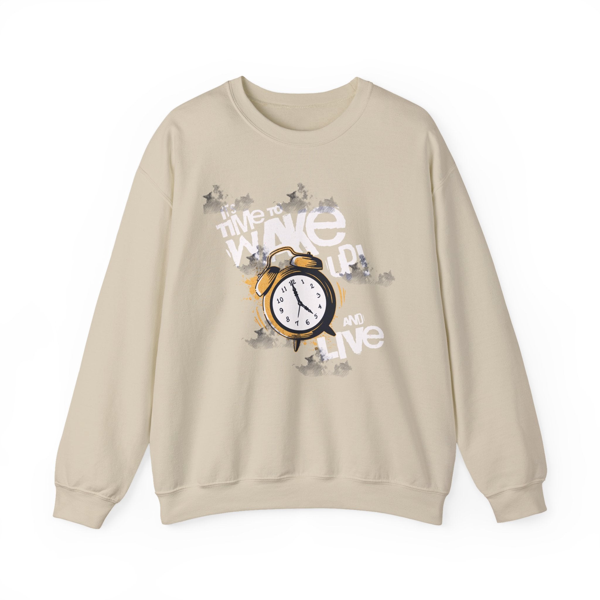 Crewneck Sweatshirt — "Time to Wake Up and Live" Alarm Clock Graphic