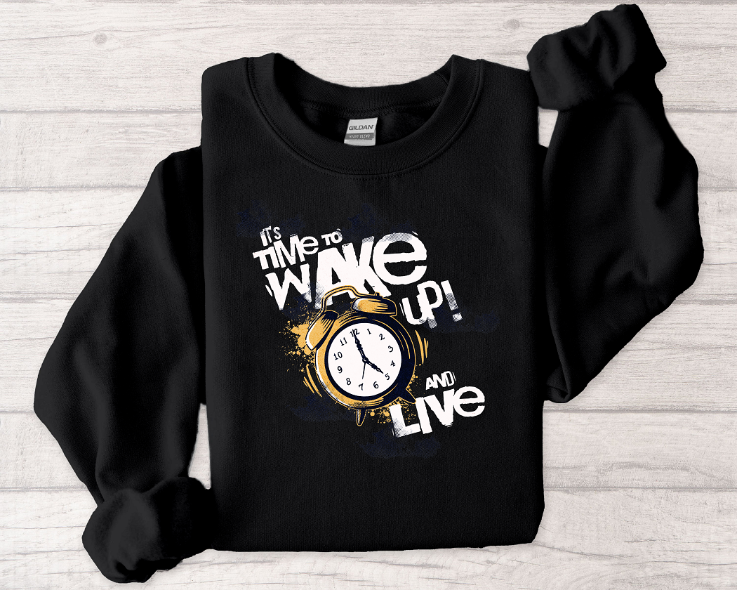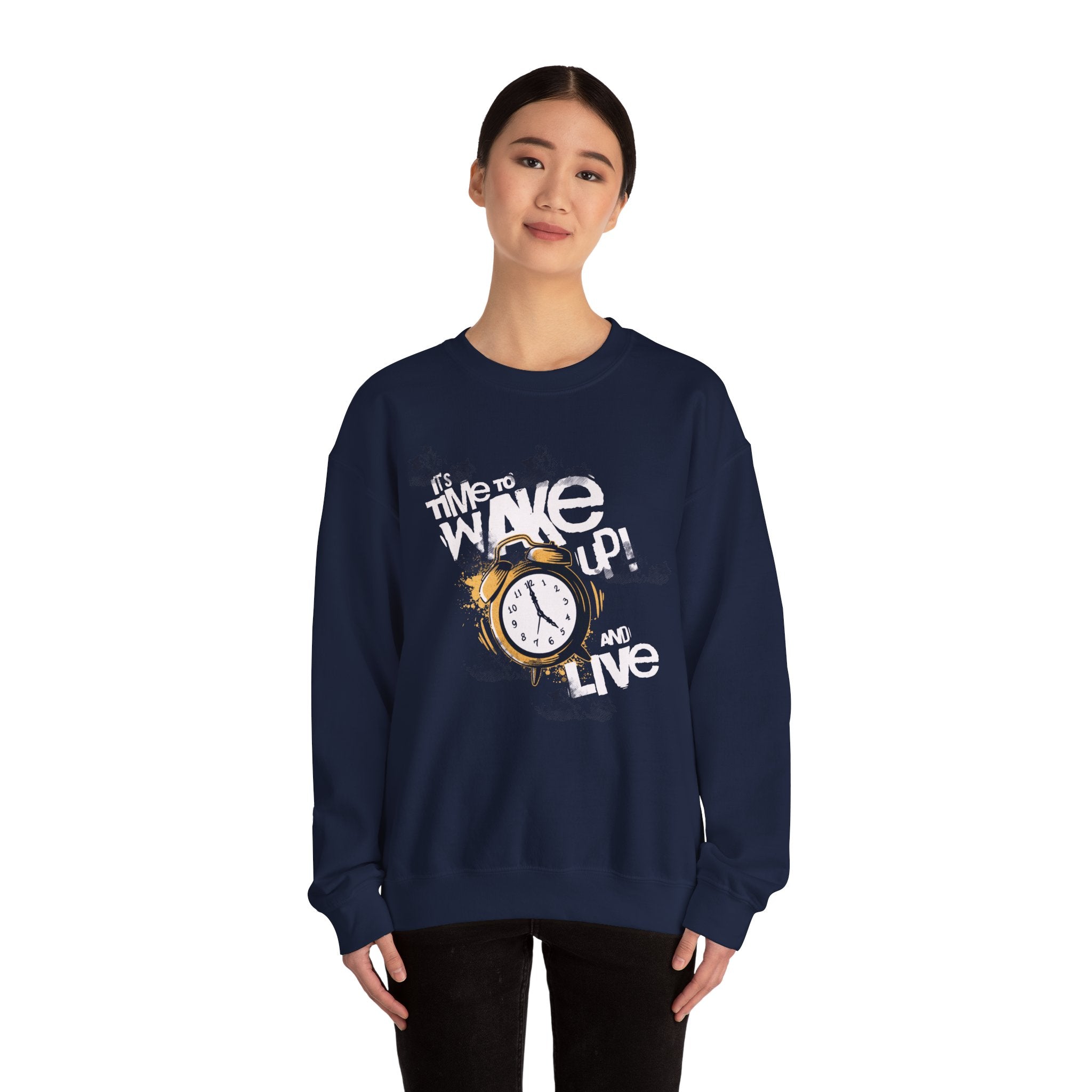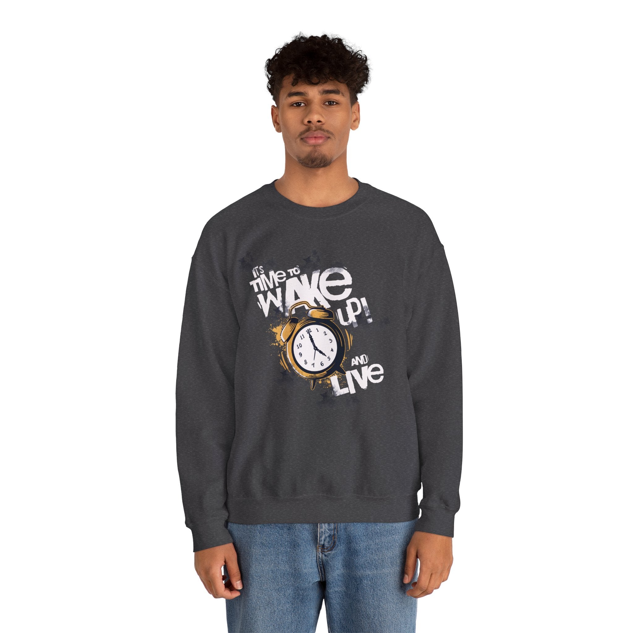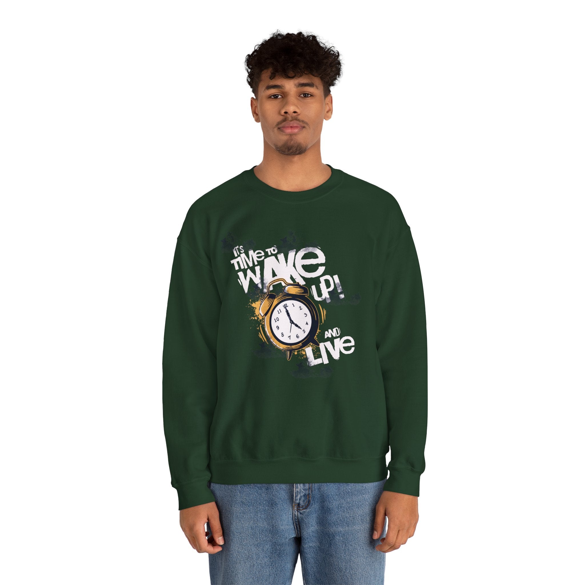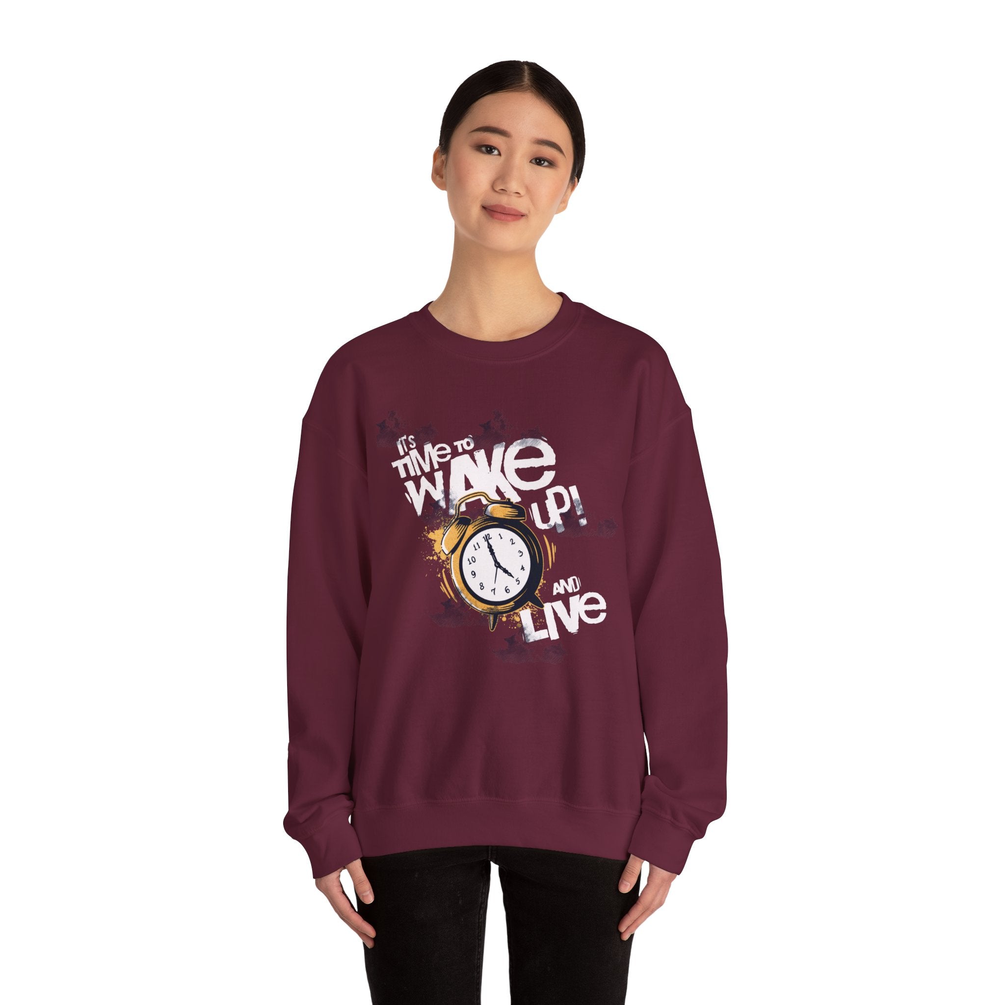 Crewneck Sweatshirt — "Time to Wake Up and Live" Alarm Clock Graphic