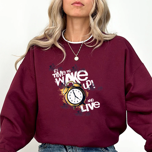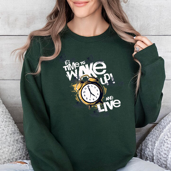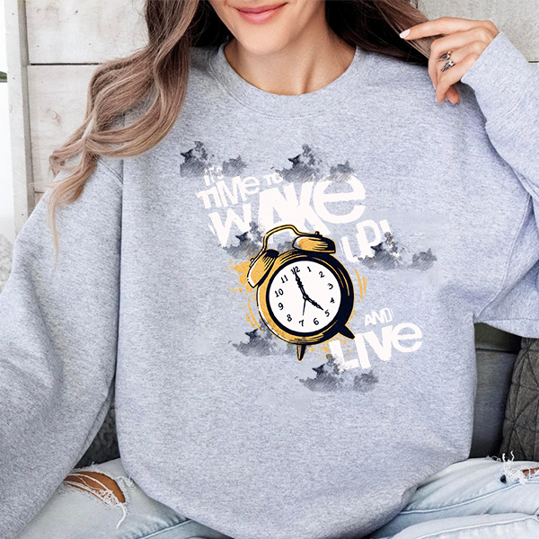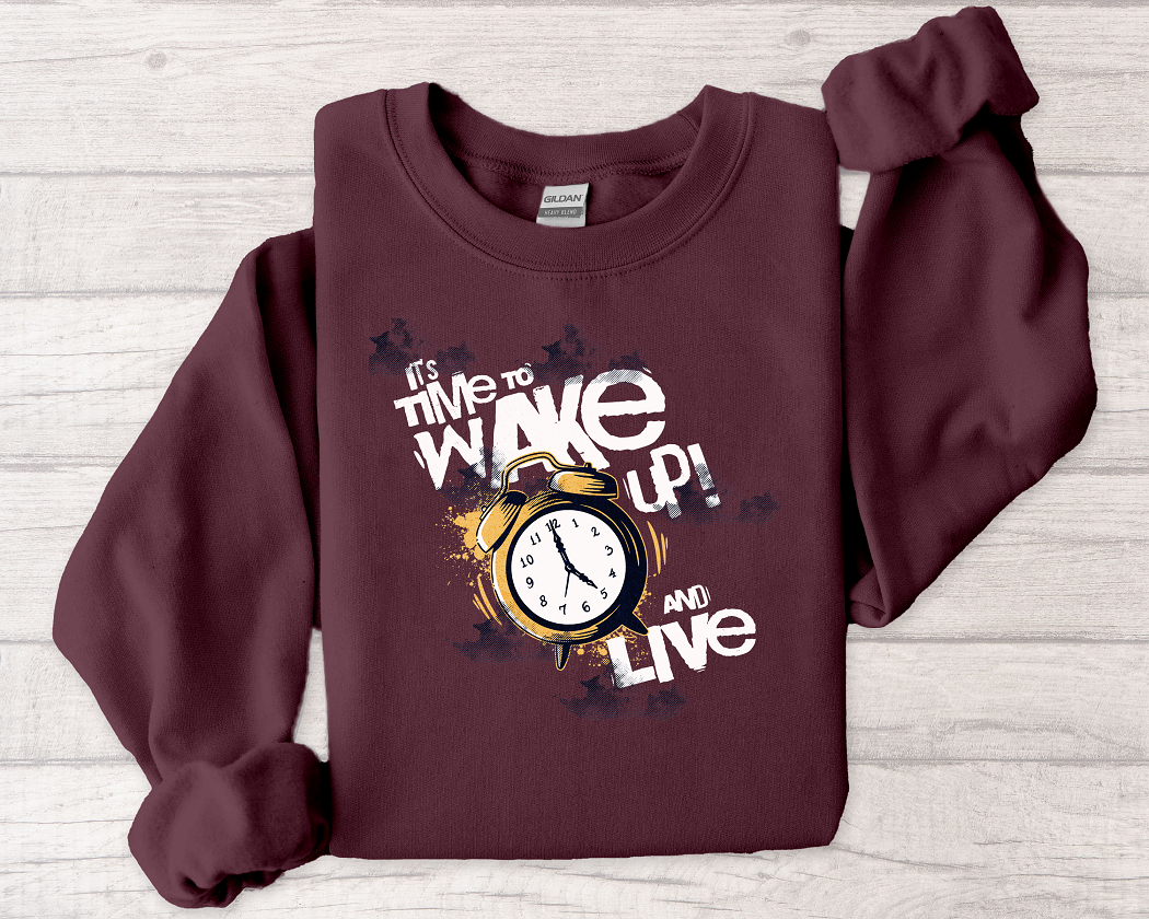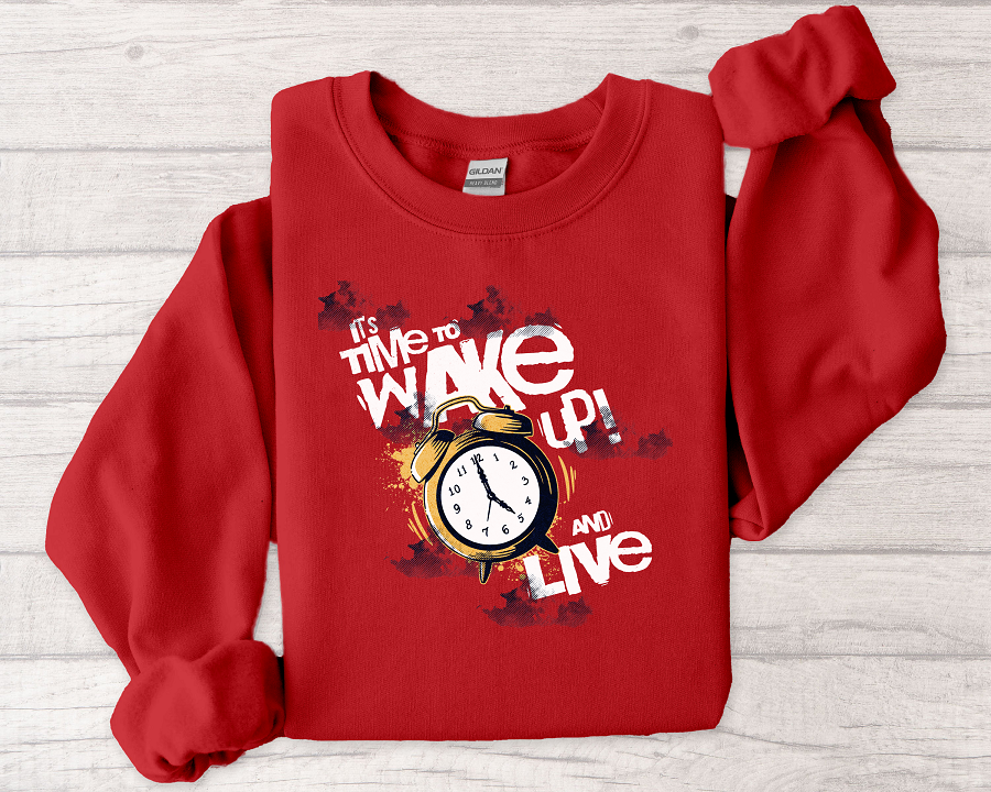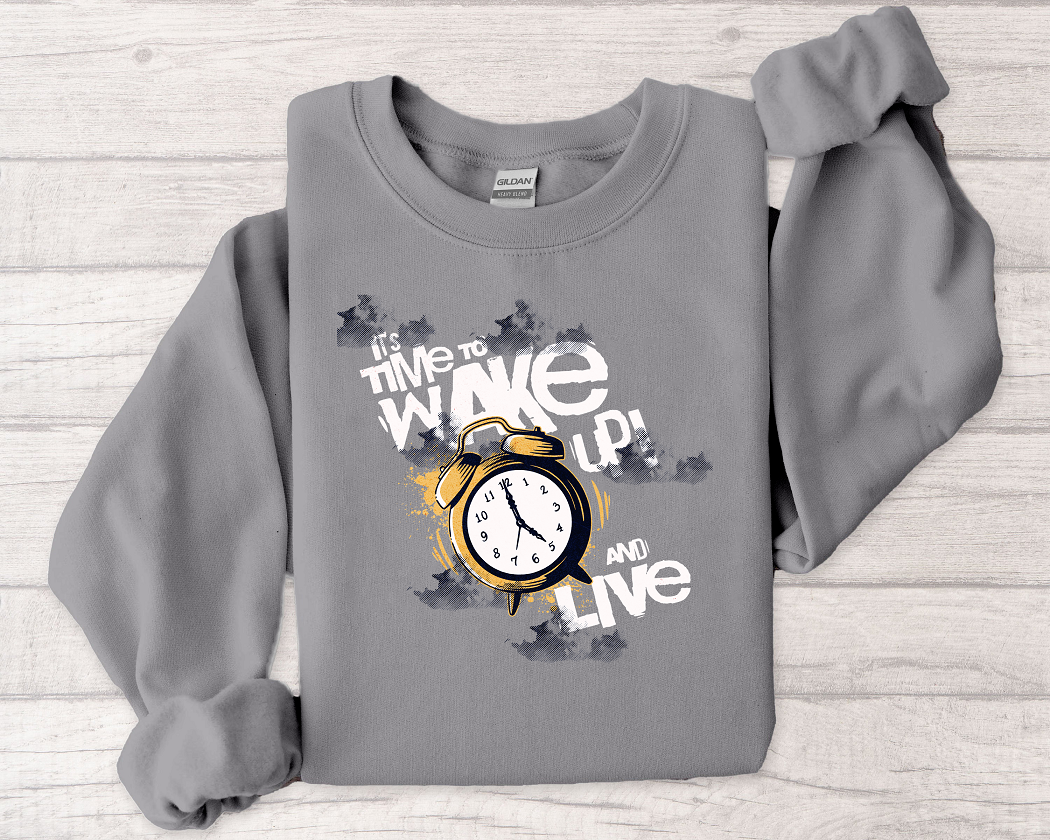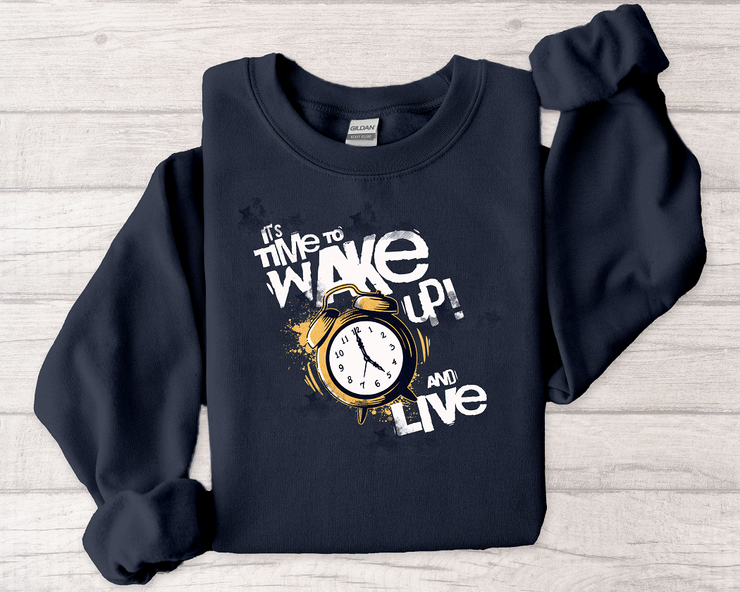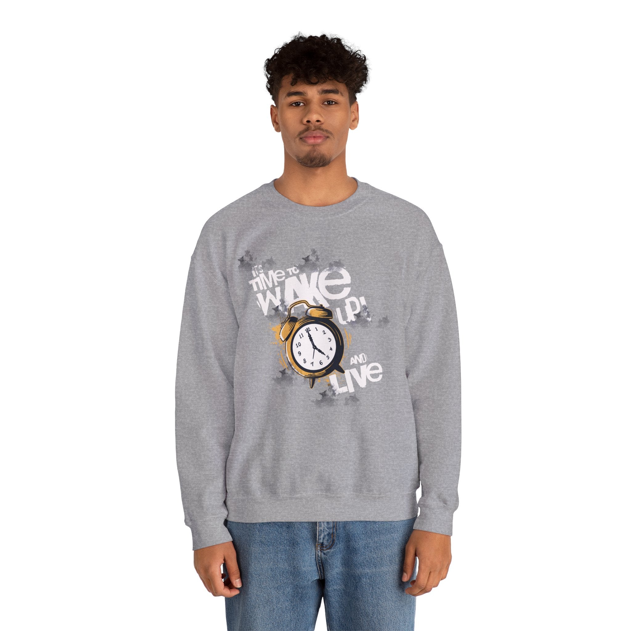Crewneck Sweatshirt — "Time to Wake Up and Live" Alarm Clock Graphic