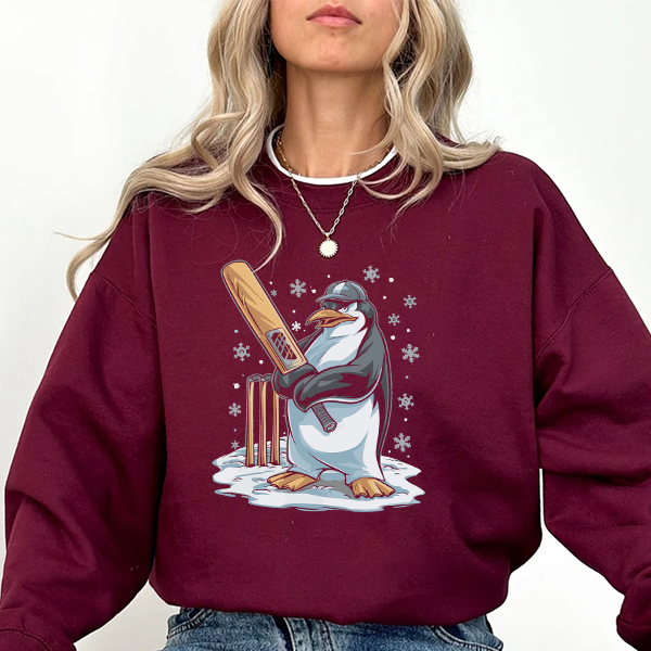 Slide into something warm that feels like a front-row seat at a winter match. This midweight crew features a spirited penguin batter, helmet on, bat raised and snowflakes falling around the crease of the stumps. It reads playful and proud — a nod to chilly mornings, backyard nets, and the kind of teammates who laugh through numb fingers. Wear it after an early practice, layered for a chilly commute, or curled up with a hot drink while watching highlights — it carries a sporty, cozy energy that lands with fans of cricket, winter sports, and anyone who likes a bit of character in their cold-weather layers.