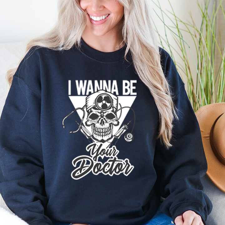 This cozy crewneck sweatshirt blends comfort with bold attitude. The black, medium-heavy fabric holds a high-contrast white graphic: a skull wearing a surgeon’s headlamp, flanked by a stethoscope and medical motifs, with the playful slogan “I Wanna Be Your Doctor.” It feels like the kind of layer you pull on after a long shift or wear to a casual meetup with coworkers, warm, durable, and unapologetically edgy. The relaxed, classic fit and ribbed collar keep the silhouette familiar and easy to move in, while the reinforced stitching and soft tear-away label make it a reliable go-to for everyday wear.