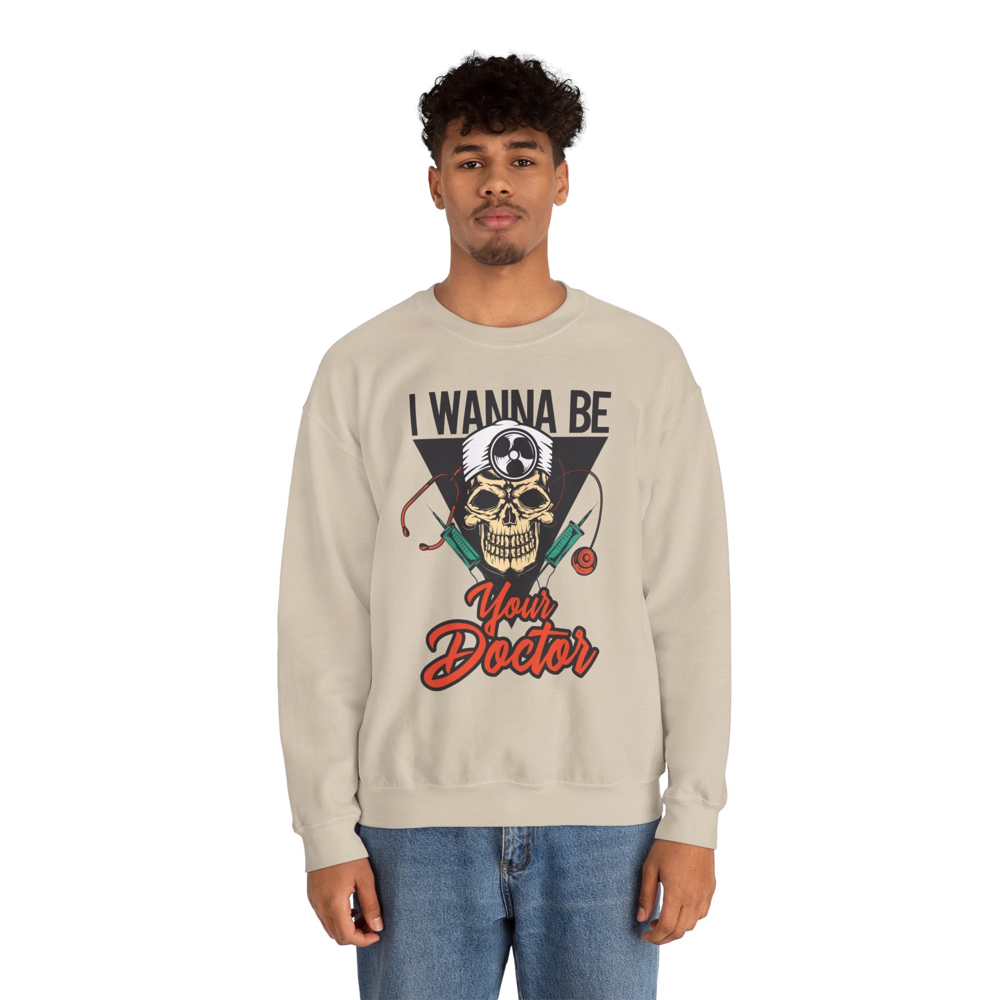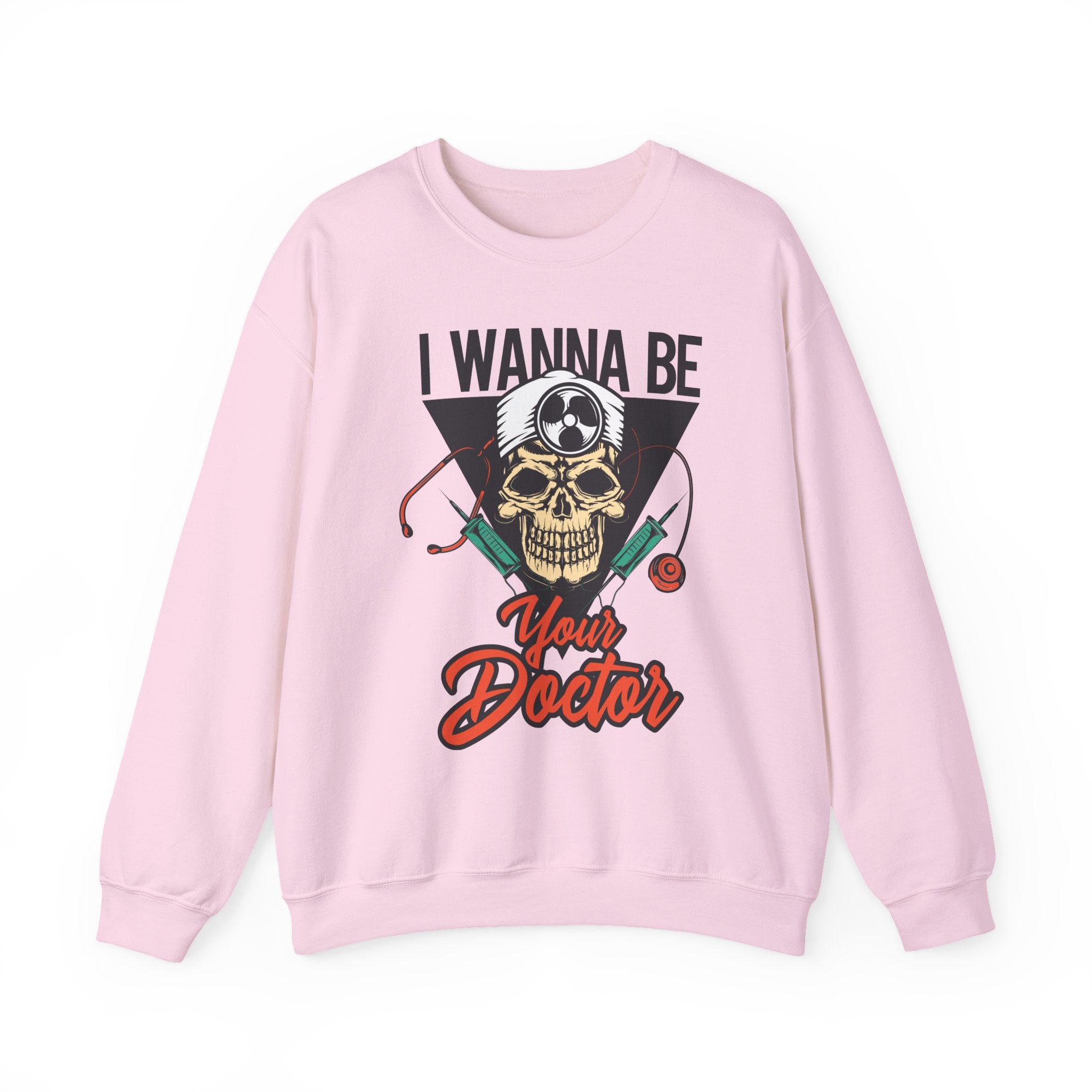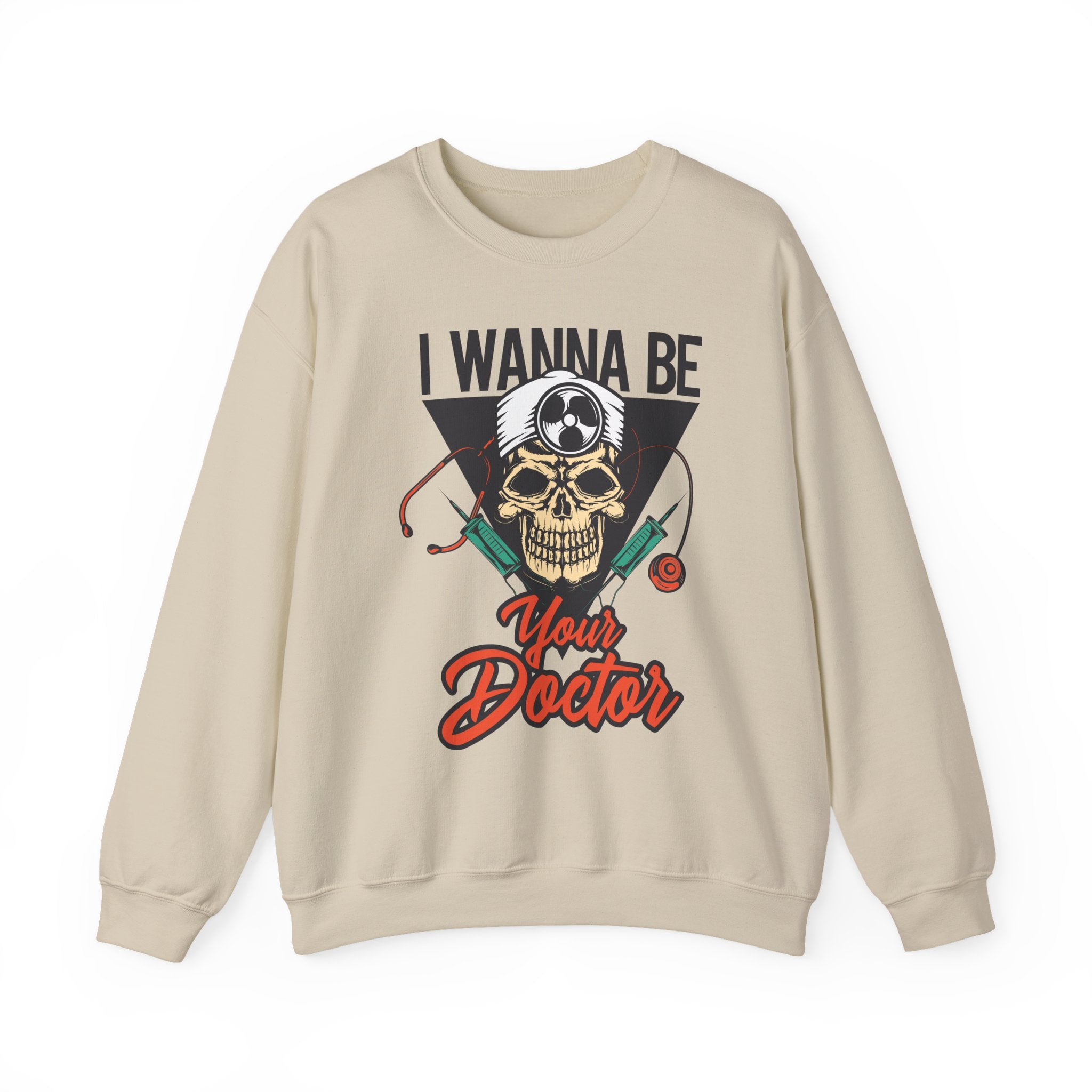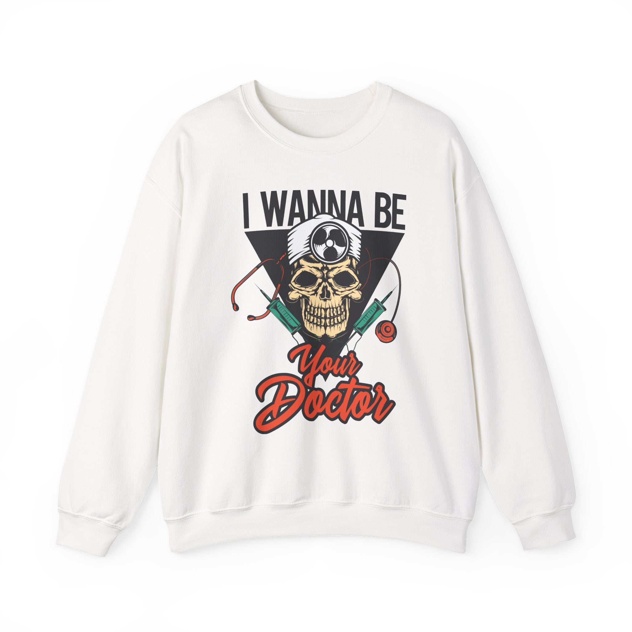 A cozy, statement-making crewneck that blends medical dark-humor with everyday comfort. Soft yet sturdy, this sweatshirt features a bold front illustration—a skull wearing a doctor’s headlamp framed by syringes and a stethoscope—set against a vintage-style triangle and bold script reading “I Wanna Be Your Doctor.” The medium-heavy cotton/poly blend and double-needle stitching keep the shape through repeated wear. Minimal seams and a tear-away neck label make it comfortable on long shifts or chill days off. Wear it on late-night study sessions, clinical rotations, or weekend coffee runs to show a playful, edgy side of medical life.