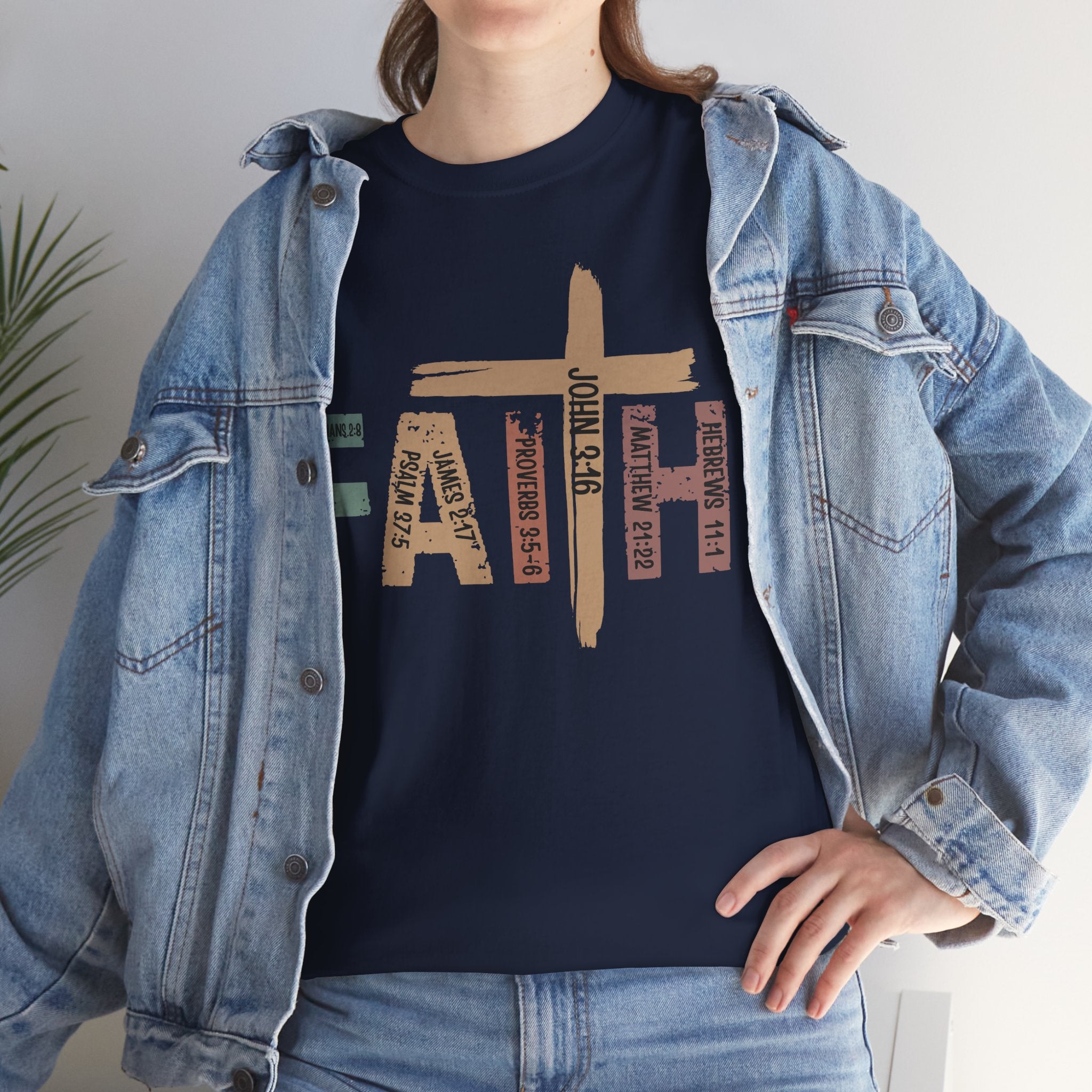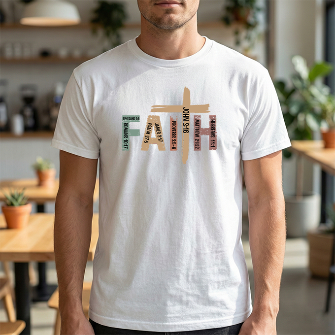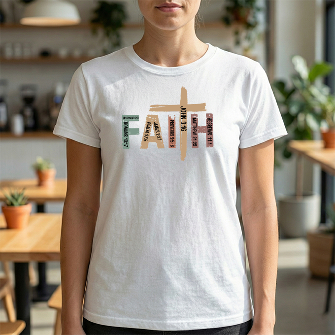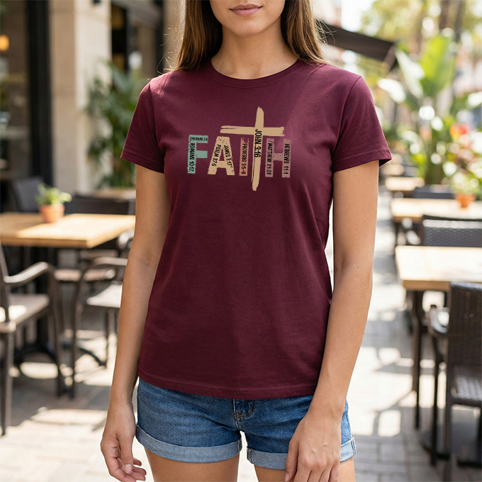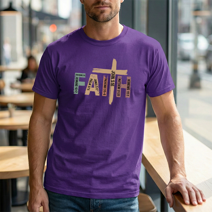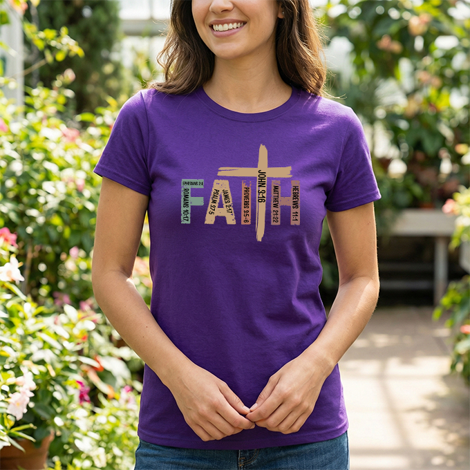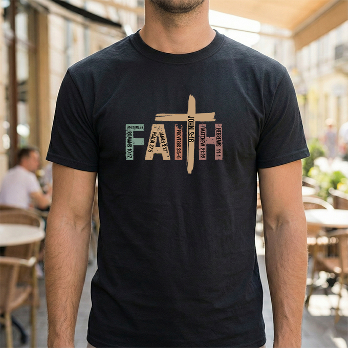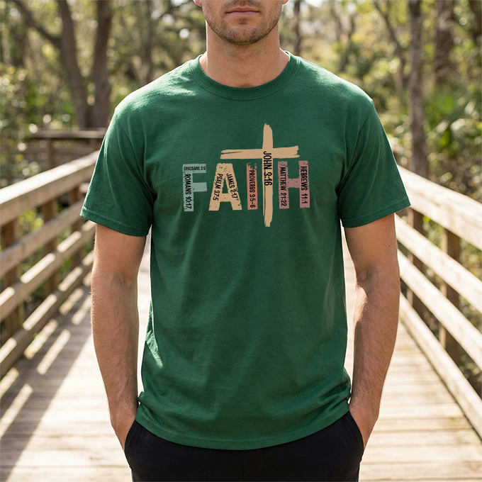 This soft, classic-fit tee carries a quiet, confident message: FAITH, formed from textured, earthy letter art with a cross subtly integrated into the design. The medium-weight cotton feels substantial without being heavy, holding its shape and print detail wash after wash. Wear it to church services, volunteer events, or on slow Sunday mornings — it settles into your wardrobe like a familiar hymn, comfortable and steady. The crew neck and relaxed cut make layering easy under jackets or over long sleeves. The distressed, nature-inspired palette gives the shirt a lived-in, authentic look that complements denim, cargos, or a simple skirt. It’s made with responsibly sourced cotton, crisp printing techniques, and construction details that resist stretching, so the message stays clear and the fit stays true.