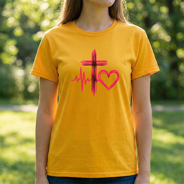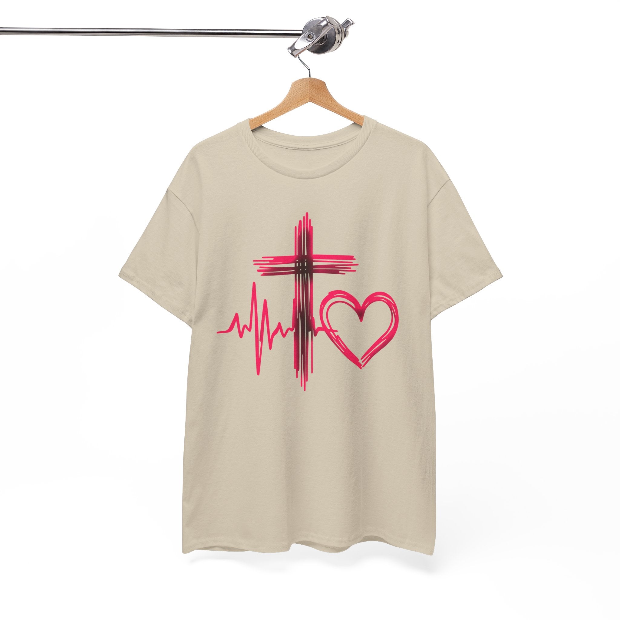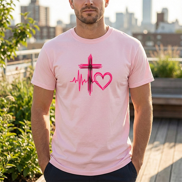 This relaxed-fit tee carries a quiet, soulful message: a brush-stroked cross, a heartbeat line, and a hand-drawn heart in soft rose tones. It feels like a gentle declaration of faith and love — worn on mornings when you want a simple reminder of hope, or layered under a jacket for church Sunday and weekday errands alike. The design reads like a sketch from a thoughtful journal: unpolished edges, warm color, and a human hand behind every stroke. It sits comfortably in everyday life, whether you’re volunteering, meeting friends for coffee, or pausing for a moment of prayer. The shirt’s classic crew neck and roomy cut make it easy to move in; the muted pink-red artwork keeps the look tender without shouting. This is for people who prefer quiet symbols of belief and compassion woven into their daily wear.