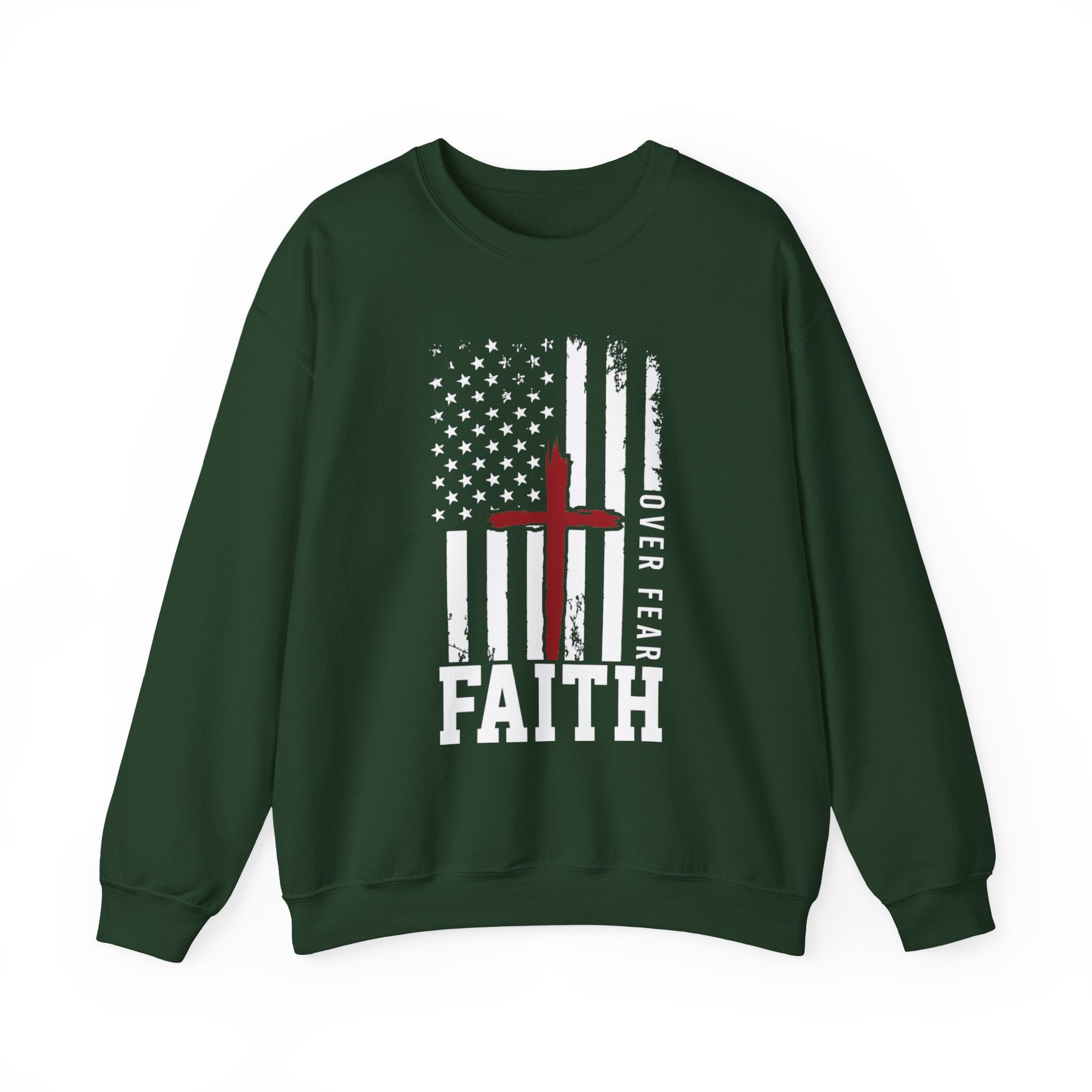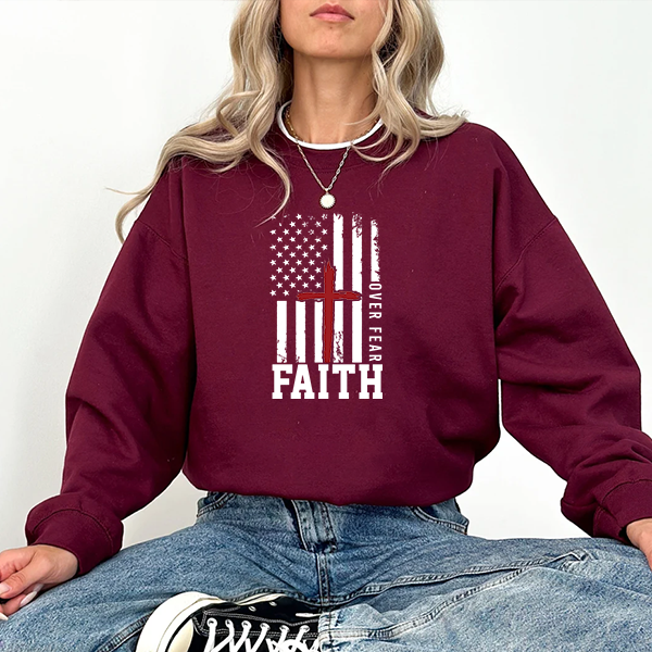 Faith Over Fear Crewneck Sweatshirt — Christian American Flag Cross Design