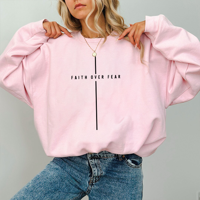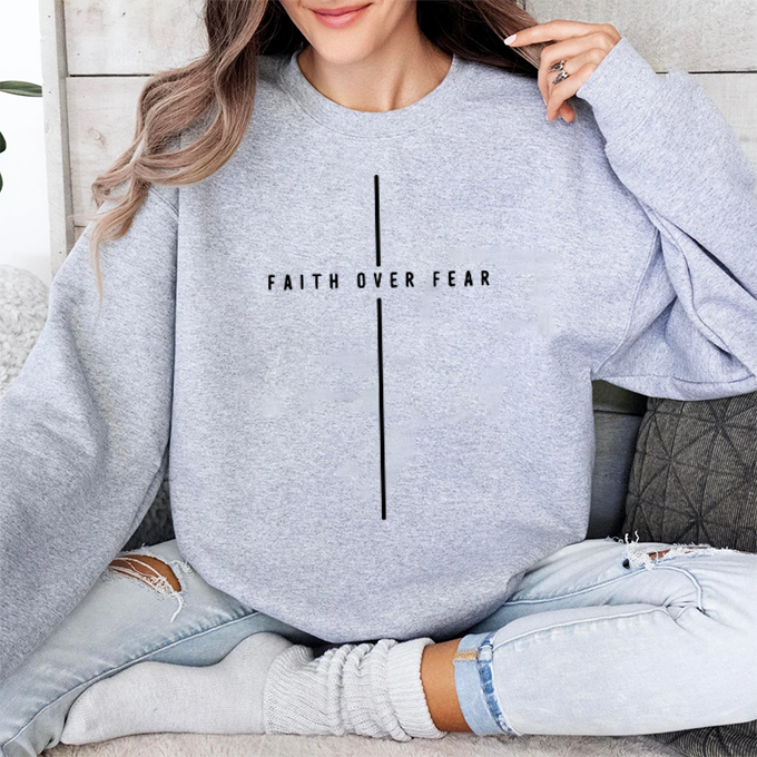 A soft, mid-weight crewneck that reads like a quiet declaration. This sweatshirt pairs a clean, minimal cross motif with the understated wording “FAITH OVER FEAR,” letting your conviction speak without shouting. The classic crew fit and ribbed neckline create a familiar, comfortable silhouette you’ll reach for on slow mornings, church gatherings, or evening walks. Subtle details — tear-away label, durable double-needle stitching, and ethically sourced cotton — keep the focus on comfort and longevity. Wear it layered over a tee or under a coat; it settles into everyday life while holding a calm, hopeful message.
