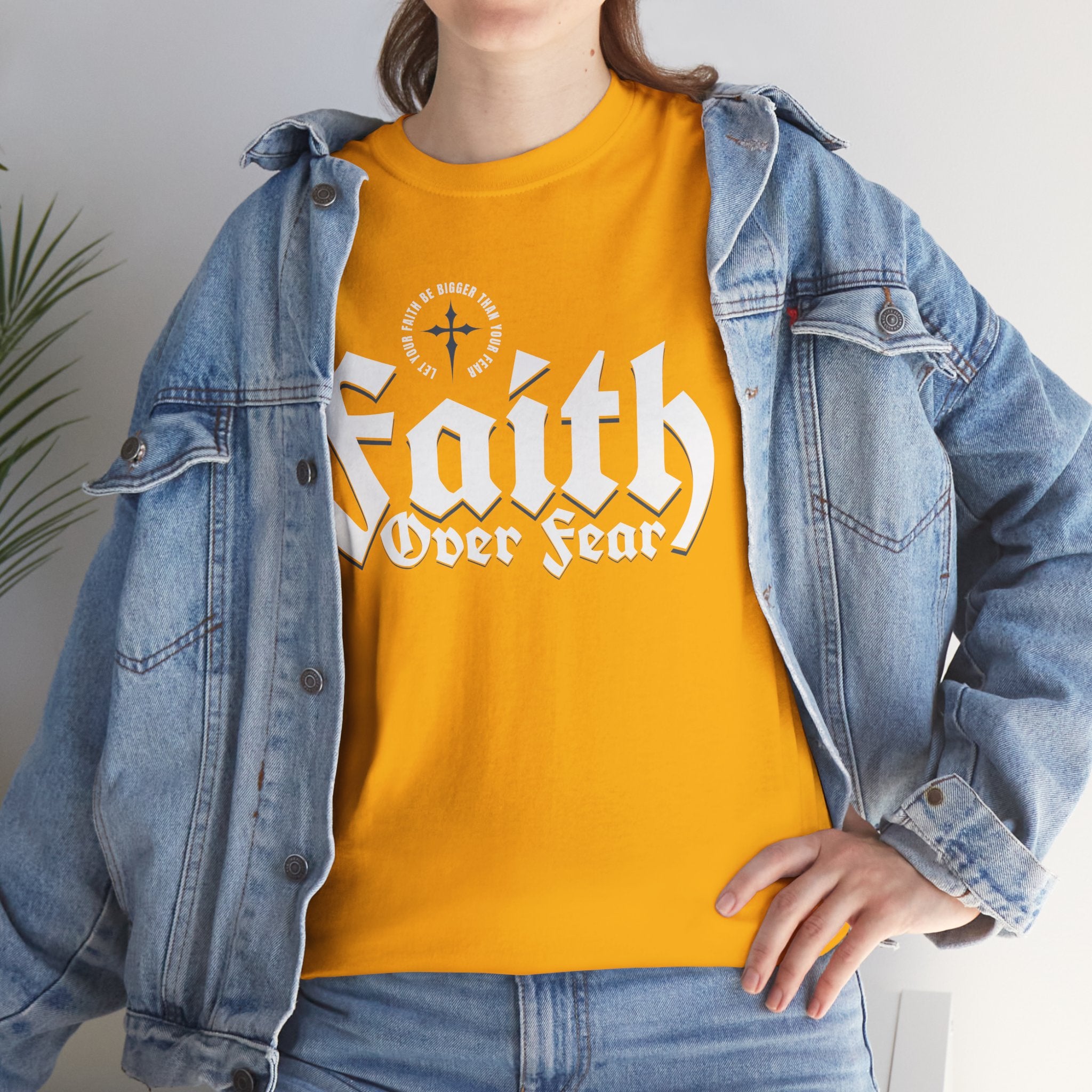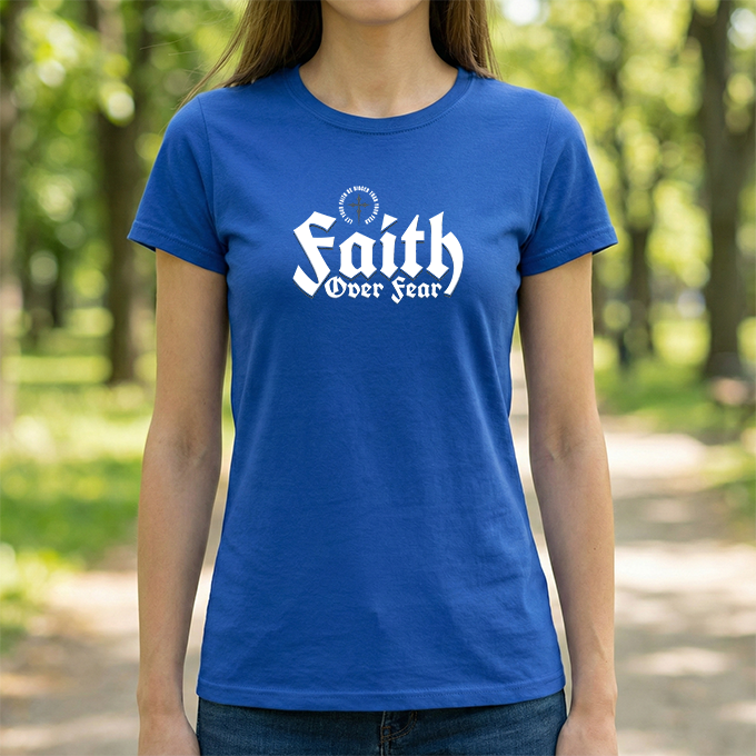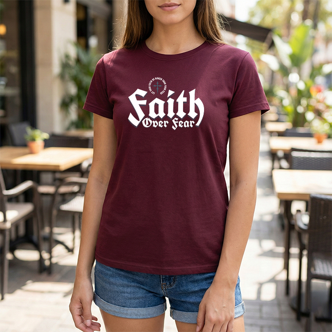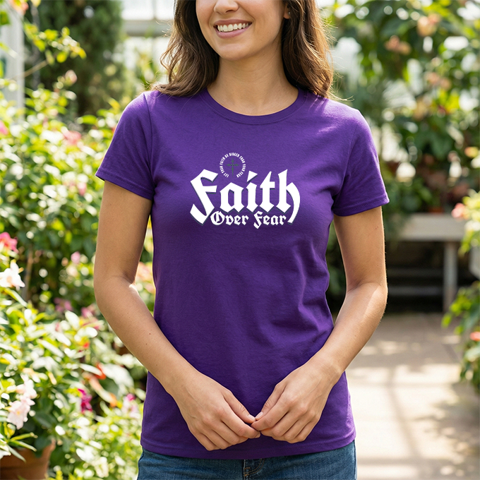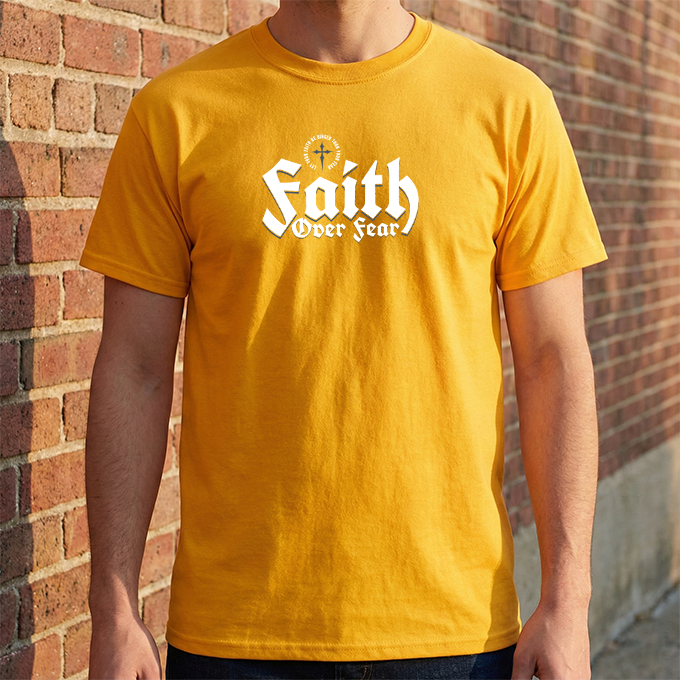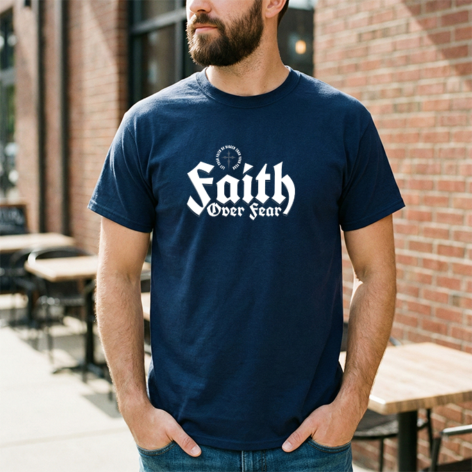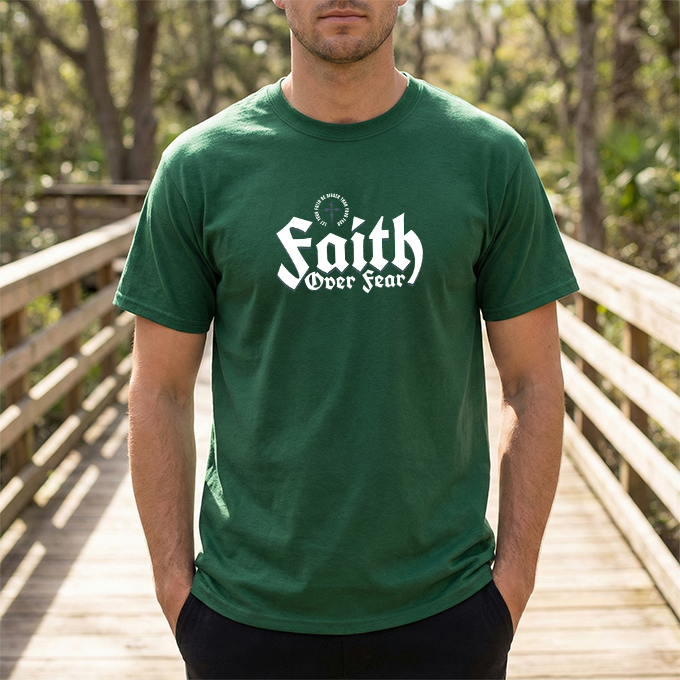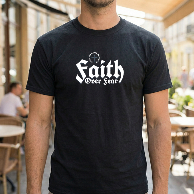 A sturdy, everyday tee with a bold message: 'Faith Over Fear' rendered in strong, slightly vintage lettering across the chest. The black shirt gives the white print high contrast, making the statement visible from across a room. Short sentences and purposeful details: it feels like the kind of shirt you reach for when you want to show quiet conviction — on a morning commute, at a small group, or while volunteering. The fabric has a solid, reassuring weight and a classic crew neckline that sits cleanly under jackets or overlayers. It settles into the wardrobe quickly, pairing easily with jeans, joggers, or a layered flannel. Wear it to church meetups, casual nights out, or times when you need a simple reminder to choose courage over doubt.
