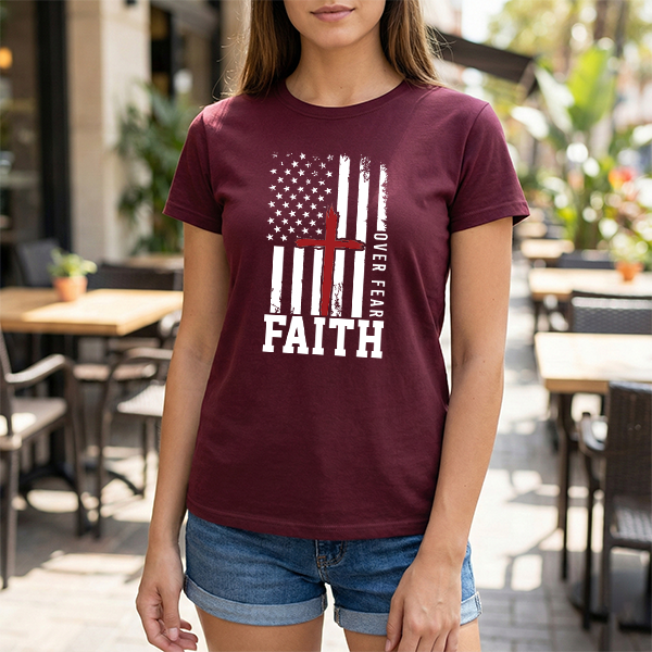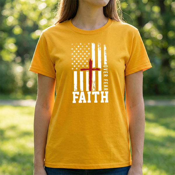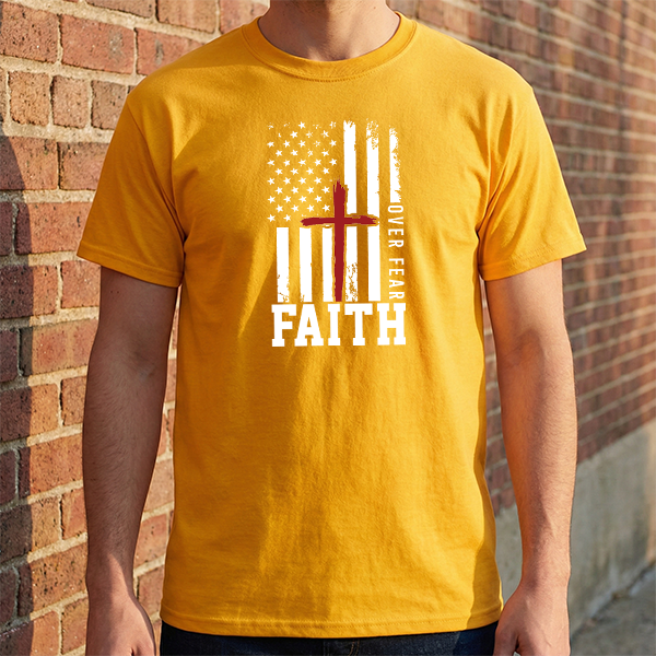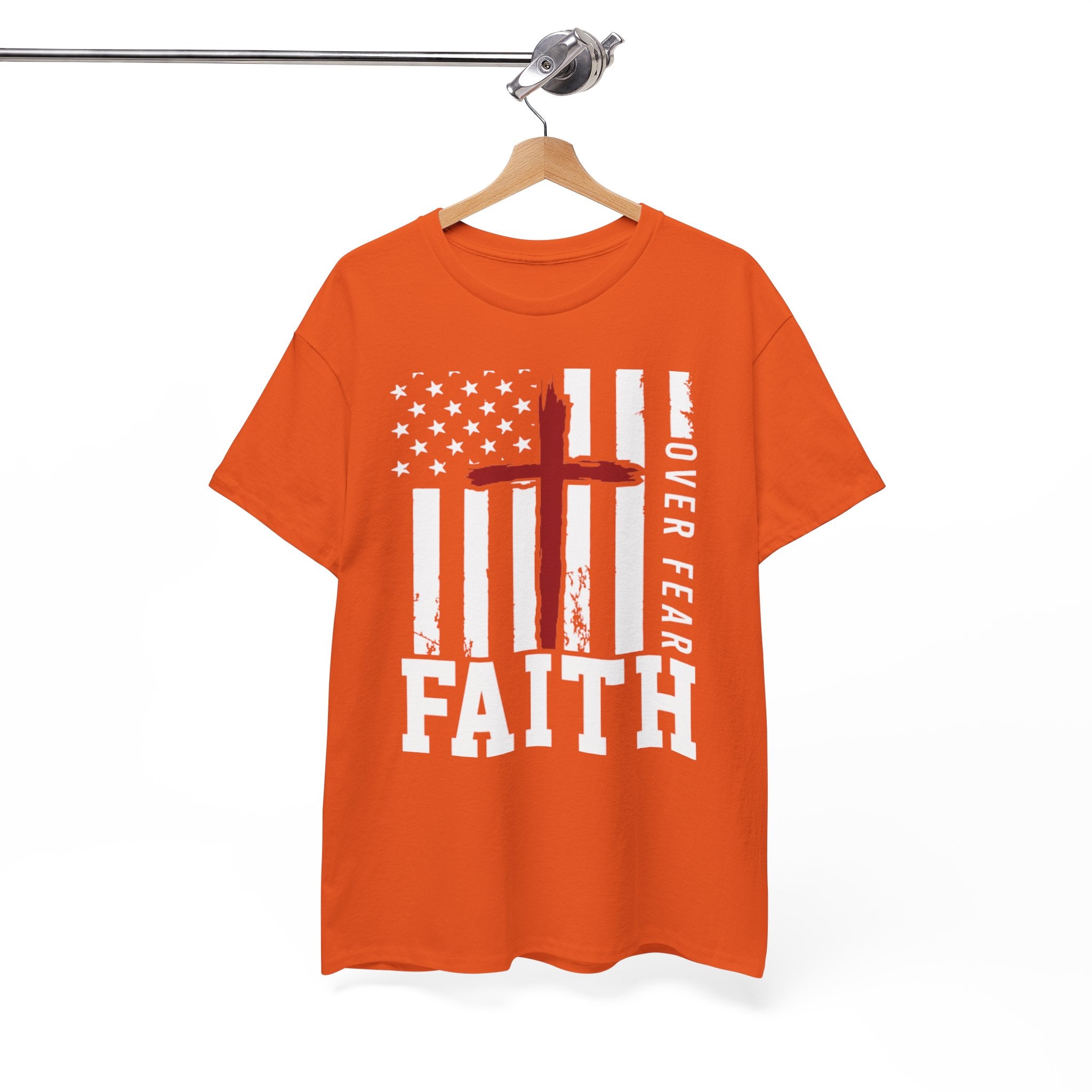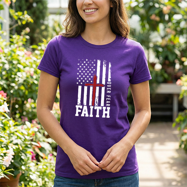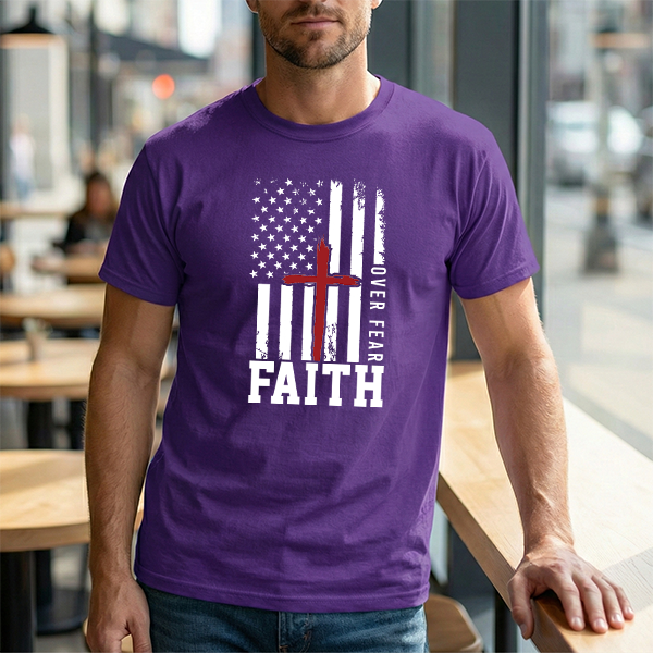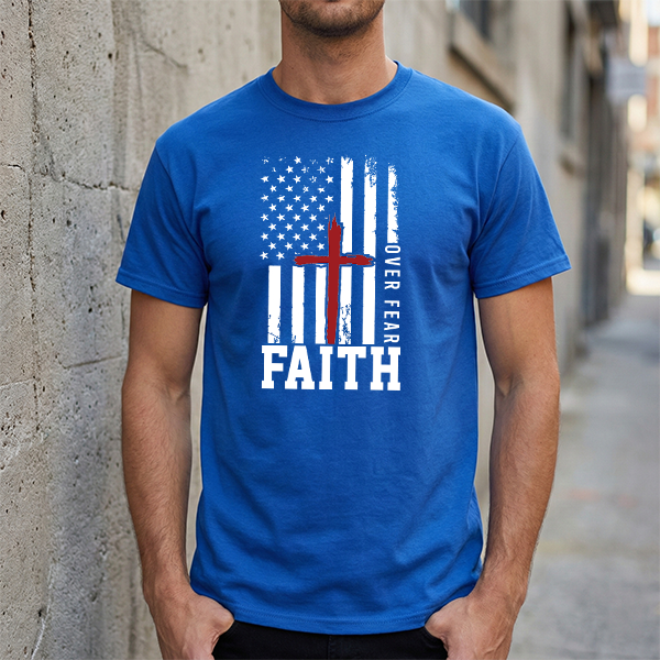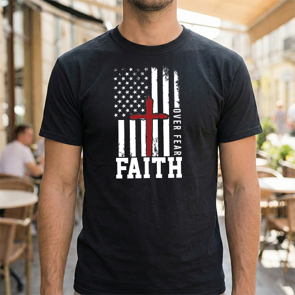 Carry quiet courage into the day with this faith-themed tee. A distressed American flag forms the backdrop while a bold red cross stands steady at the center, the words FAITH and OVER FEAR anchoring the message. It feels like a walk of conviction—simple, honest, and steady—meant for someone who lives out belief rather than shouts it. Wear it to church gatherings, volunteer days, community meet-ups, or when you want a subtle reminder to choose trust over worry. The graphic reads like a worn banner: lived-in, authentic, and rooted in hope.