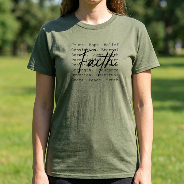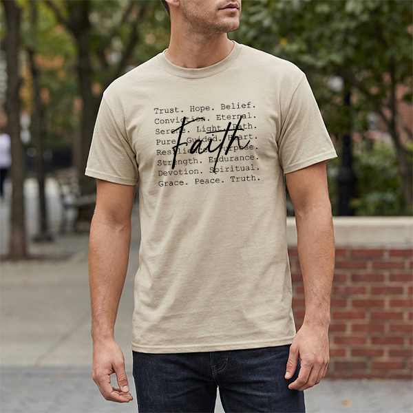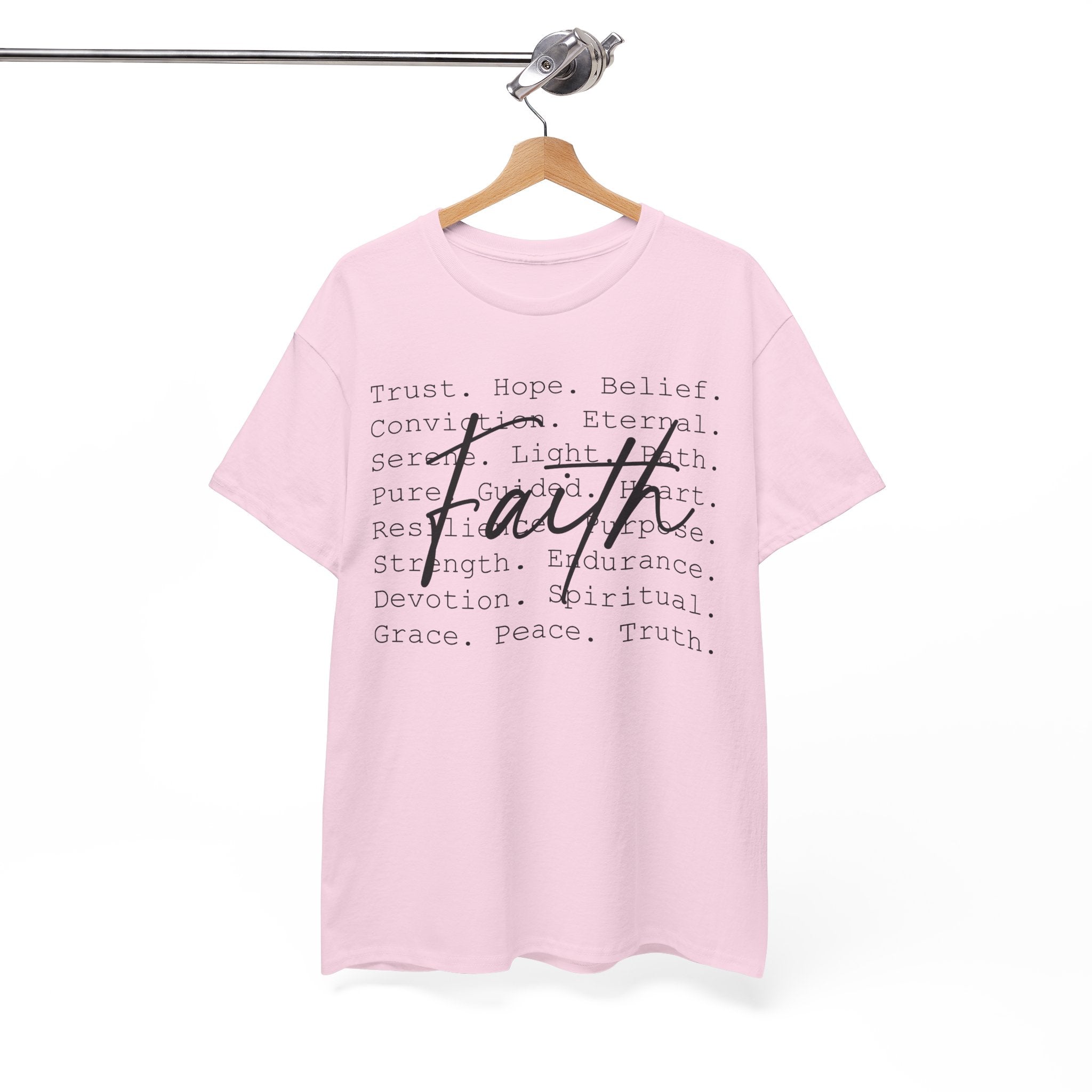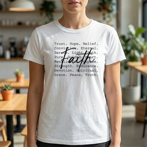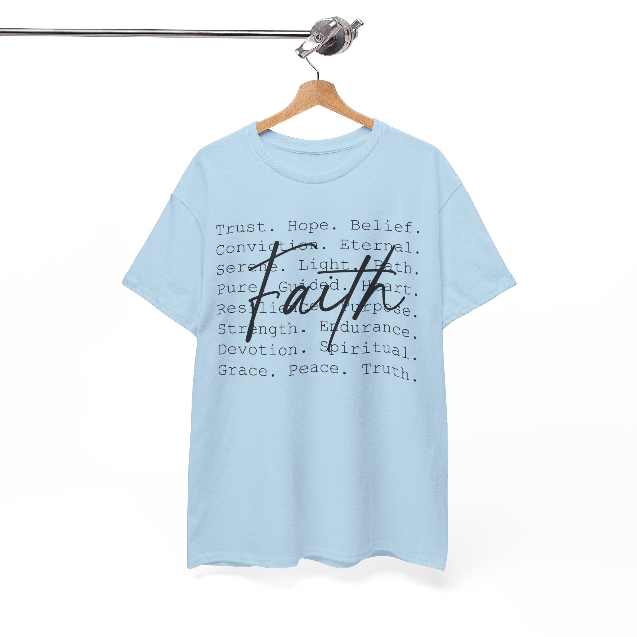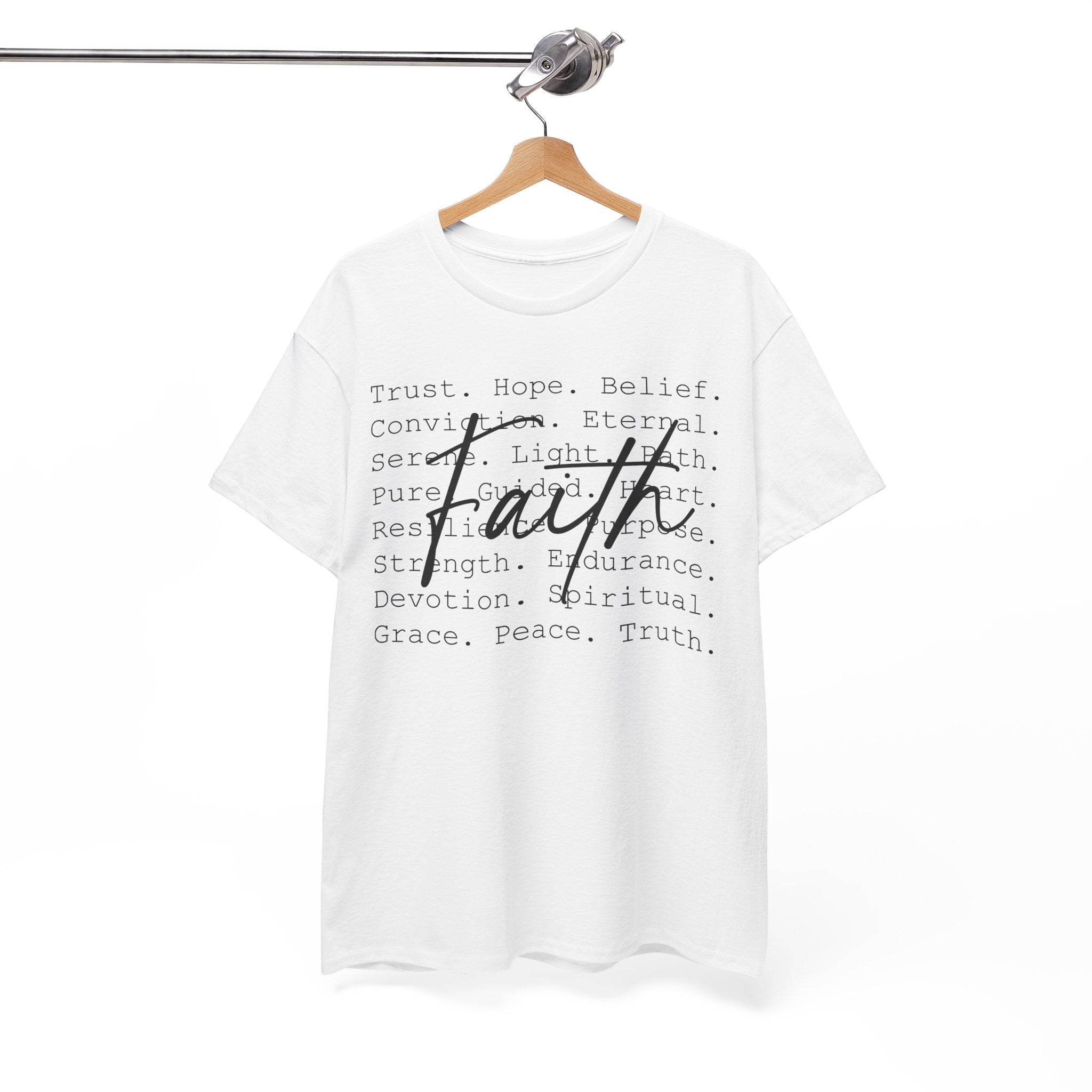 Faith Words T‑Shirt — Inspirational Christian Tee with 'Faith' Script and Motivational Background Text