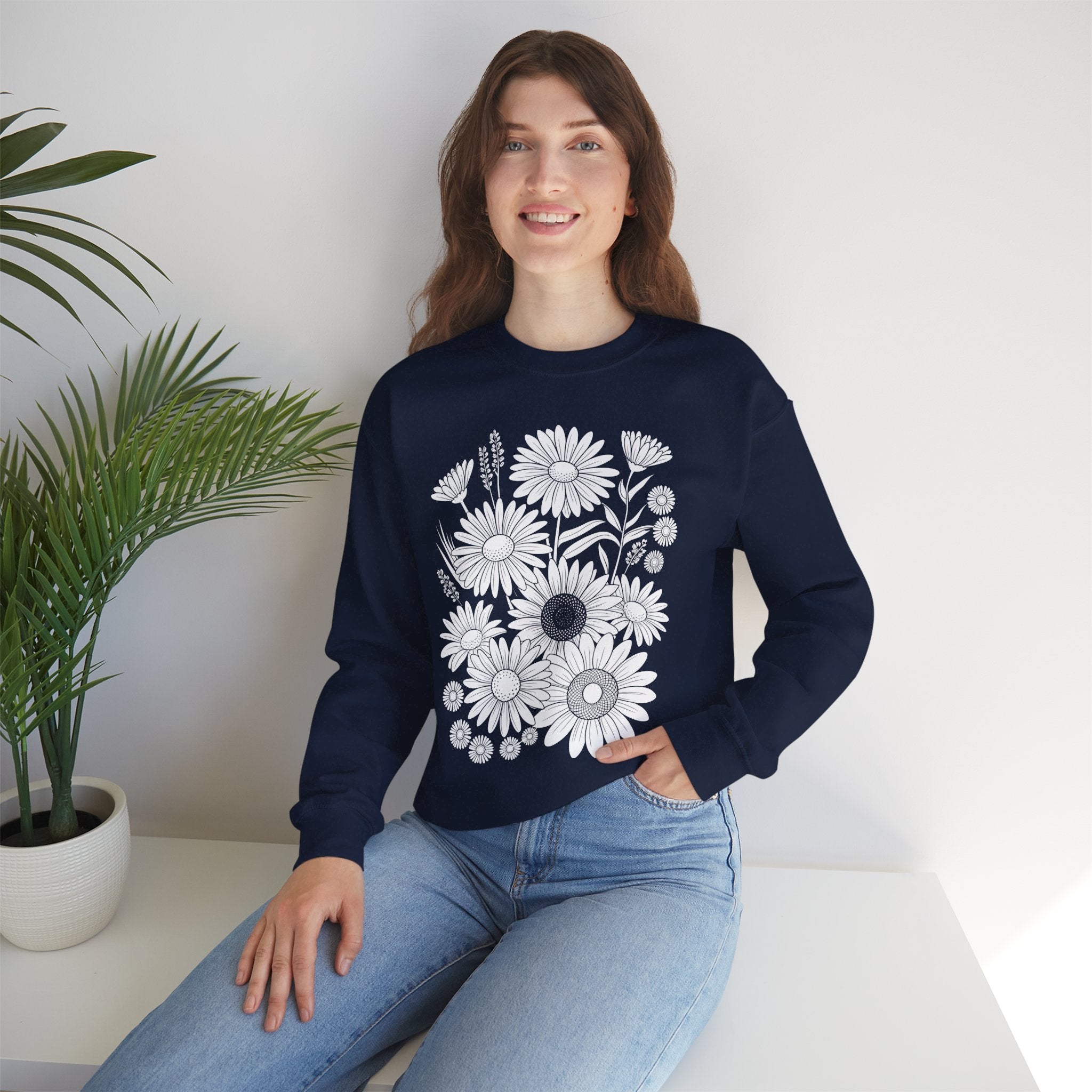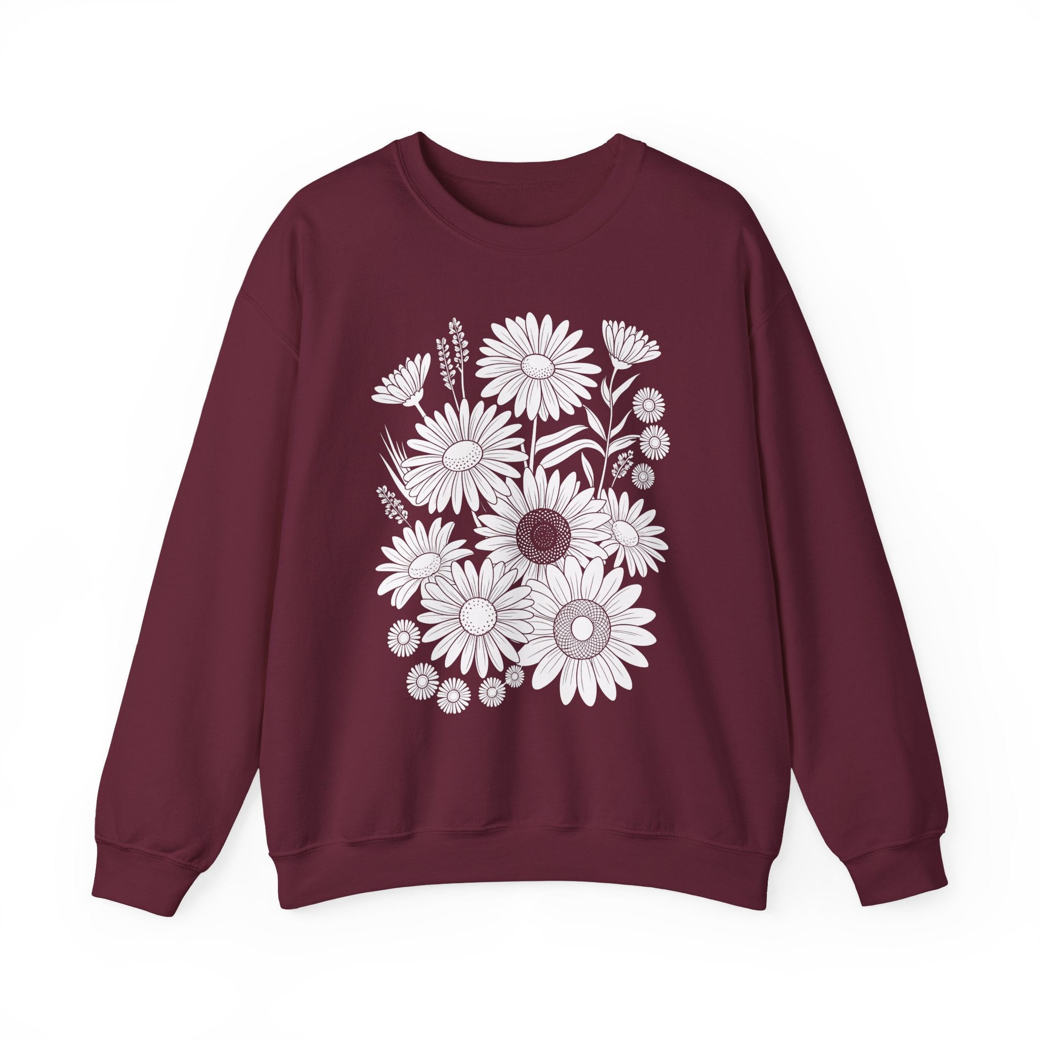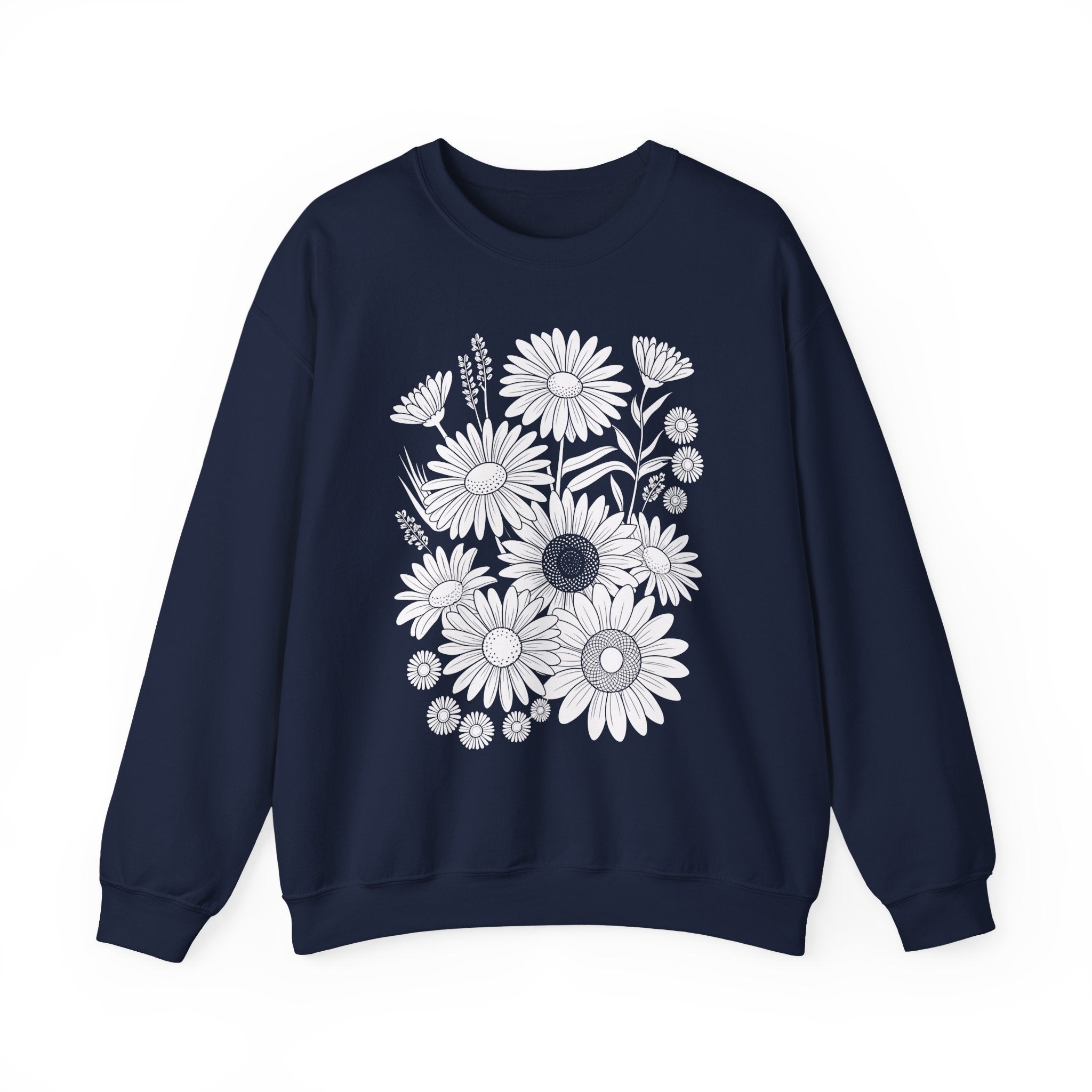 Soft, roomy, and quietly bold — this sweatshirt pairs cozy everyday wear with a hand-drawn meadow of daisies printed in crisp monochrome. The medium-heavy cotton-poly blend holds shape and warmth without feeling bulky. Wear it on cool mornings with jeans and a beanie, or layer it over a dress for an unexpected, artsy contrast. The floral illustration reads modern and slightly nostalgic, an easy piece for people who like low-key nature motifs with a graphic edge.