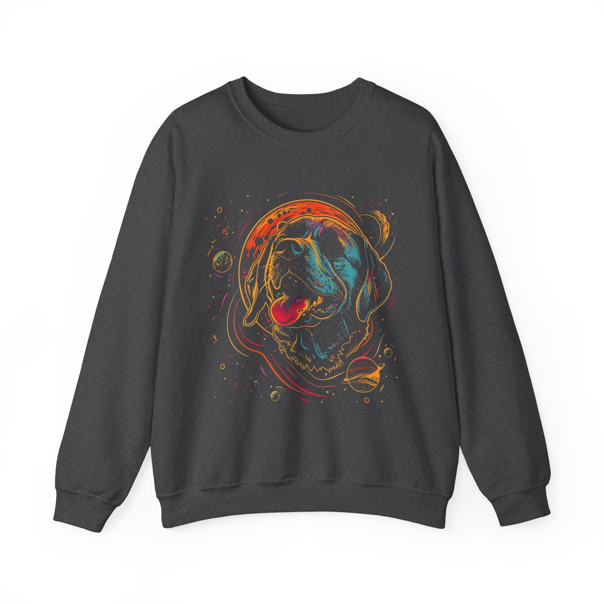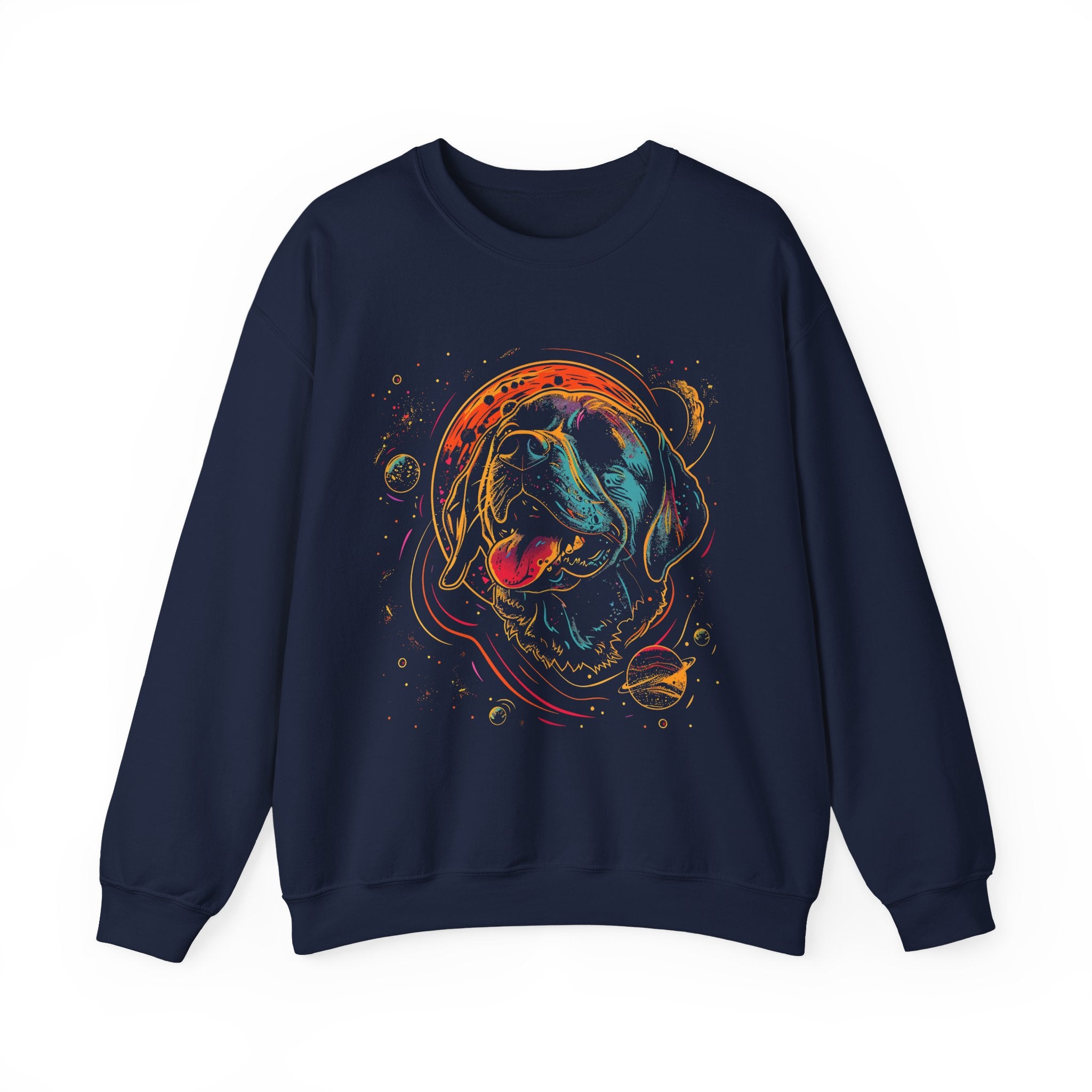 This cozy crewneck brings playful color and cosmic charm to everyday wear. A vibrant, neon-style dog portrait floats inside a swirling, planet-speckled halo — cheerful and a little wild. The medium-heavy cotton-poly blend and classic crew fit create a warm, reliable layer for cool mornings, evenings by the fire, or relaxed weekends. Durable double-needle stitching and tear-away label keep it comfortable season after season. Wear it while walking the dog, meeting friends at a café, or curled up with a good movie — it reads like a friendly conversation starter and a bright spot in your wardrobe.