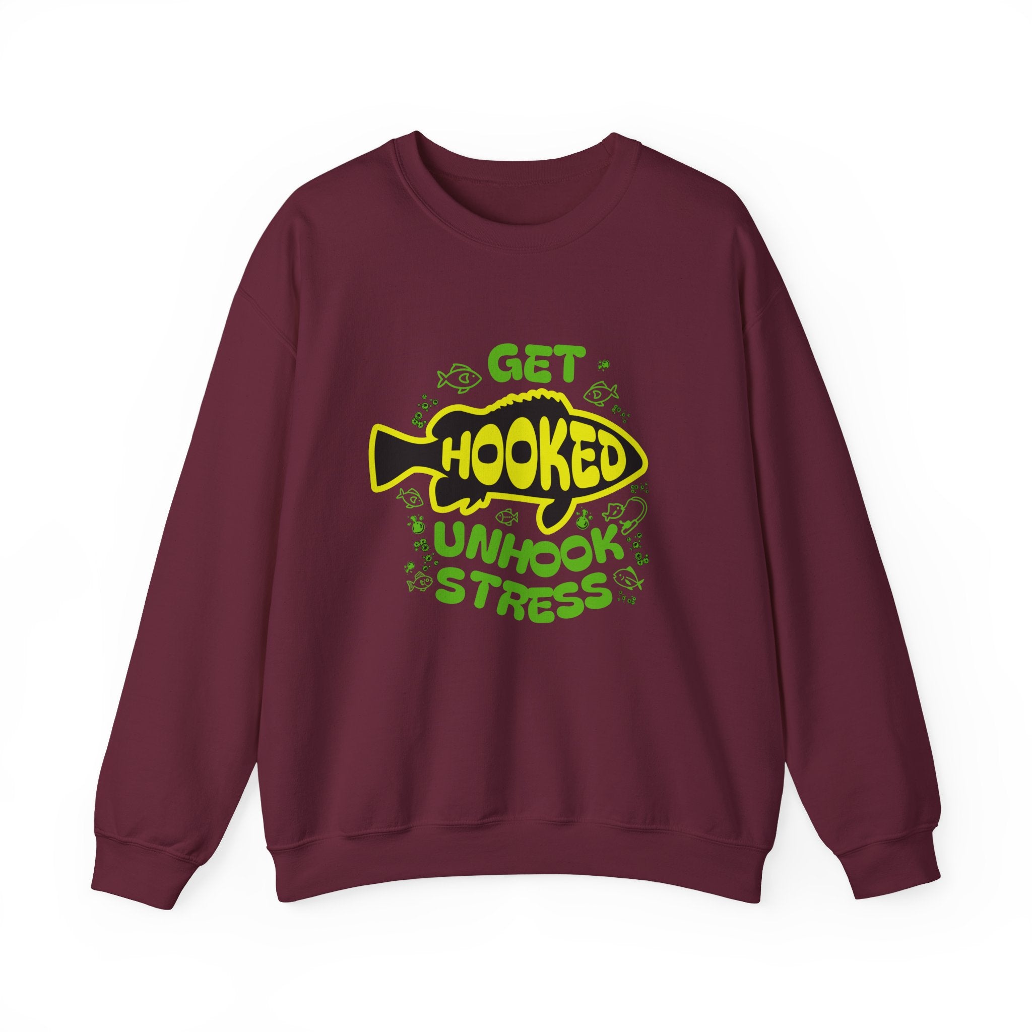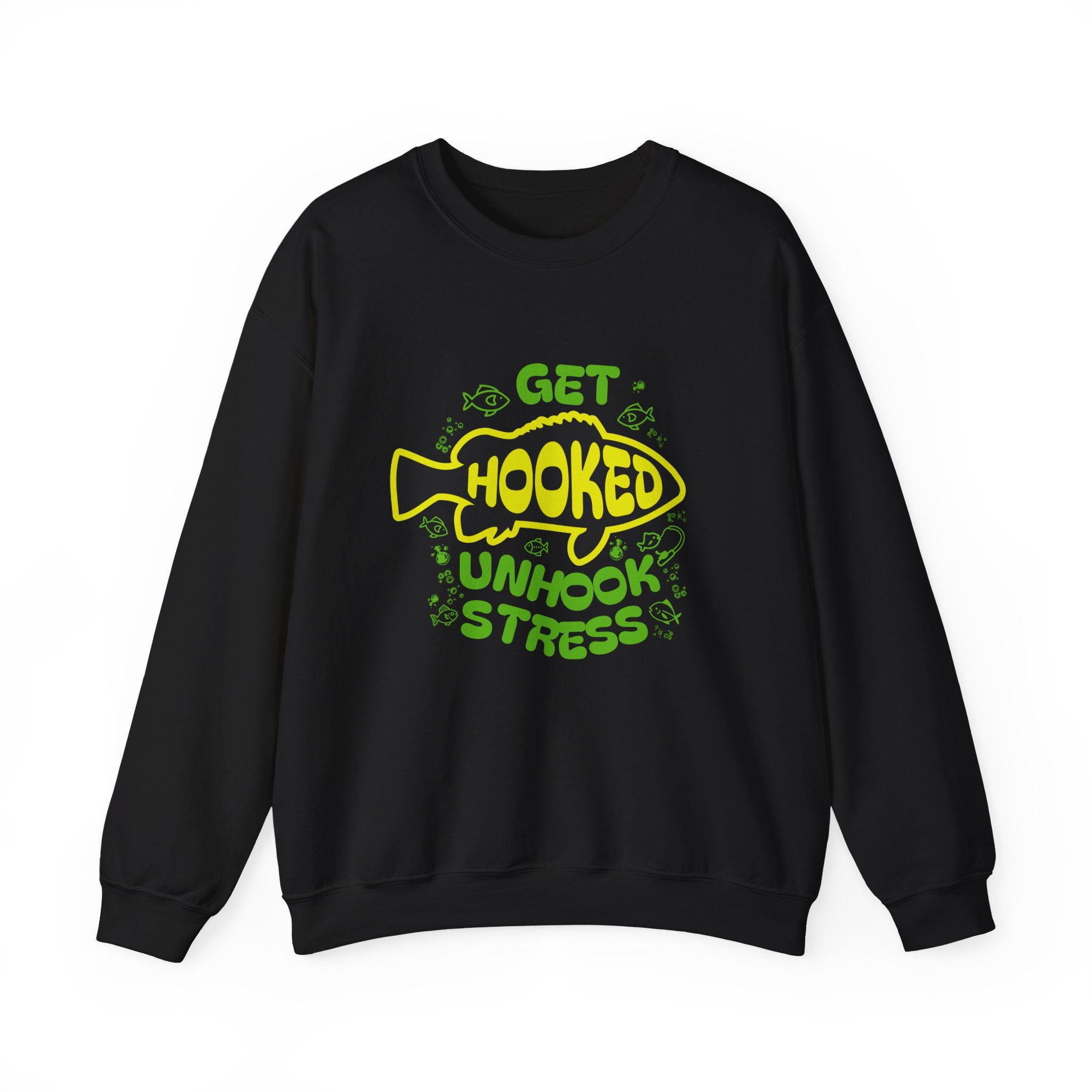 Cast a line, breathe out, and let the calm roll in. This cozy crewneck carries a playful fishing graphic—bold yellow and green lettering shaped around a smiling fish—that reads “Get Hooked, Unhook Stress.” It sits on a medium-heavy cotton-poly blend that feels substantial without weighing you down. Wear it on chilly mornings by the lake, on slow weekends at home, or while swapping stories with fellow anglers. The clean crew neckline and classic fit keep the look relaxed and easy to layer. Embroidered or printed accents can be placed on the chest or wrists for a personalized touch. Built to last with double-needle stitching and OEKO-TEX–safe dyes, it’s a sweatshirt made for slow moments and steady company.