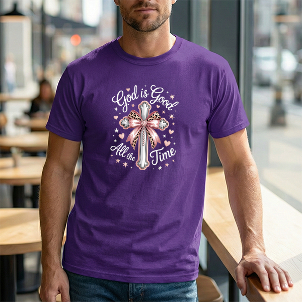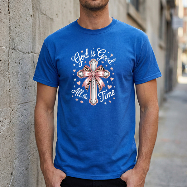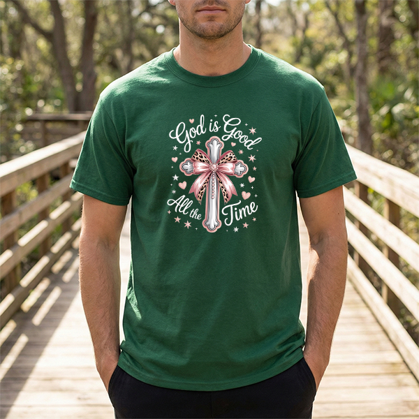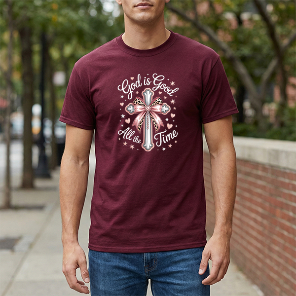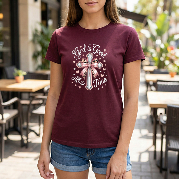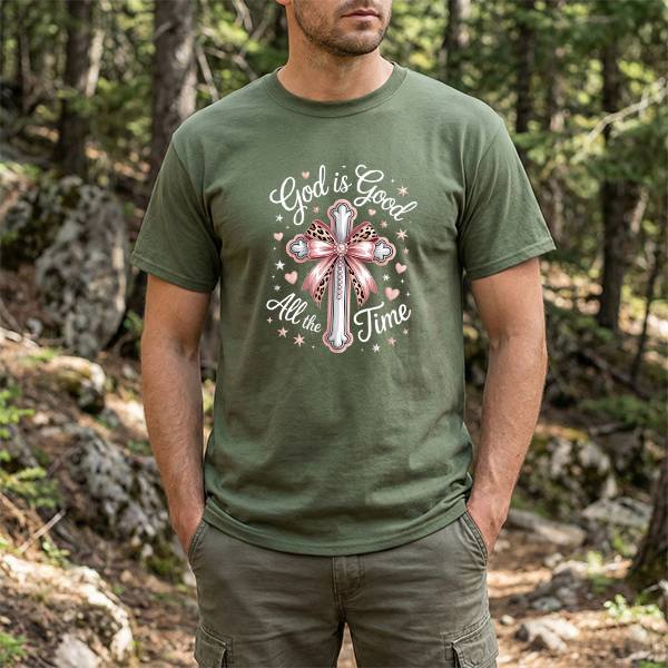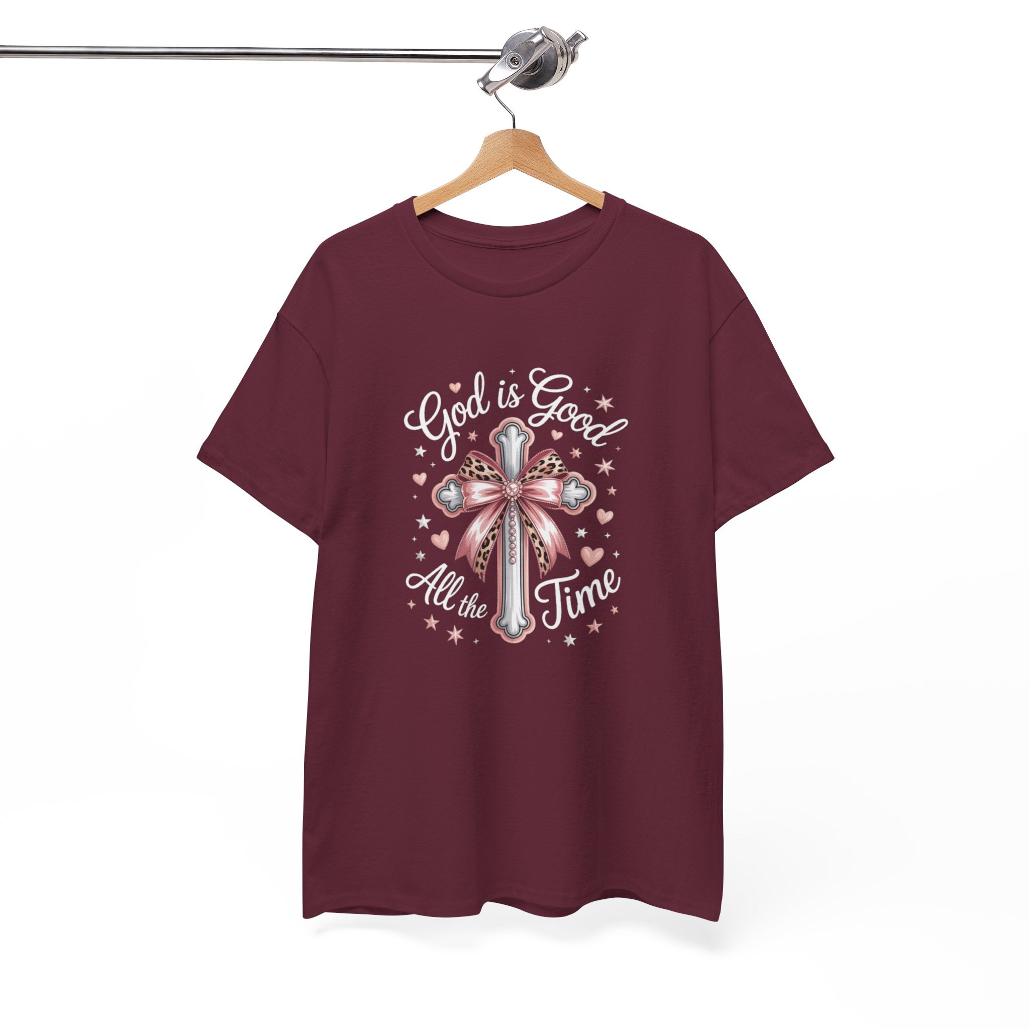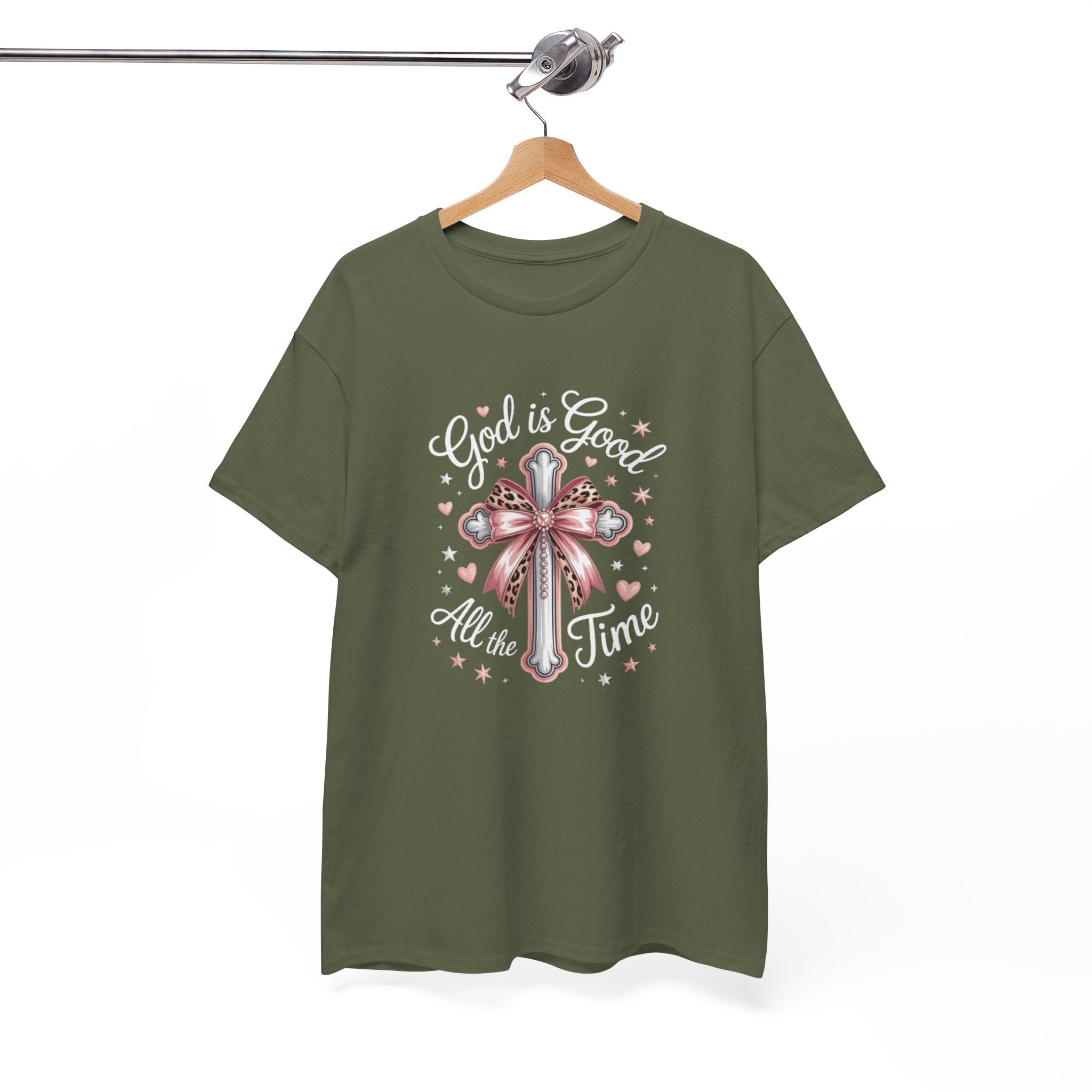 God Is Good All the Time T-Shirt — Pink Cross Christian Faith Tee