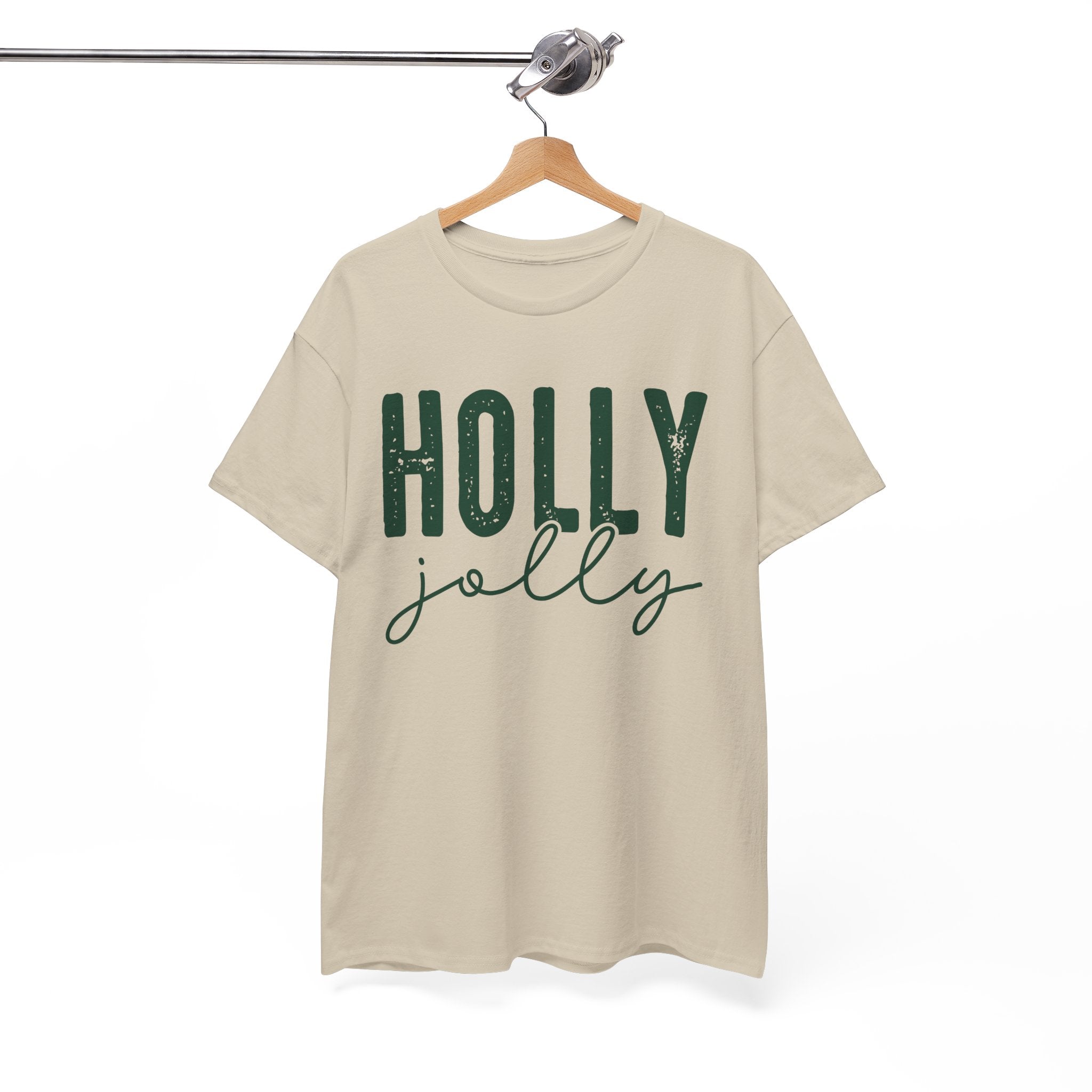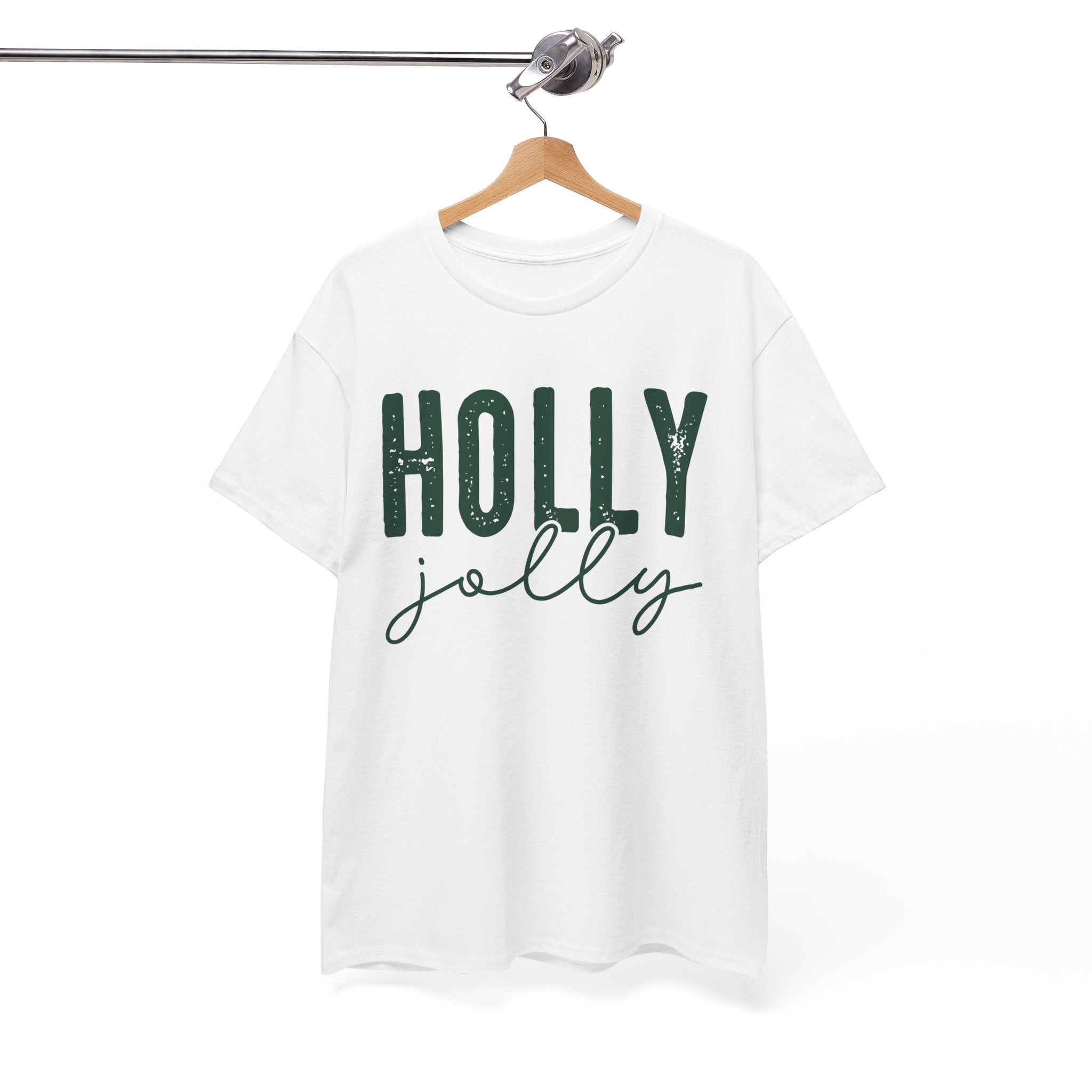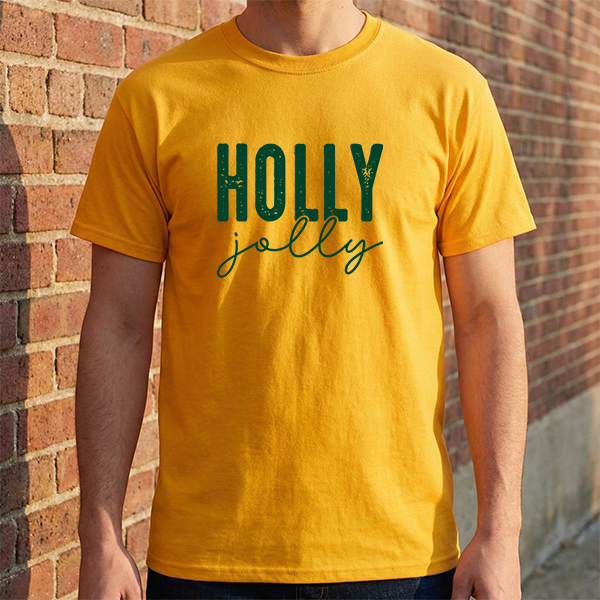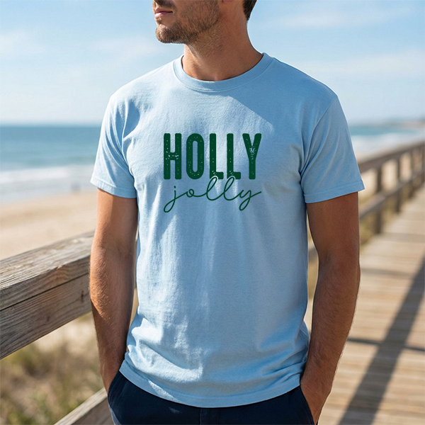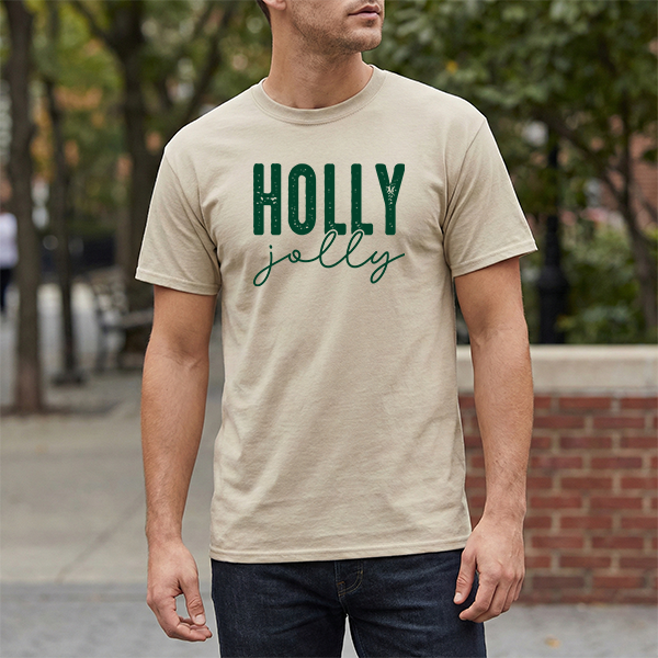 A light, cozy tee that carries a quiet holiday joy. Bold, green block letters read HOLLY with a delicate, handwritten "jolly" beneath — a balanced mix of vintage typography and modern script. The midweight cotton feels structured but soft, keeping its shape through gatherings, tree-decorating sessions, or casual strolls through twinkling streets. Wear it with a flannel shirt or under a cardigan for layered warmth, or let the clean white canvas highlight the festive green print on warmer winter days. The thoughtful construction — shoulder twill, ribbed collar, and tear-away label — keeps comfort front and center while the durable print methods keep the design crisp through many washes. For people who savor low-key holiday moments, this tee quietly sets the scene.
