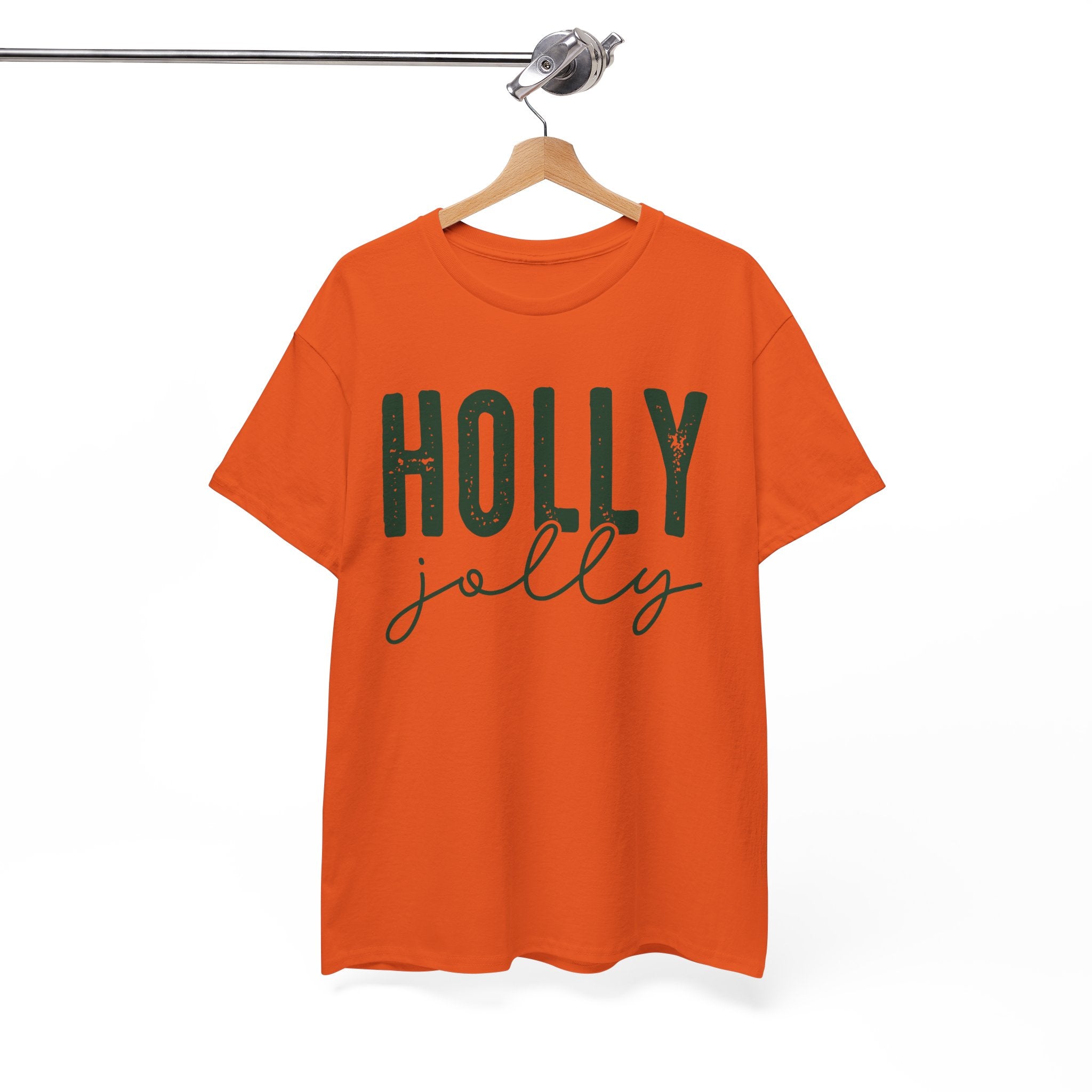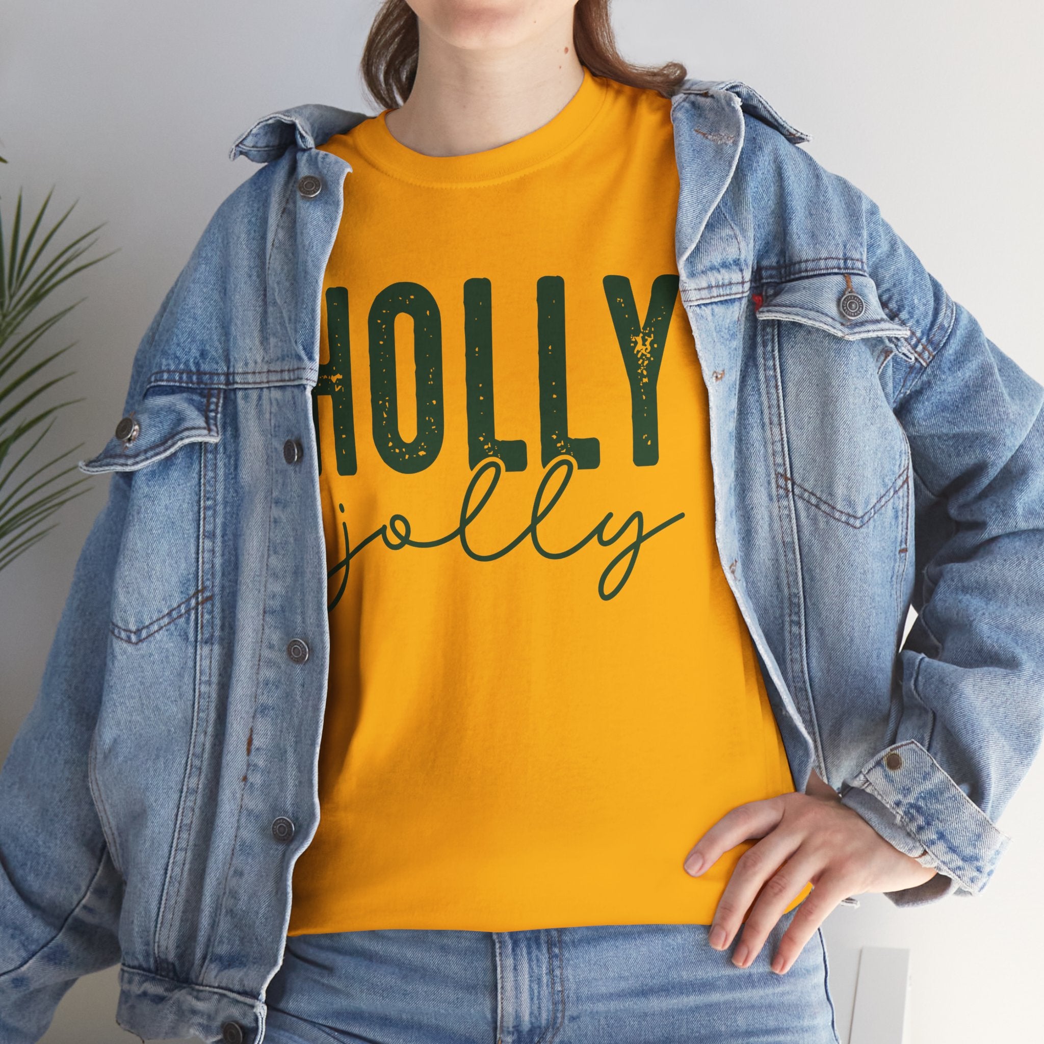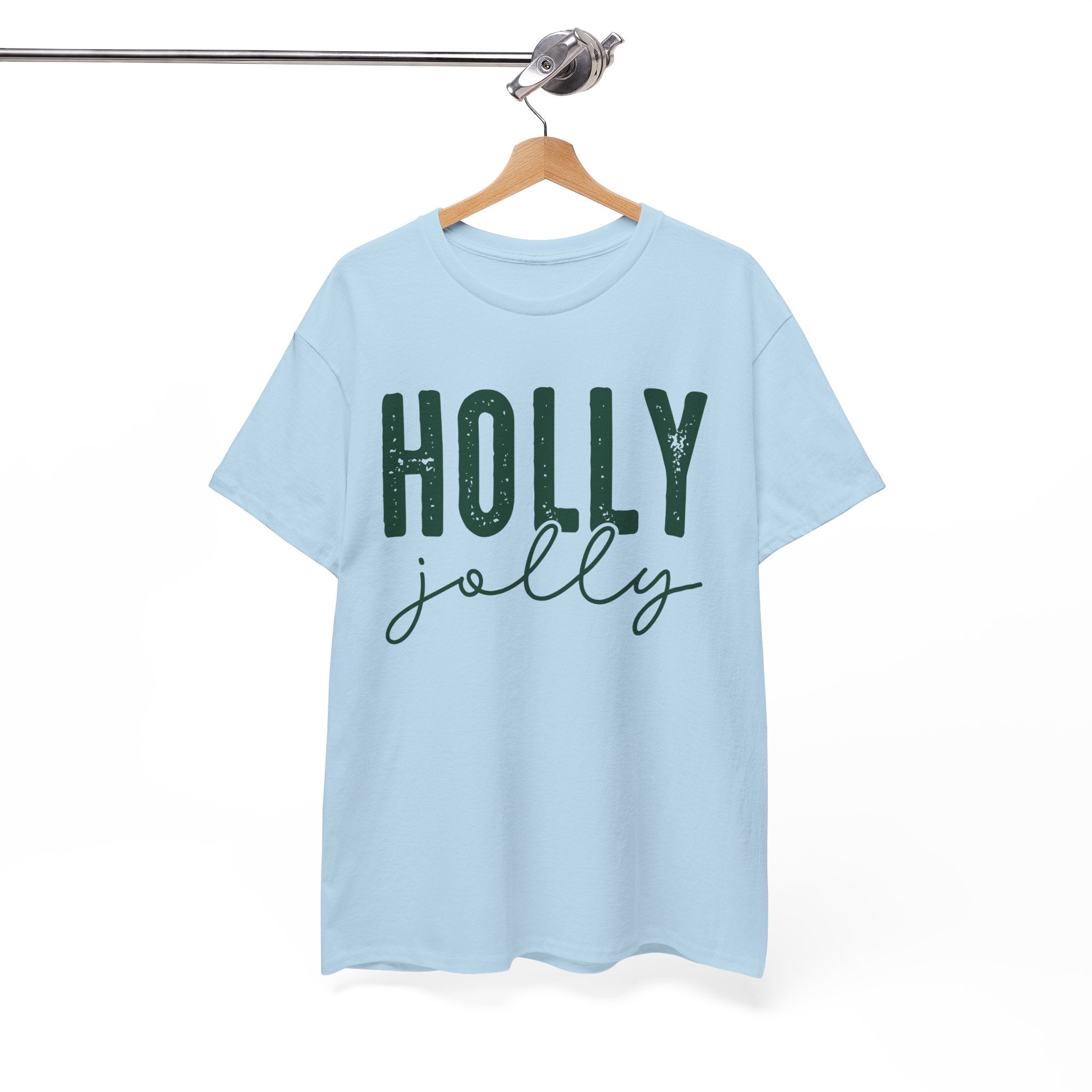 A light, cozy tee that carries a quiet holiday joy. Bold, green block letters read HOLLY with a delicate, handwritten "jolly" beneath — a balanced mix of vintage typography and modern script. The midweight cotton feels structured but soft, keeping its shape through gatherings, tree-decorating sessions, or casual strolls through twinkling streets. Wear it with a flannel shirt or under a cardigan for layered warmth, or let the clean white canvas highlight the festive green print on warmer winter days. The thoughtful construction — shoulder twill, ribbed collar, and tear-away label — keeps comfort front and center while the durable print methods keep the design crisp through many washes. For people who savor low-key holiday moments, this tee quietly sets the scene.