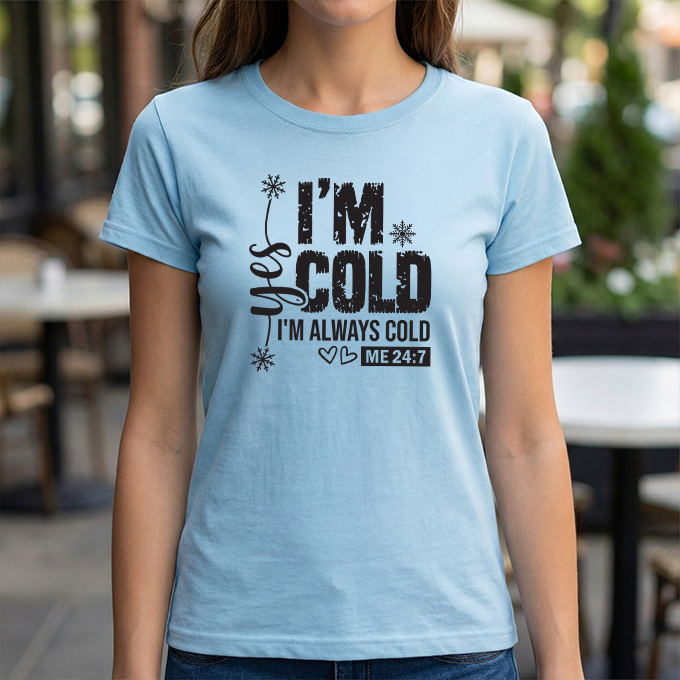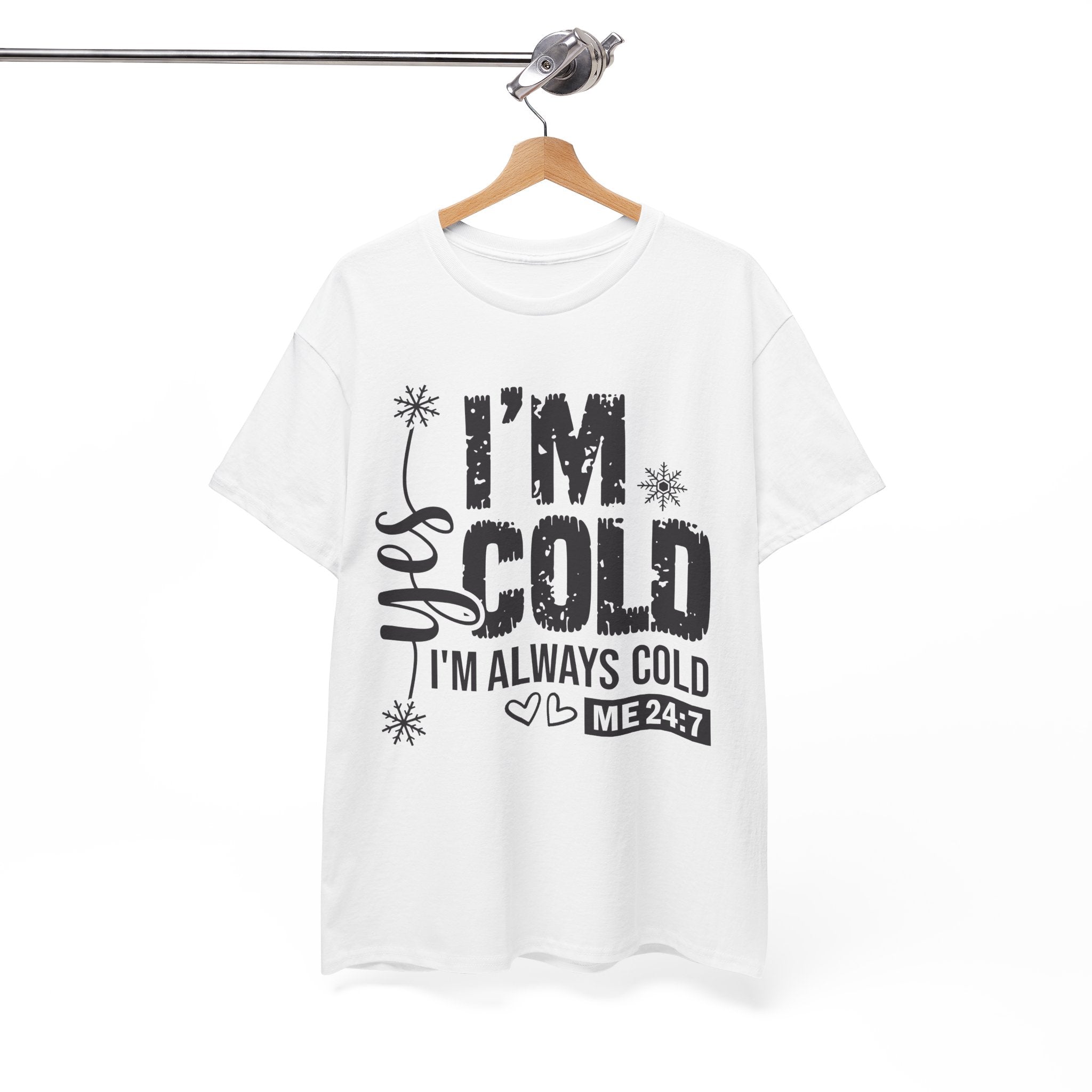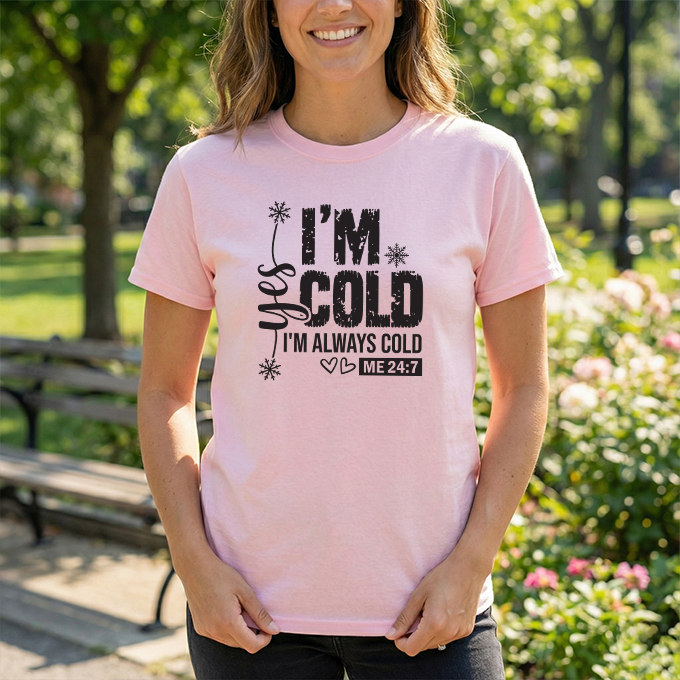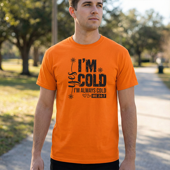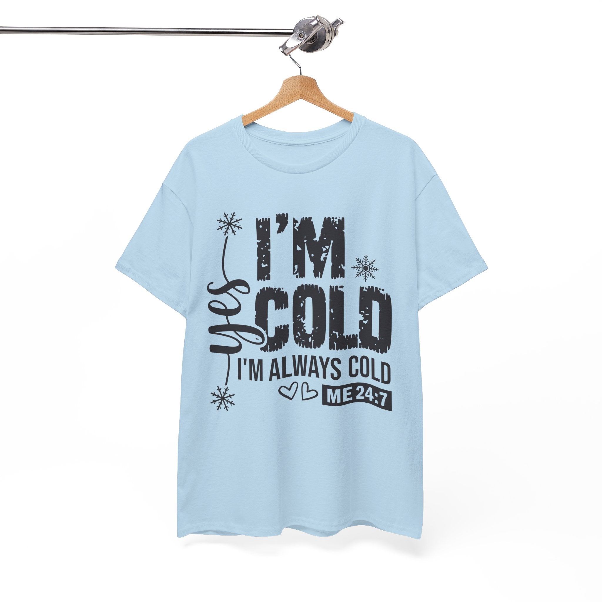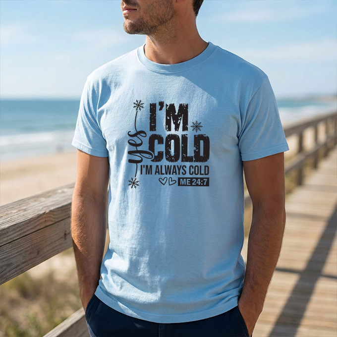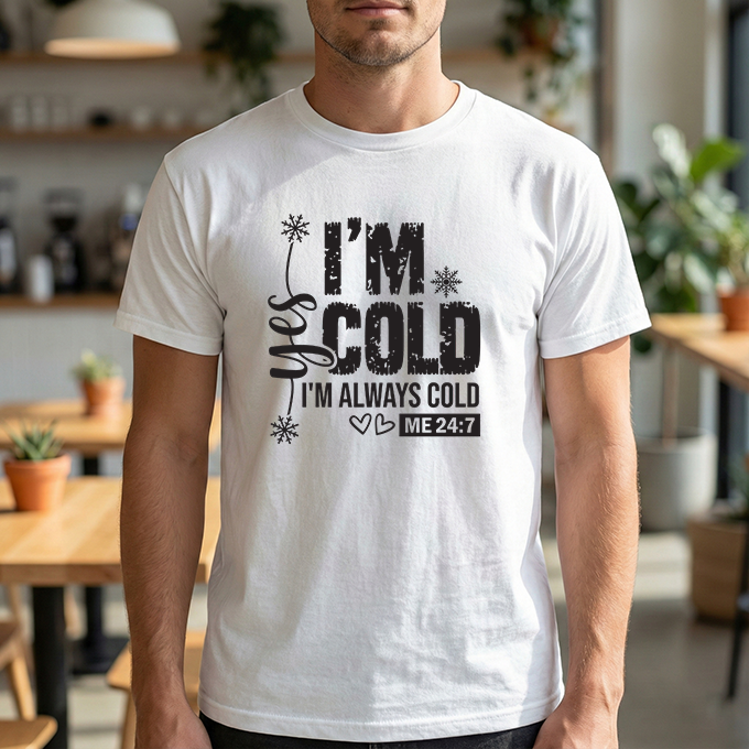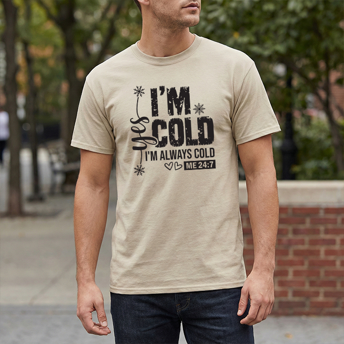 This soft, classic-fit tee speaks with a wink: a distressed, hand-lettered design reads “Yes I’m Cold – I’m Always Cold (Me 24:7)” with tiny snowflake accents. It’s lightweight enough to layer under a flannel or wear solo on cool mornings, and its relaxed crew neck and tear-away label keep comfort front and center. The printed textures feel lived-in and casual, like a favorite shirt you grab when the air turns crisp and you want to laugh about it. Wear it on runs to the coffee shop, while curled up with a blanket, or out with fellow cold-buddies — it’s an easy, familiar piece that adds personality without shouting.
