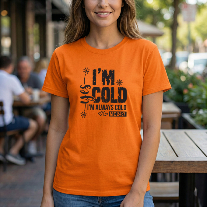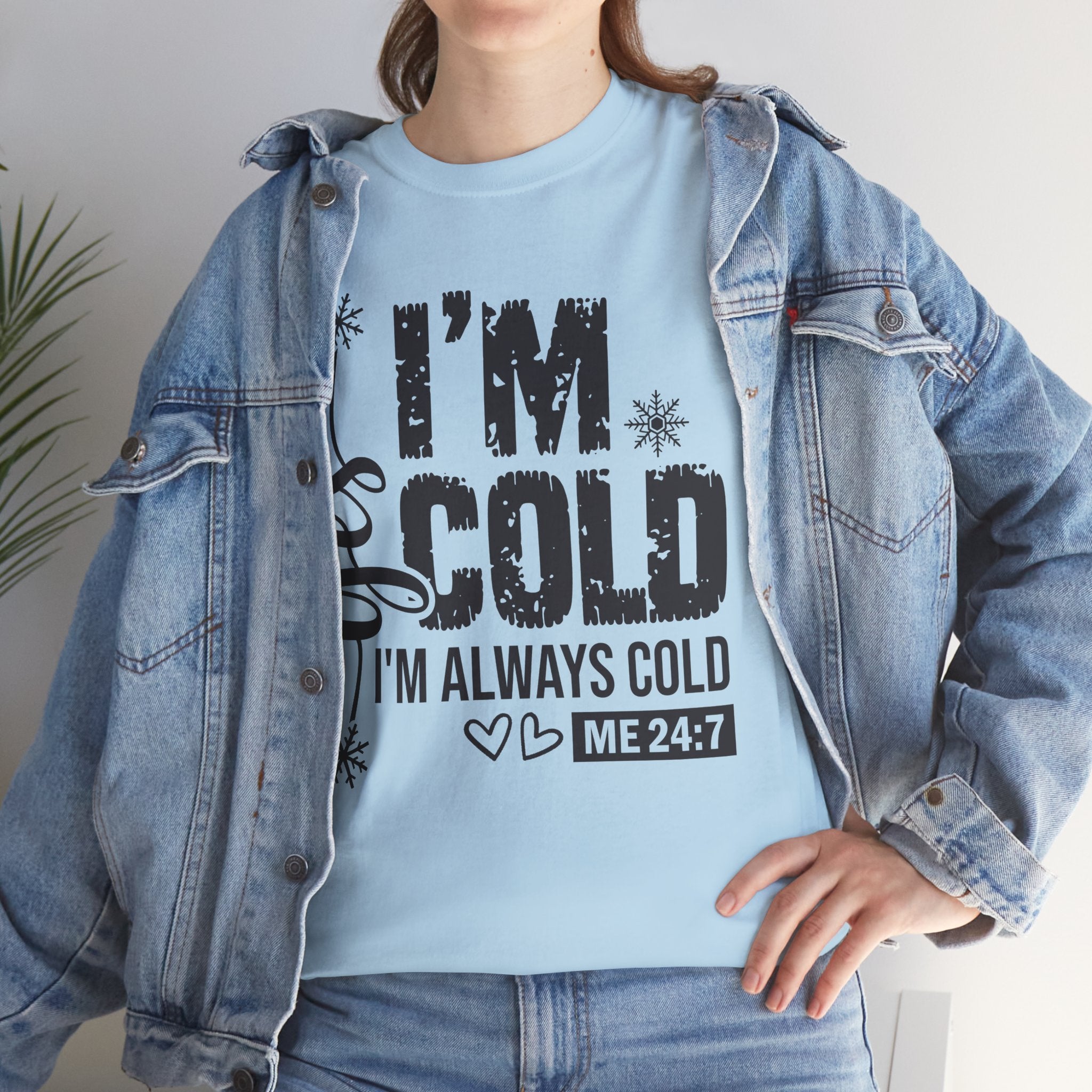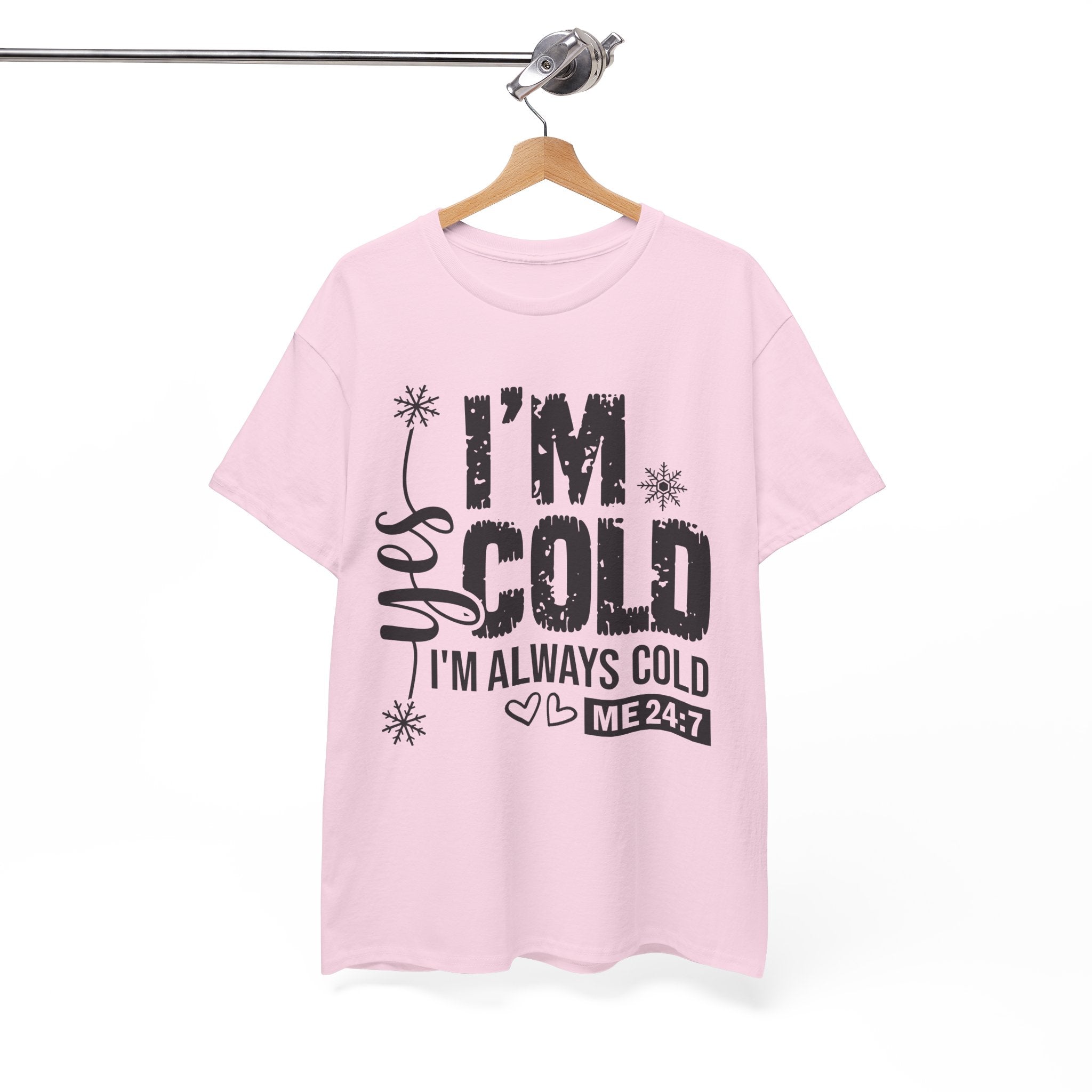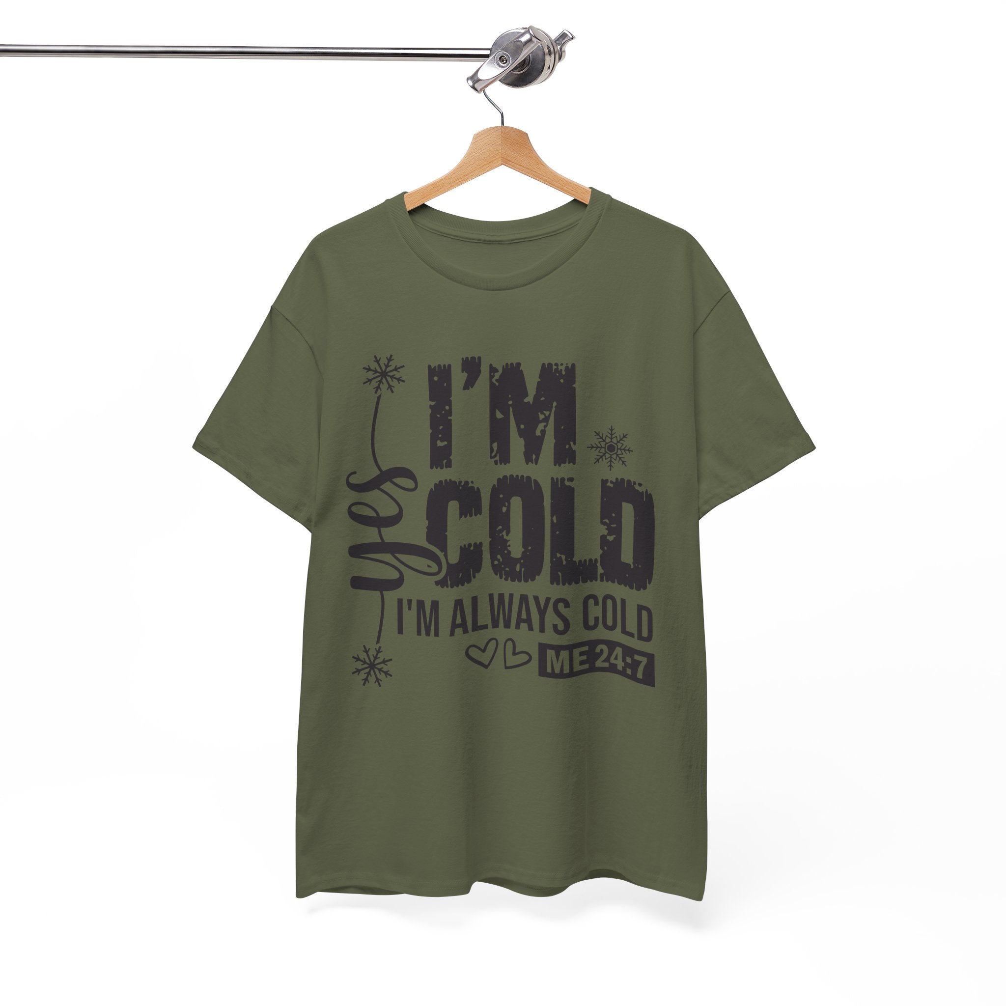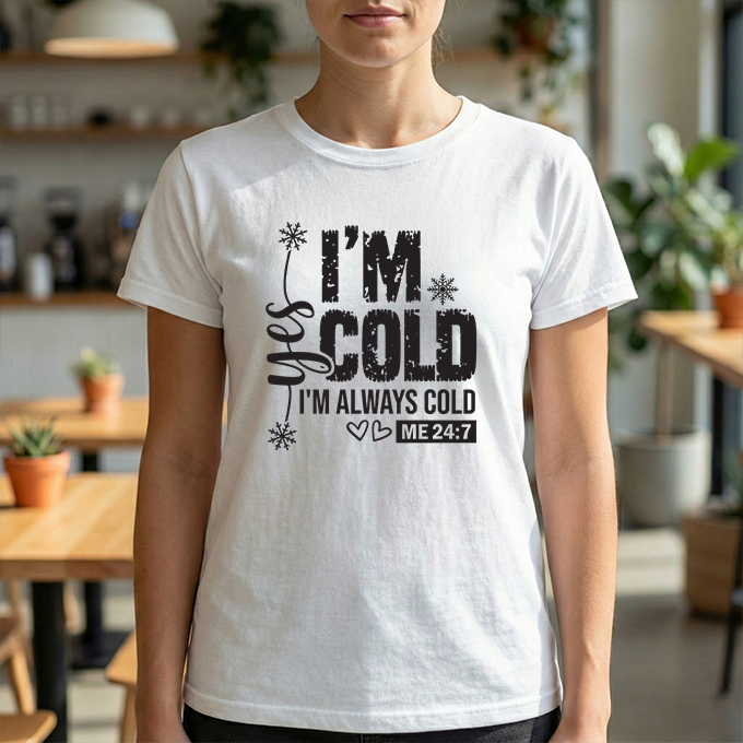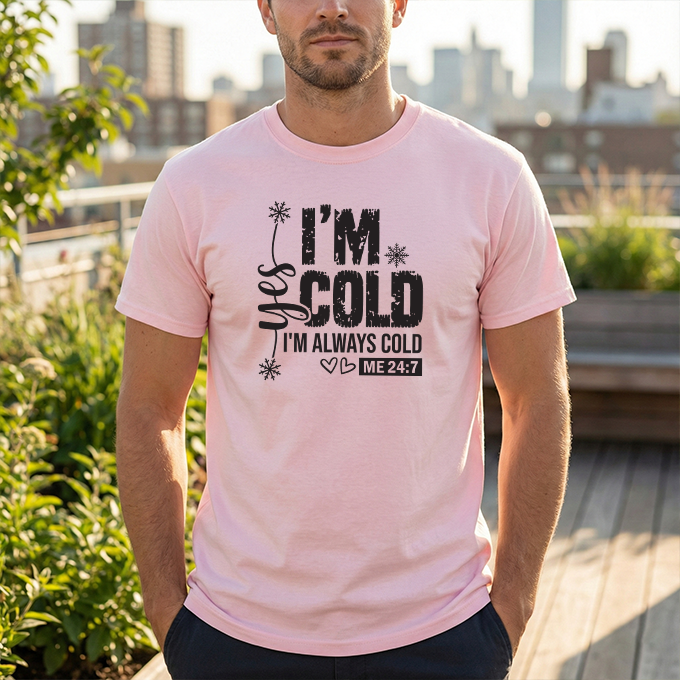 This soft, classic-fit tee speaks with a wink: a distressed, hand-lettered design reads “Yes I’m Cold – I’m Always Cold (Me 24:7)” with tiny snowflake accents. It’s lightweight enough to layer under a flannel or wear solo on cool mornings, and its relaxed crew neck and tear-away label keep comfort front and center. The printed textures feel lived-in and casual, like a favorite shirt you grab when the air turns crisp and you want to laugh about it. Wear it on runs to the coffee shop, while curled up with a blanket, or out with fellow cold-buddies — it’s an easy, familiar piece that adds personality without shouting.