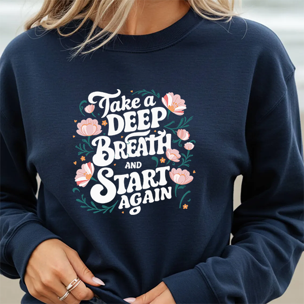 Wrap yourself in a quiet reminder to pause, breathe, and begin again. This cozy crewneck pairs a soft, medium-heavy knit with a hand-lettered message — "Take a deep breath and start again" — framed by gentle floral accents. It settles into your shoulders and moves with you, whether you’re stepping out for a morning walk, settling into a late-night work session, or curling up with tea. The message reads like a small act of self-care, visible but subtle, that invites calm and steady courage throughout the day.