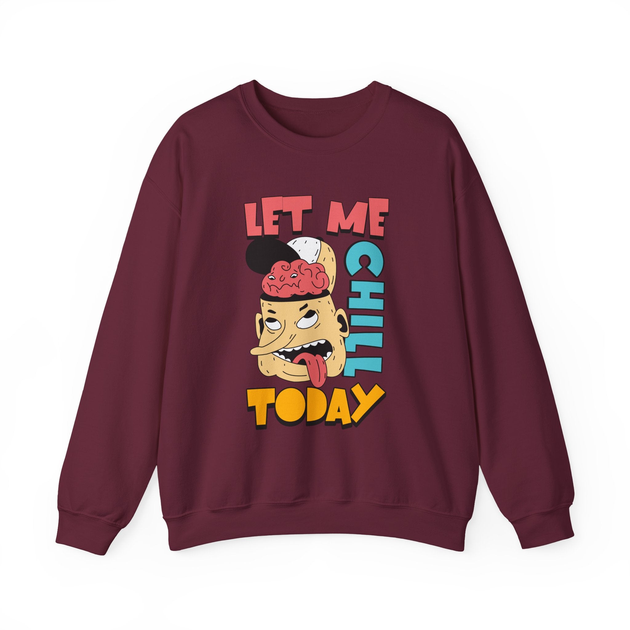 This cozy crewneck brings playful attitude to everyday comfort. Soft, medium-weight fabric and a classic fit make it an easy throw-on for slow mornings, late-night walks, or lazy weekends. The bold, cartoon graphic — a cheeky character with a popped-open head and the phrase “Let Me Chill Today” in bright, retro colors — gives the sweatshirt a rebellious, tongue-in-cheek personality that speaks to anyone needing to hit pause. Durable double-needle stitching and a ribbed collar keep the shape through repeat wears. Wear it when you want comfort with character: lounging at home, grabbing coffee, or layering for a casual outing that says you’re keeping things low-key.