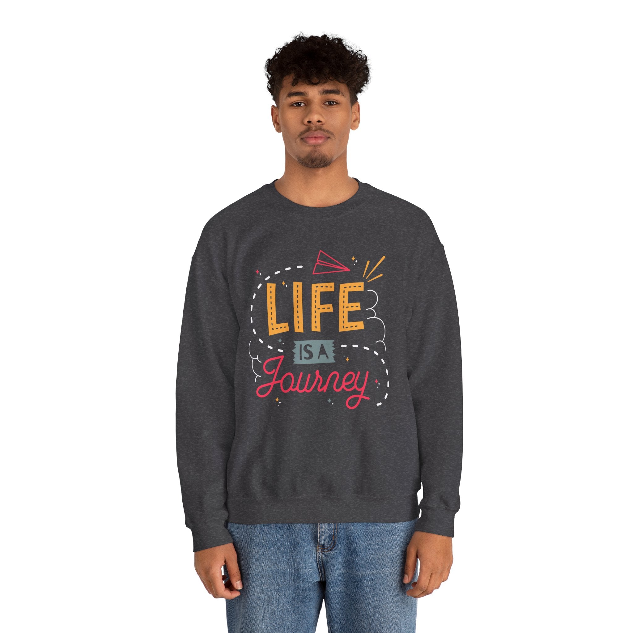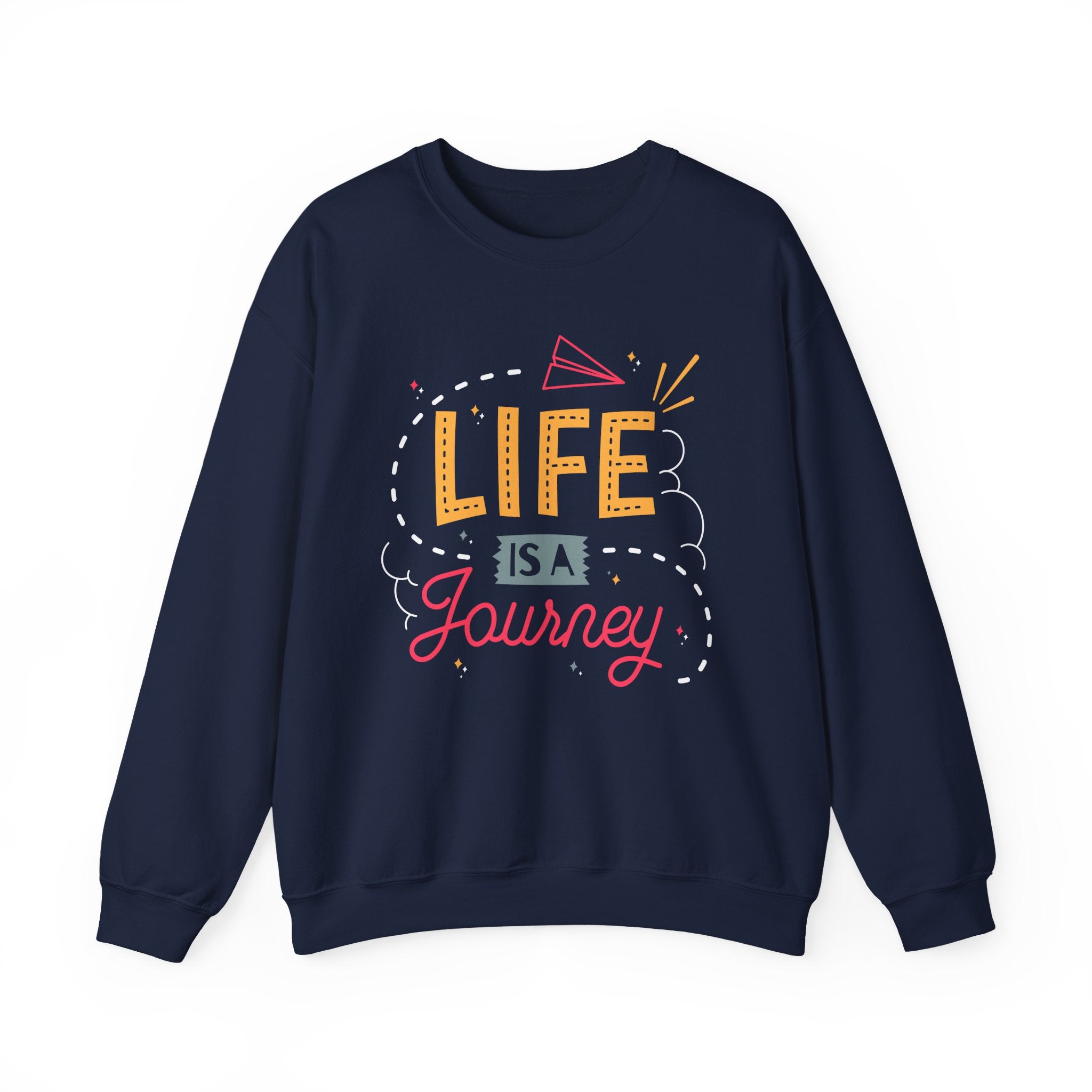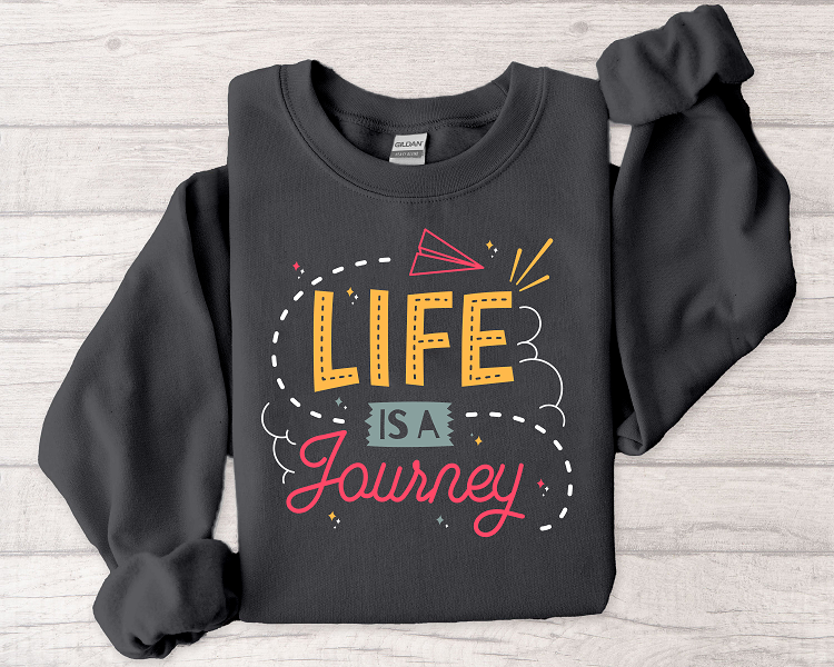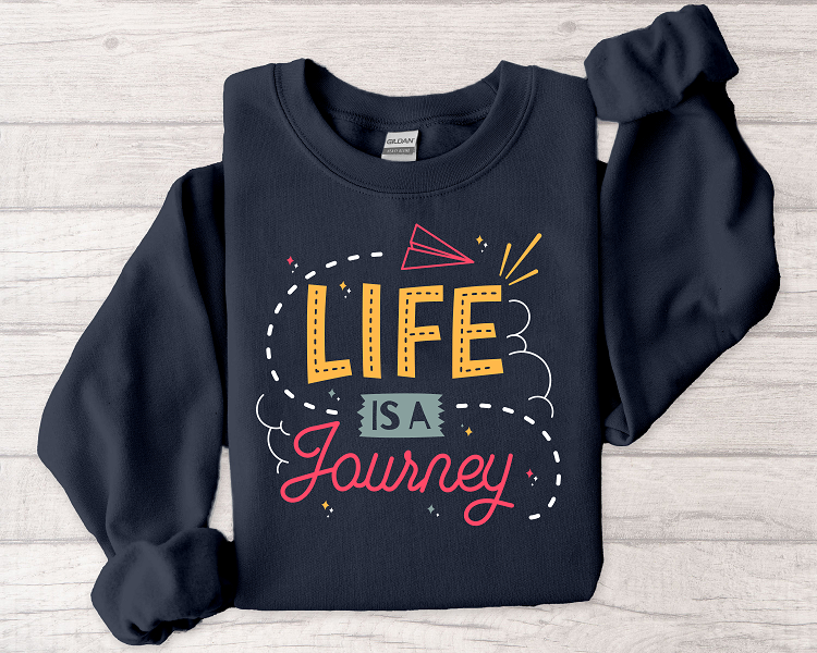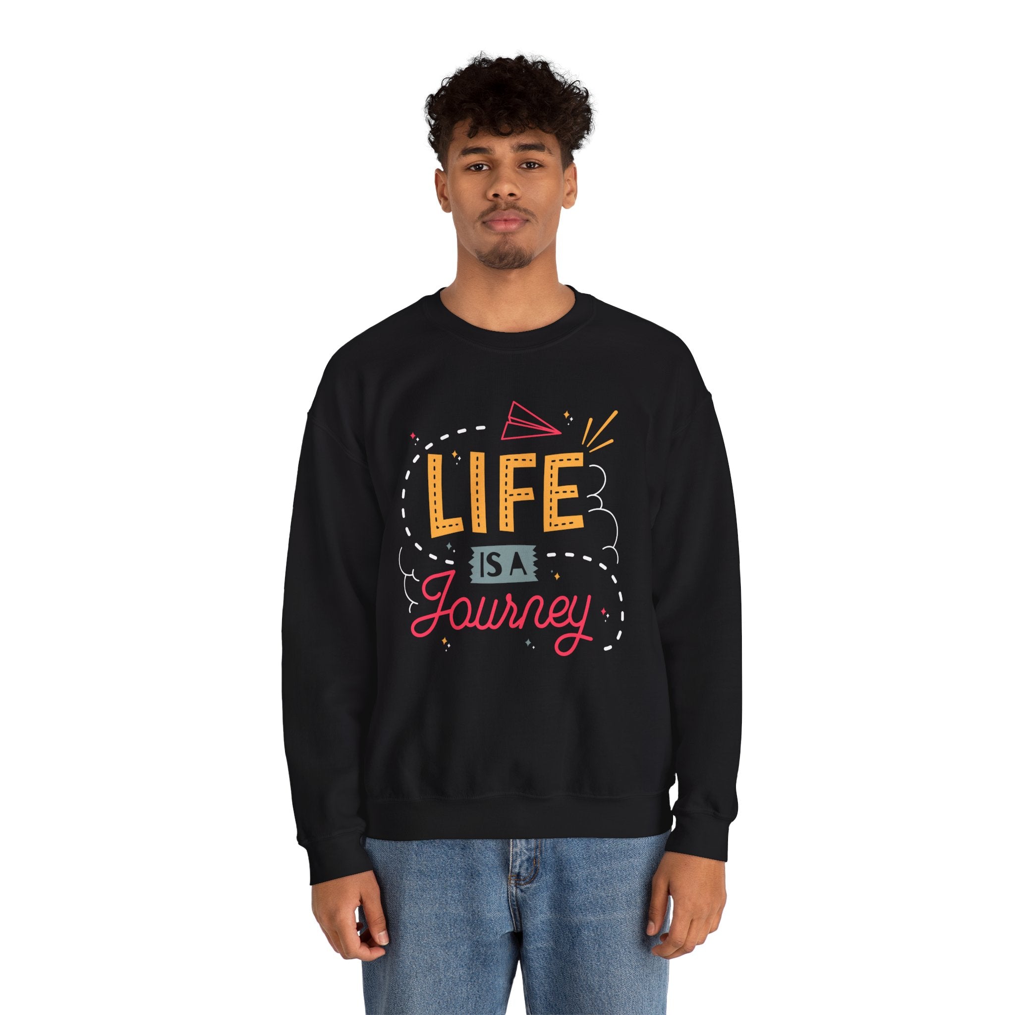 A cozy, midweight crewneck sweatshirt printed with an uplifting, hand-lettered “Life is a Journey” design. The bold, cheerful typography and playful paper-plane accent bring a bright, optimistic energy to everyday wear. Built from a soft 50/50 cotton–poly blend with a classic fit and crew neckline, this sweatshirt sits comfortably for long commutes, relaxed weekends, or quiet nights with friends. Durable double-needle stitching and a tear-away label keep it comfortable and built to last. The clean black background makes the colorful print pop, while optional placements like chest or wrist embroidery let you personalize the look for a subtle, handcrafted touch.