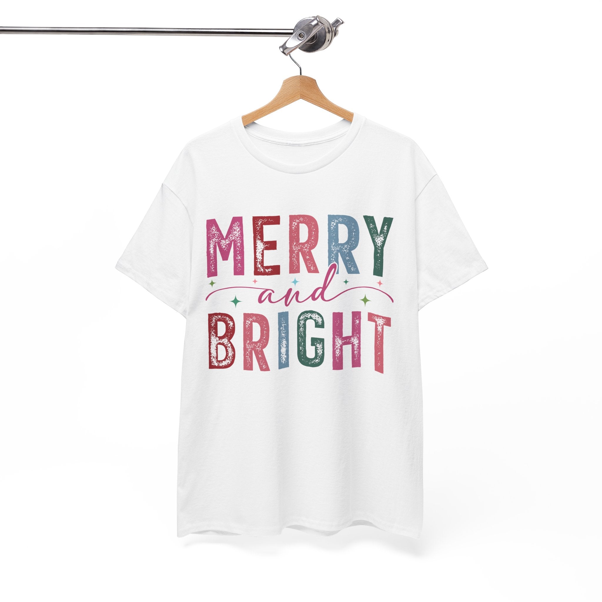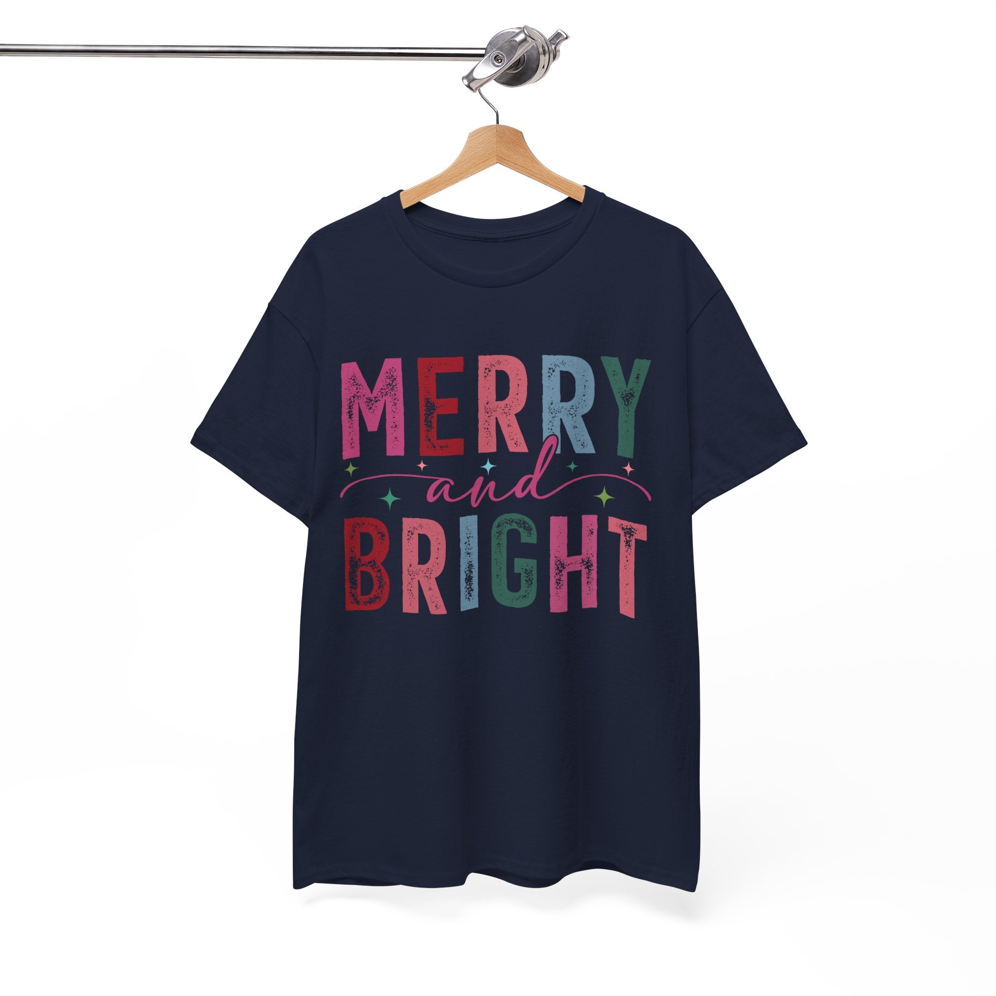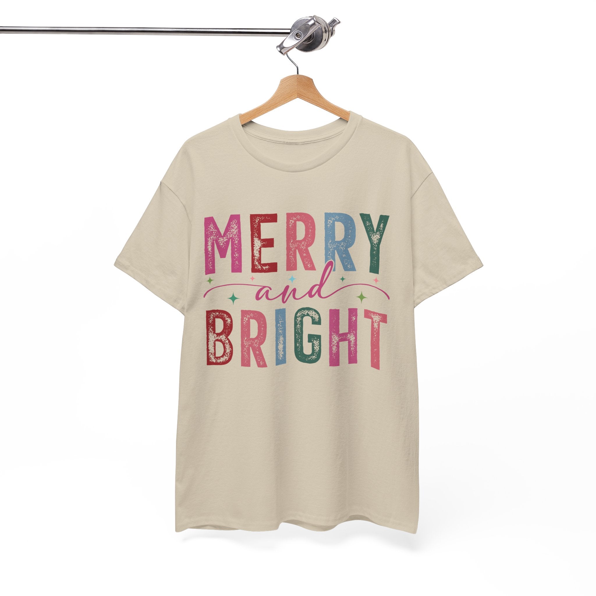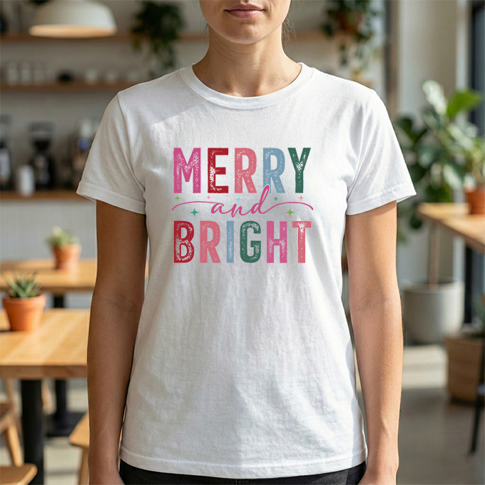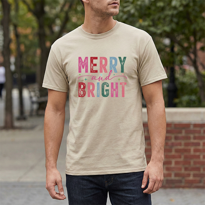 Merry and Bright — a soft, classic crew tee that carries the gentle glow of cozy holiday mornings. The letters are filled with textured, vintage-inspired colors and tiny decorative stars, like a string of lights and wrapping paper folded into type. It sits with easy confidence on the shoulders and falls into a relaxed silhouette, the ribbed collar holding its shape through repeated wears. Wear it while wrapping gifts, sipping hot cocoa by the window, or wandering a neighborhood of lit-up porches — it reads like a warm, familiar hello during the season.