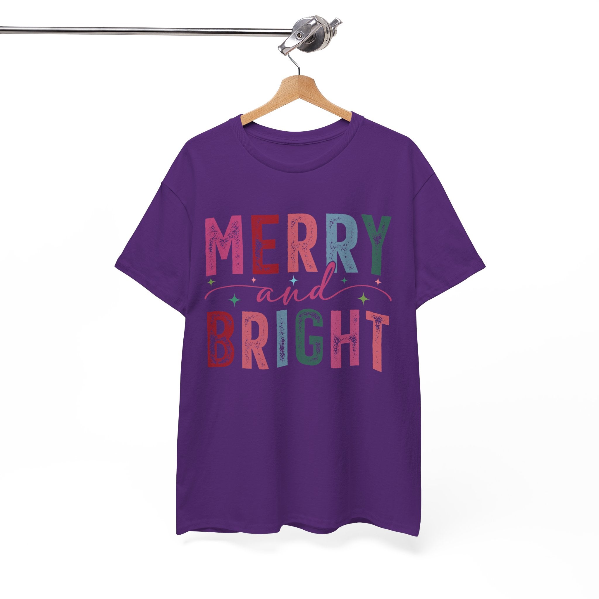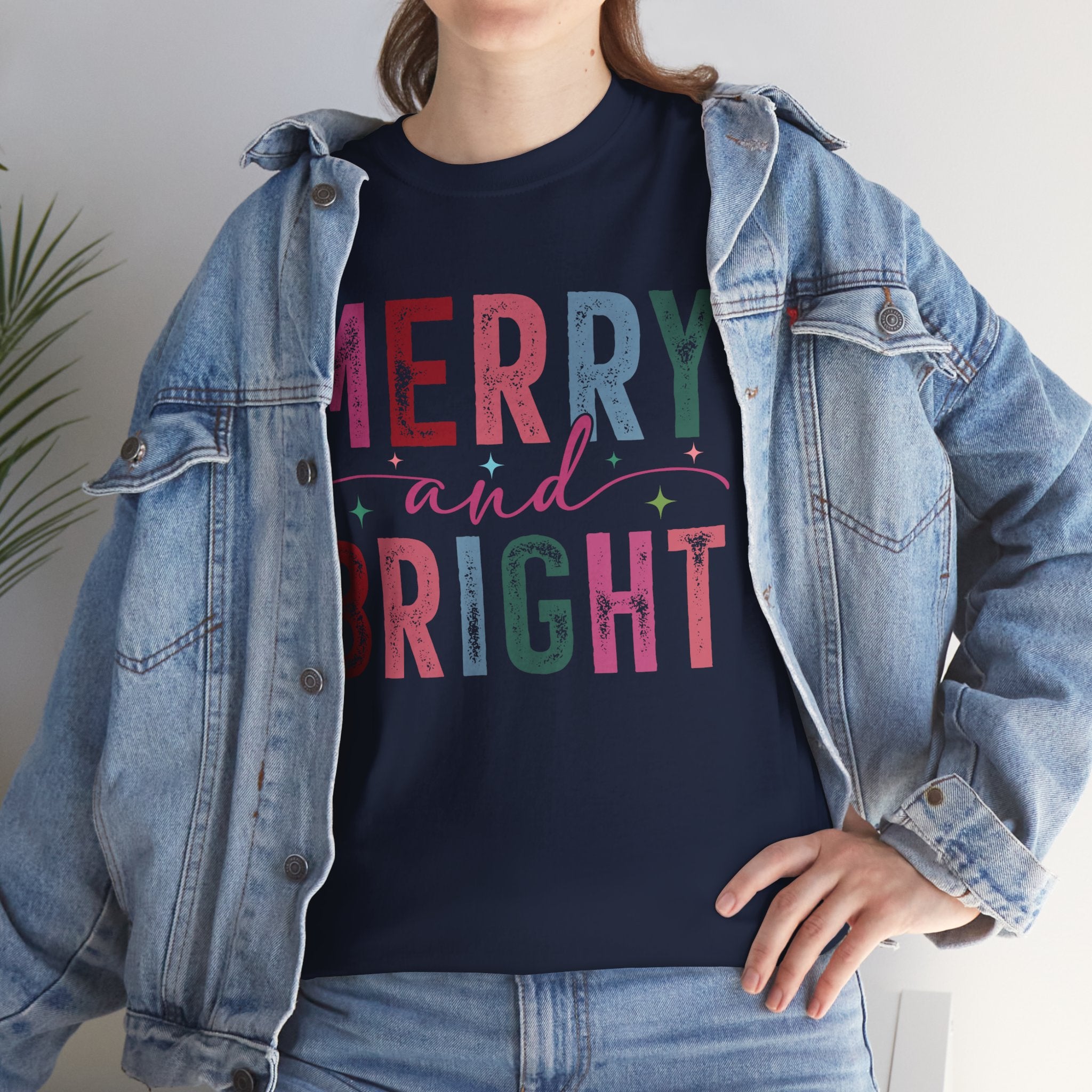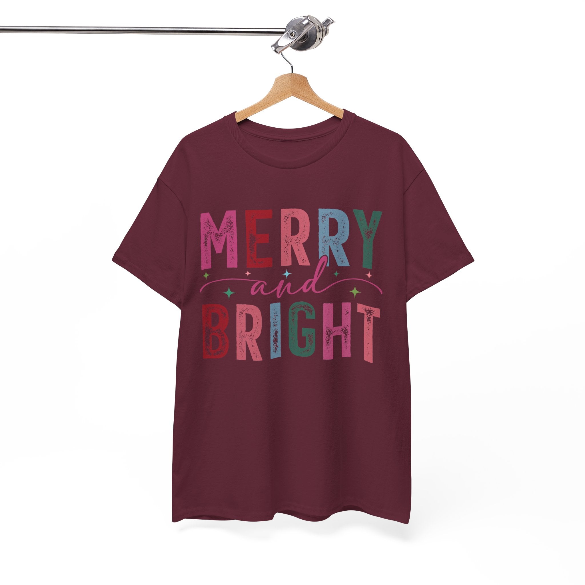 Merry and Bright — a soft, classic crew tee that carries the gentle glow of cozy holiday mornings. The letters are filled with textured, vintage-inspired colors and tiny decorative stars, like a string of lights and wrapping paper folded into type. It sits with easy confidence on the shoulders and falls into a relaxed silhouette, the ribbed collar holding its shape through repeated wears. Wear it while wrapping gifts, sipping hot cocoa by the window, or wandering a neighborhood of lit-up porches — it reads like a warm, familiar hello during the season.