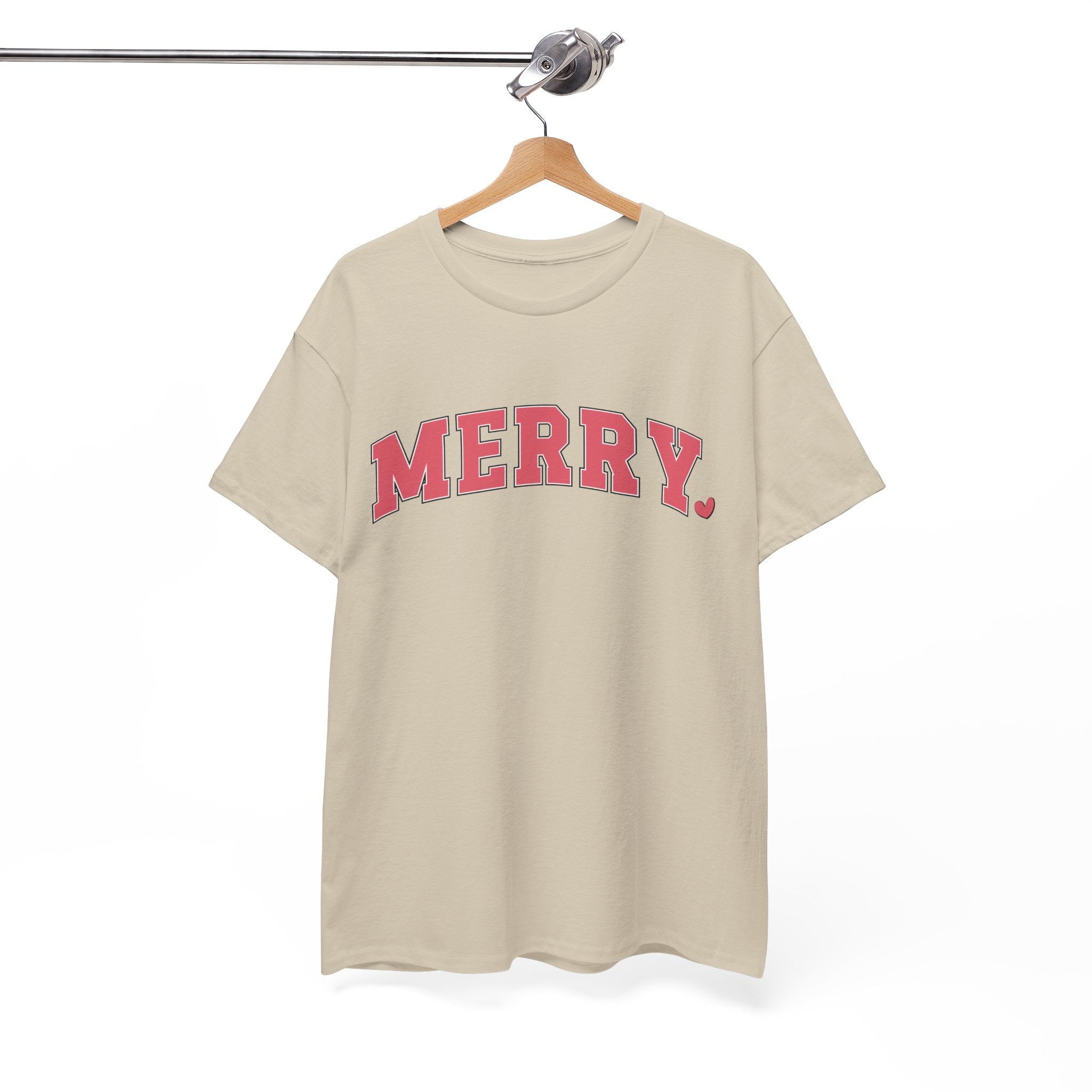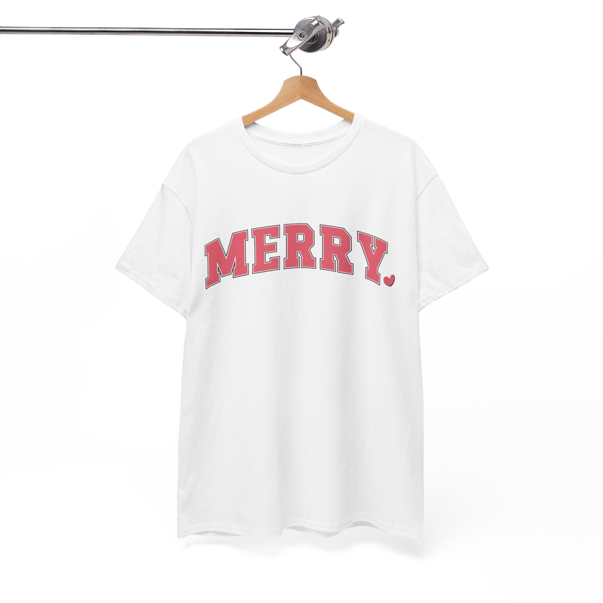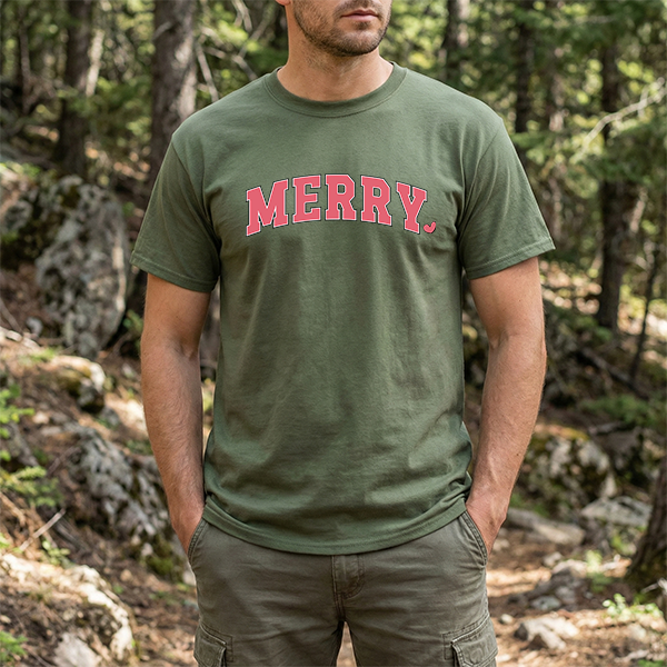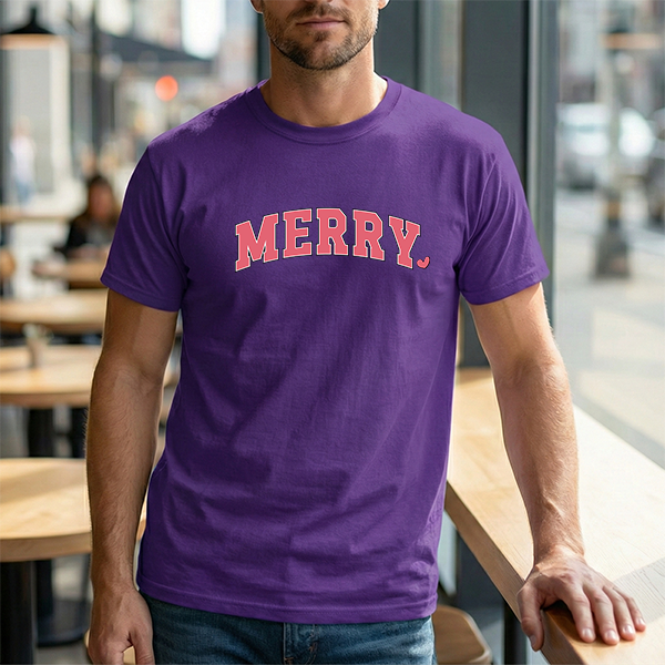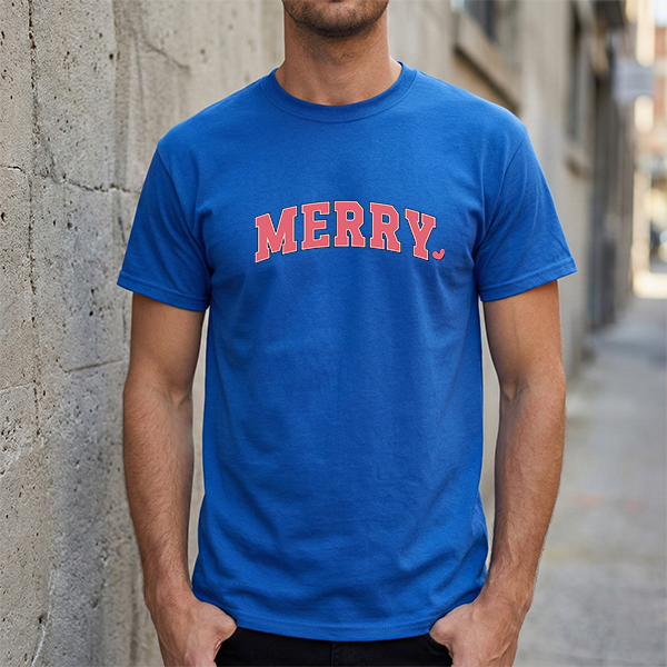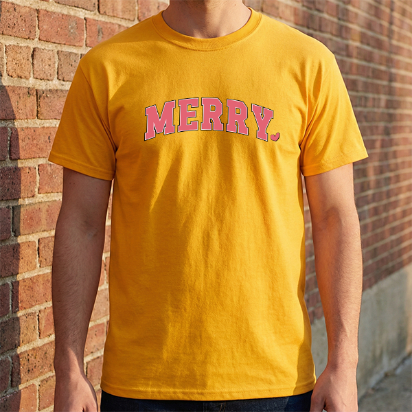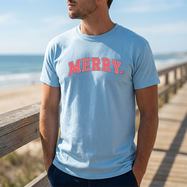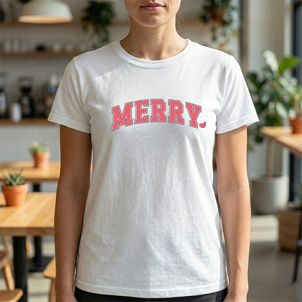 Soft, familiar, and quietly festive — this classic crew tee wears the season like a favorite memory. The front’s arched “MERRY.” text uses a warm, slightly vintage block type that reads like a friendly nod at holiday gatherings. It’s lightweight enough to layer under a cardigan or coat, yet sturdy enough to stand alone during a city stroll or a cozy living-room morning with coffee and string lights. The clean white backdrop keeps the message crisp and wearable beyond a single event, slipping easily into everyday outfits for anyone who likes subtle holiday flair without shouting for attention. Comfortable, breathable, and intentionally simple — it invites smiles and easy conversation wherever small celebrations happen.