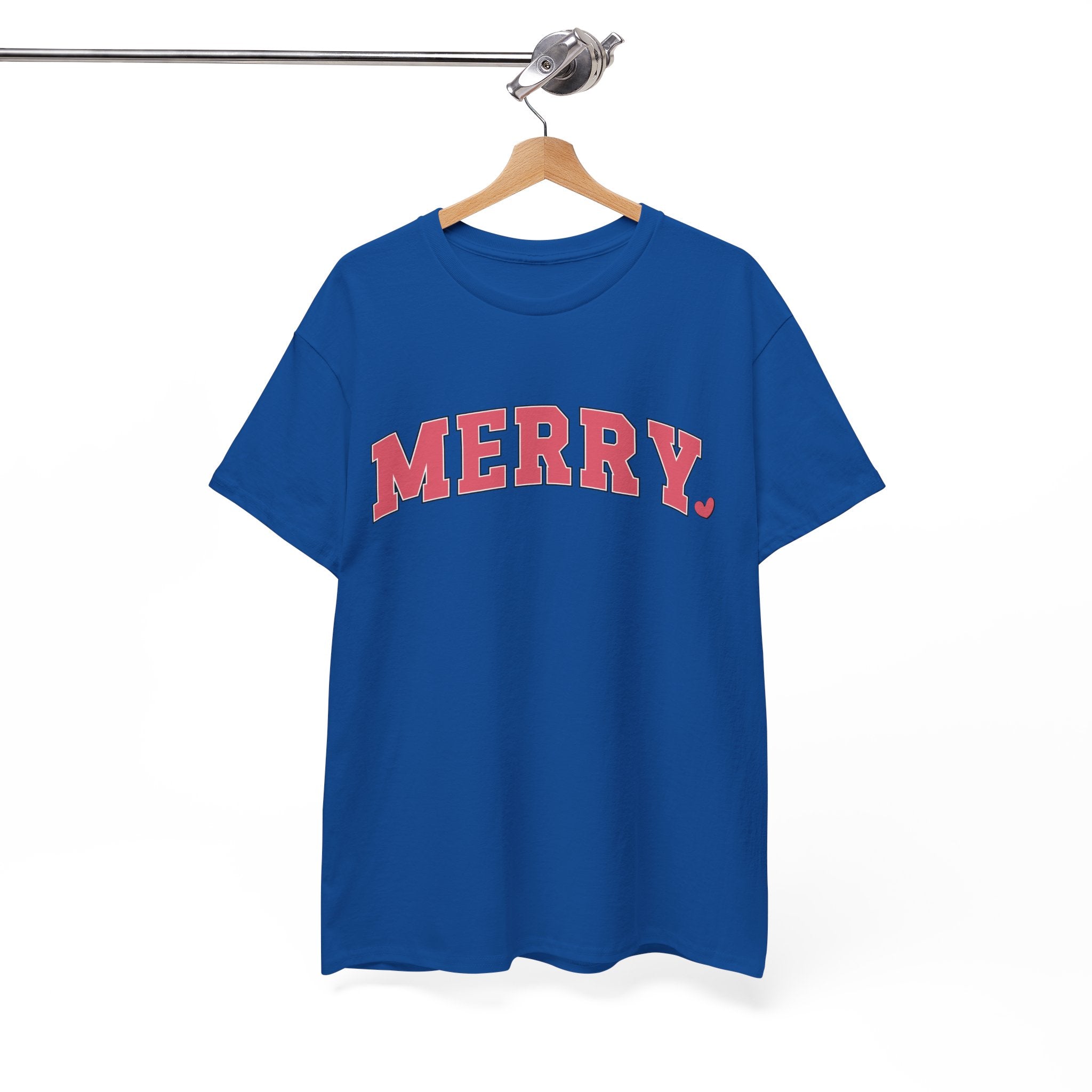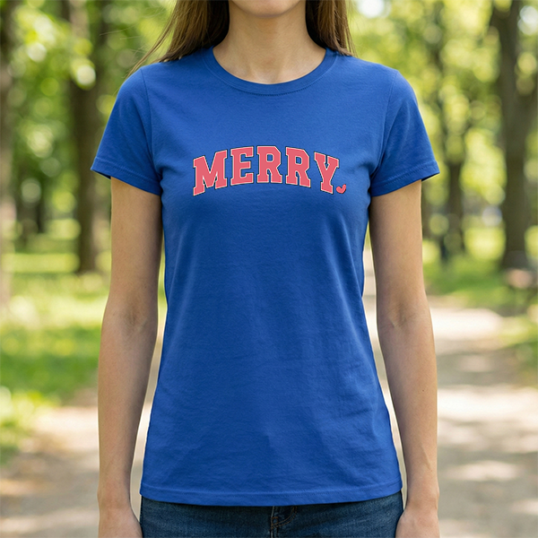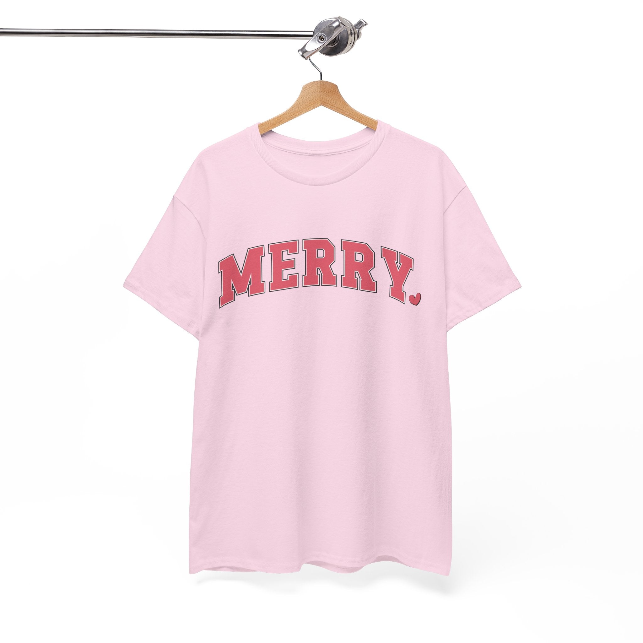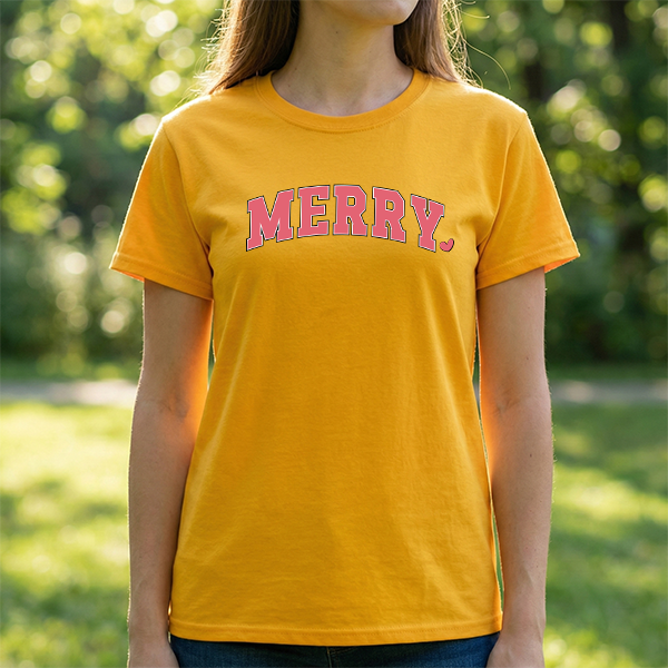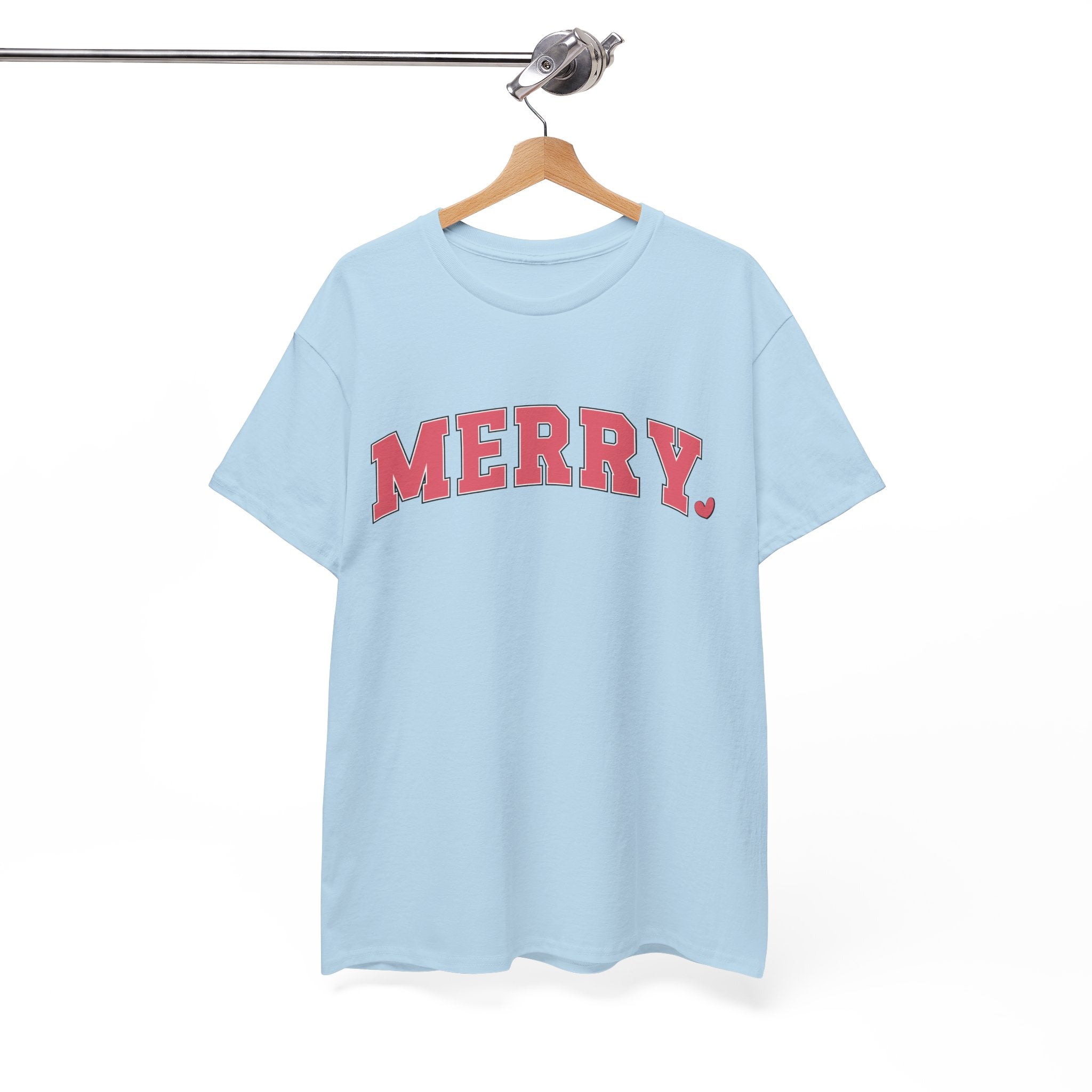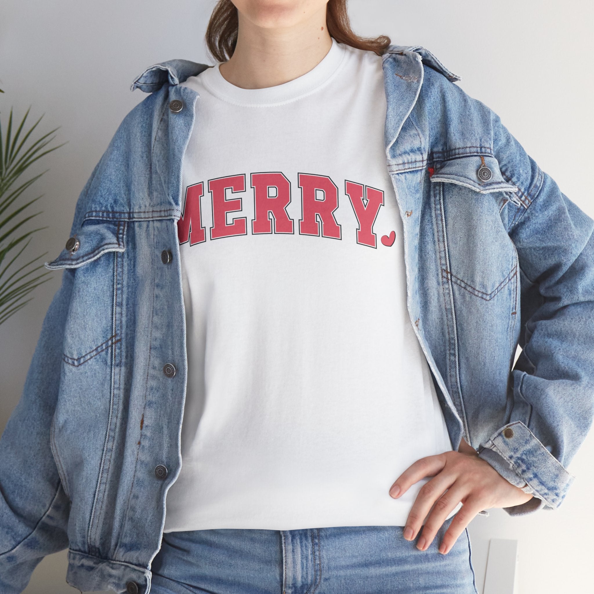 Soft, familiar, and quietly festive — this classic crew tee wears the season like a favorite memory. The front’s arched “MERRY.” text uses a warm, slightly vintage block type that reads like a friendly nod at holiday gatherings. It’s lightweight enough to layer under a cardigan or coat, yet sturdy enough to stand alone during a city stroll or a cozy living-room morning with coffee and string lights. The clean white backdrop keeps the message crisp and wearable beyond a single event, slipping easily into everyday outfits for anyone who likes subtle holiday flair without shouting for attention. Comfortable, breathable, and intentionally simple — it invites smiles and easy conversation wherever small celebrations happen.