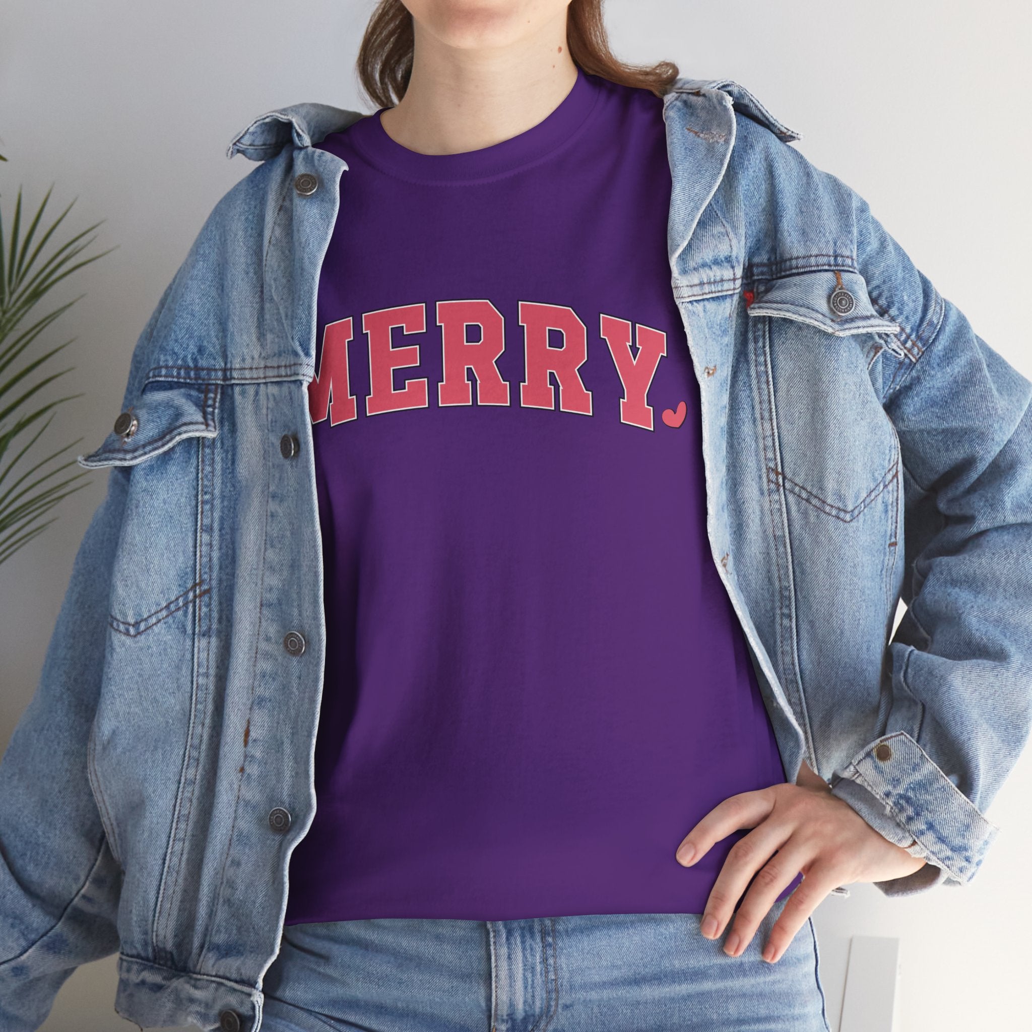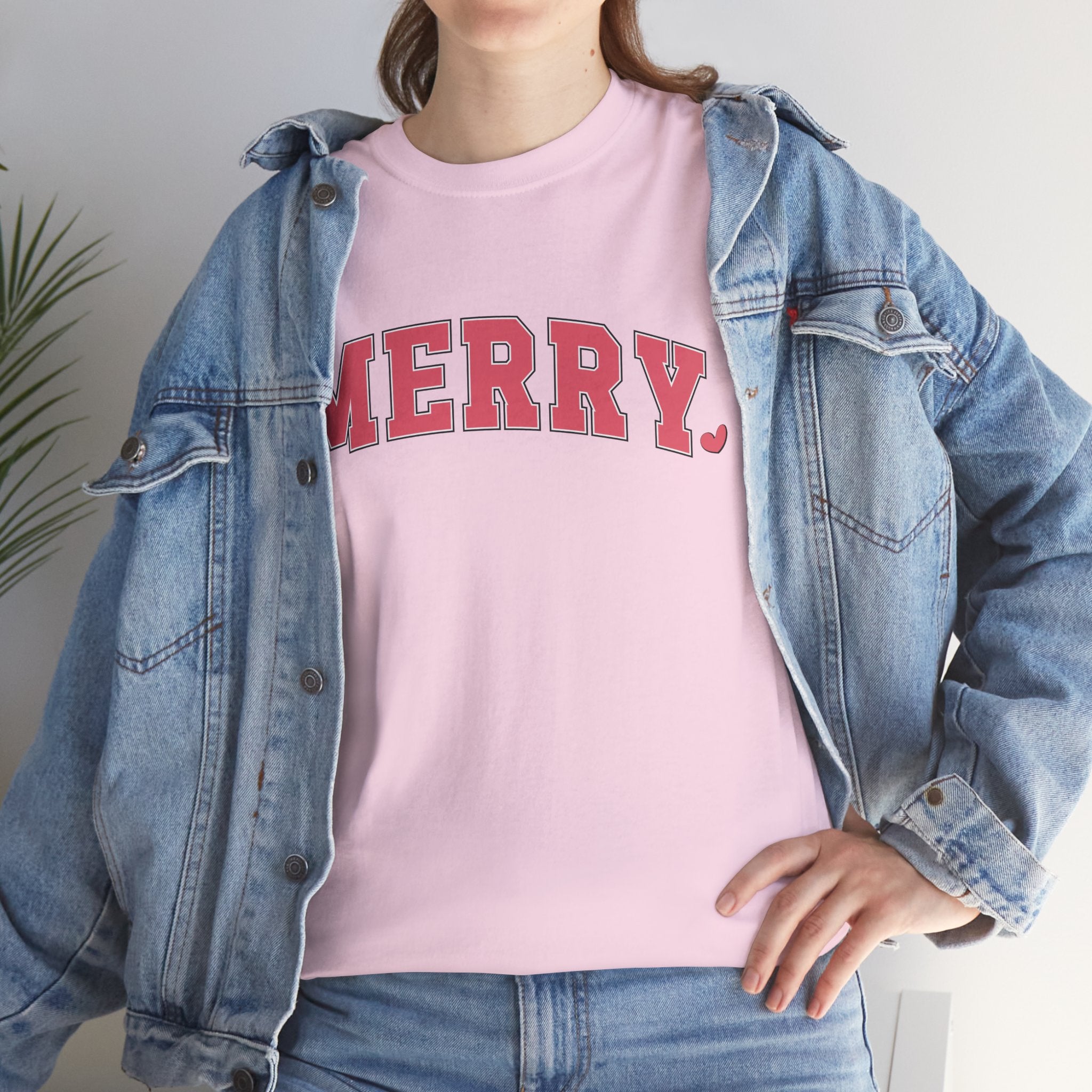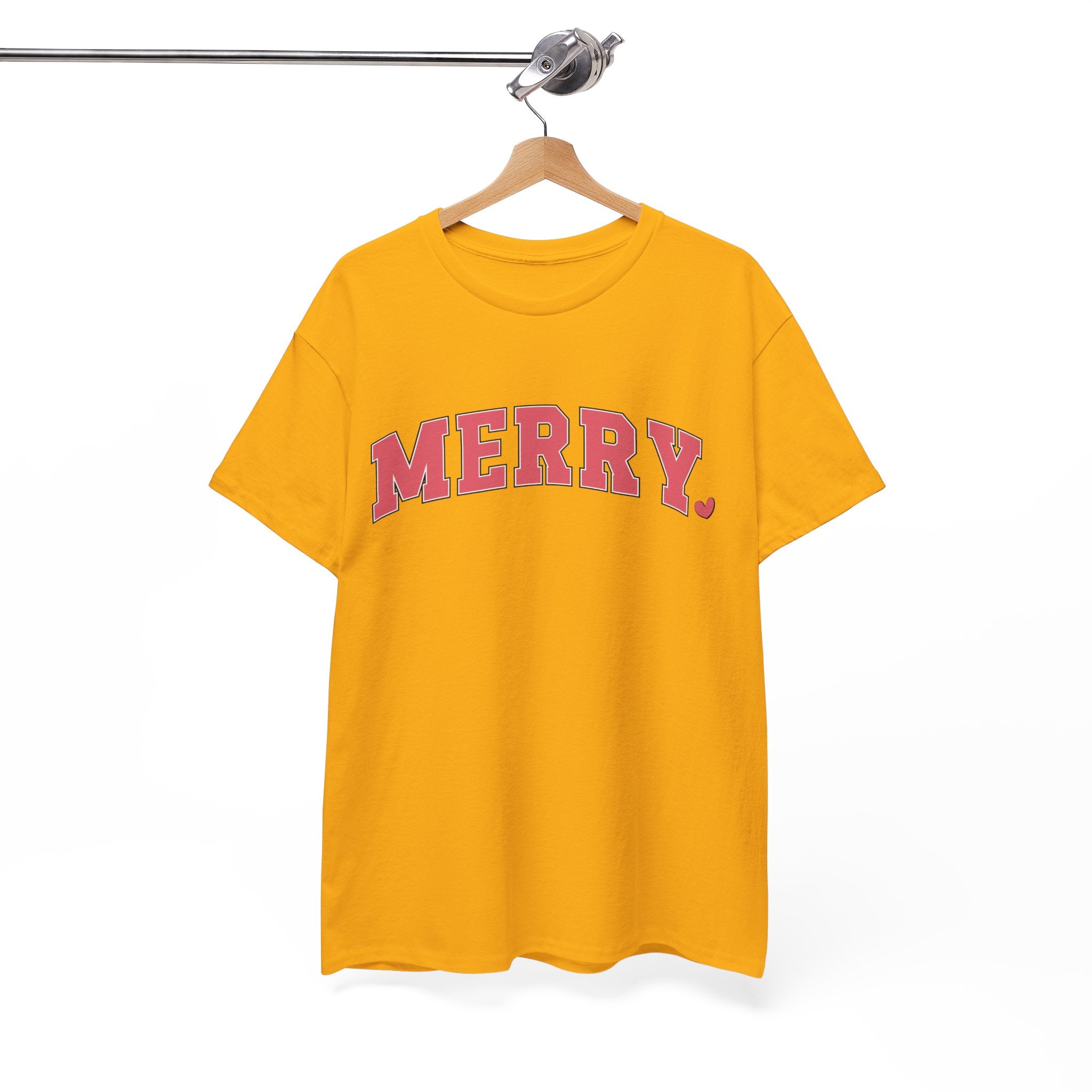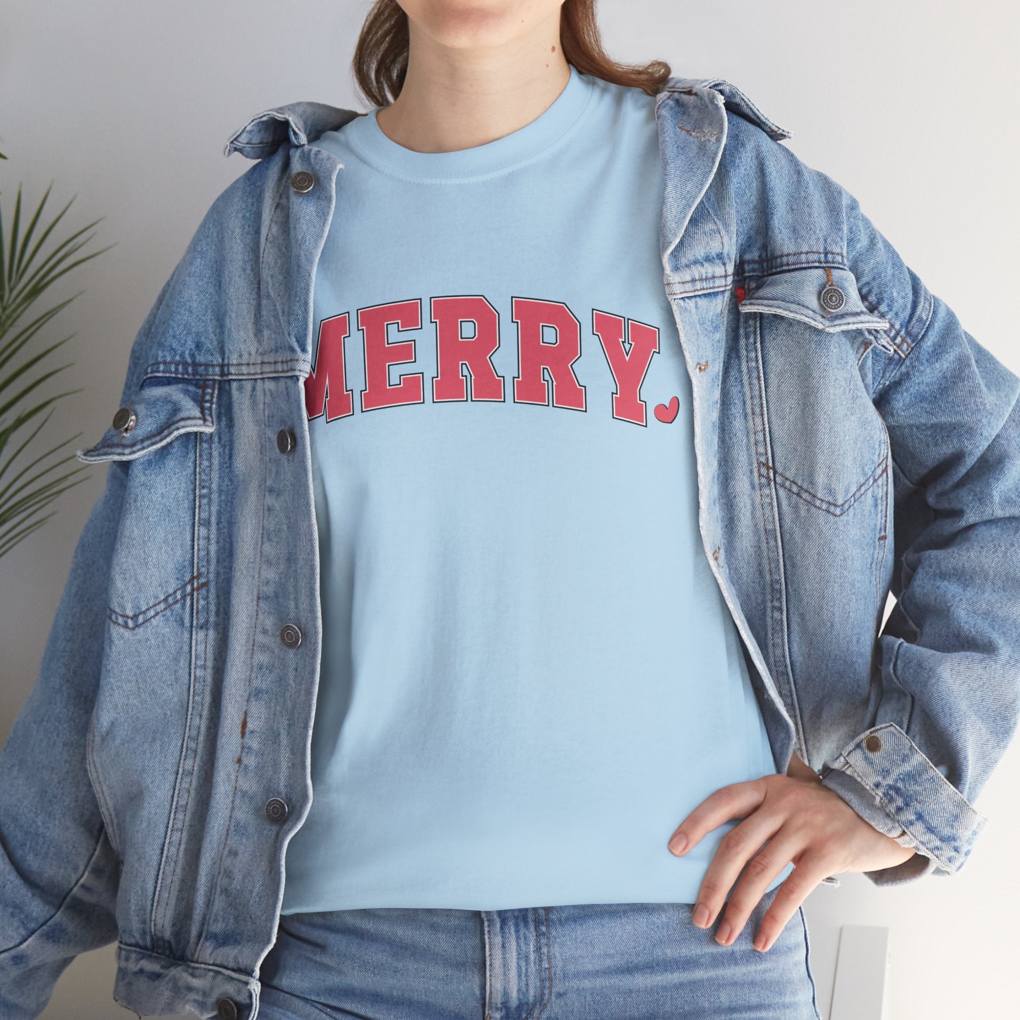 Soft, familiar, and quietly festive — this classic crew tee wears the season like a favorite memory. The front’s arched “MERRY.” text uses a warm, slightly vintage block type that reads like a friendly nod at holiday gatherings. It’s lightweight enough to layer under a cardigan or coat, yet sturdy enough to stand alone during a city stroll or a cozy living-room morning with coffee and string lights. The clean white backdrop keeps the message crisp and wearable beyond a single event, slipping easily into everyday outfits for anyone who likes subtle holiday flair without shouting for attention. Comfortable, breathable, and intentionally simple — it invites smiles and easy conversation wherever small celebrations happen.