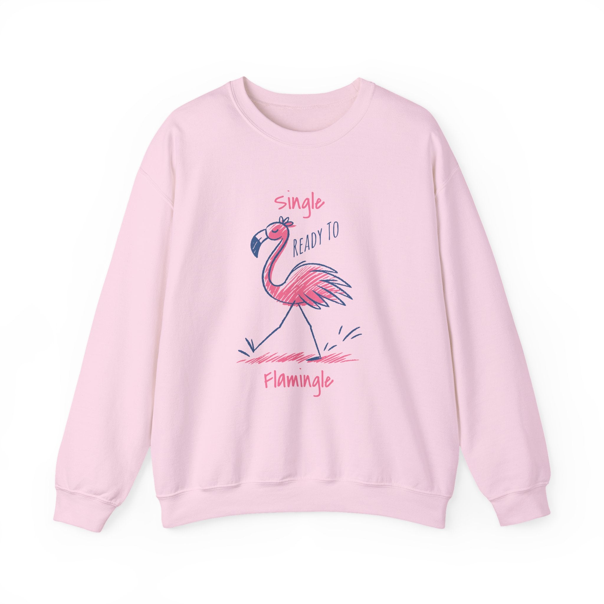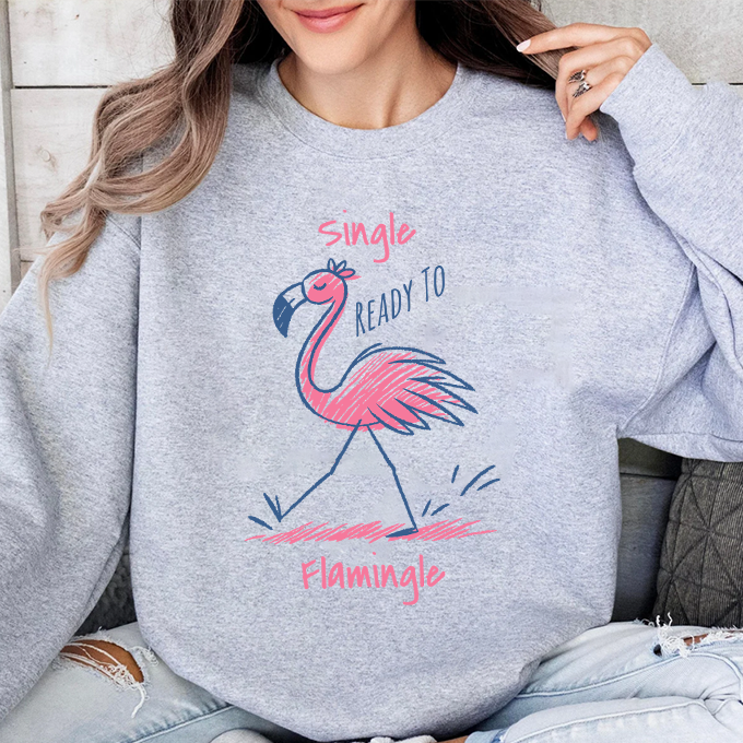 Light, easygoing, and a little cheeky — this crewneck brings a playful splash of color to cool mornings and quiet evenings. The soft 50/50 cotton-poly blend feels cozy against the skin while the classic crew neckline and clean-cut fit keep the look relaxed and wearable. A hand-drawn pink flamingo strolls across the front with the whimsical text “single, ready to flamingle,” giving the sweater a flirty, tongue-in-cheek personality that sits just right for coffee runs, casual nights out, or low-key hangouts. Durable double-needle stitching and a tear-away label mean comfort and longevity without irritation. Subtle ribbed cuffs and waistband hold shape through repeated wear. Thoughtfully made with ethically sourced U.S. cotton and OEKO-TEX certified dyes, this sweatshirt is more than a cute graphic — it’s made to be lived in and loved.