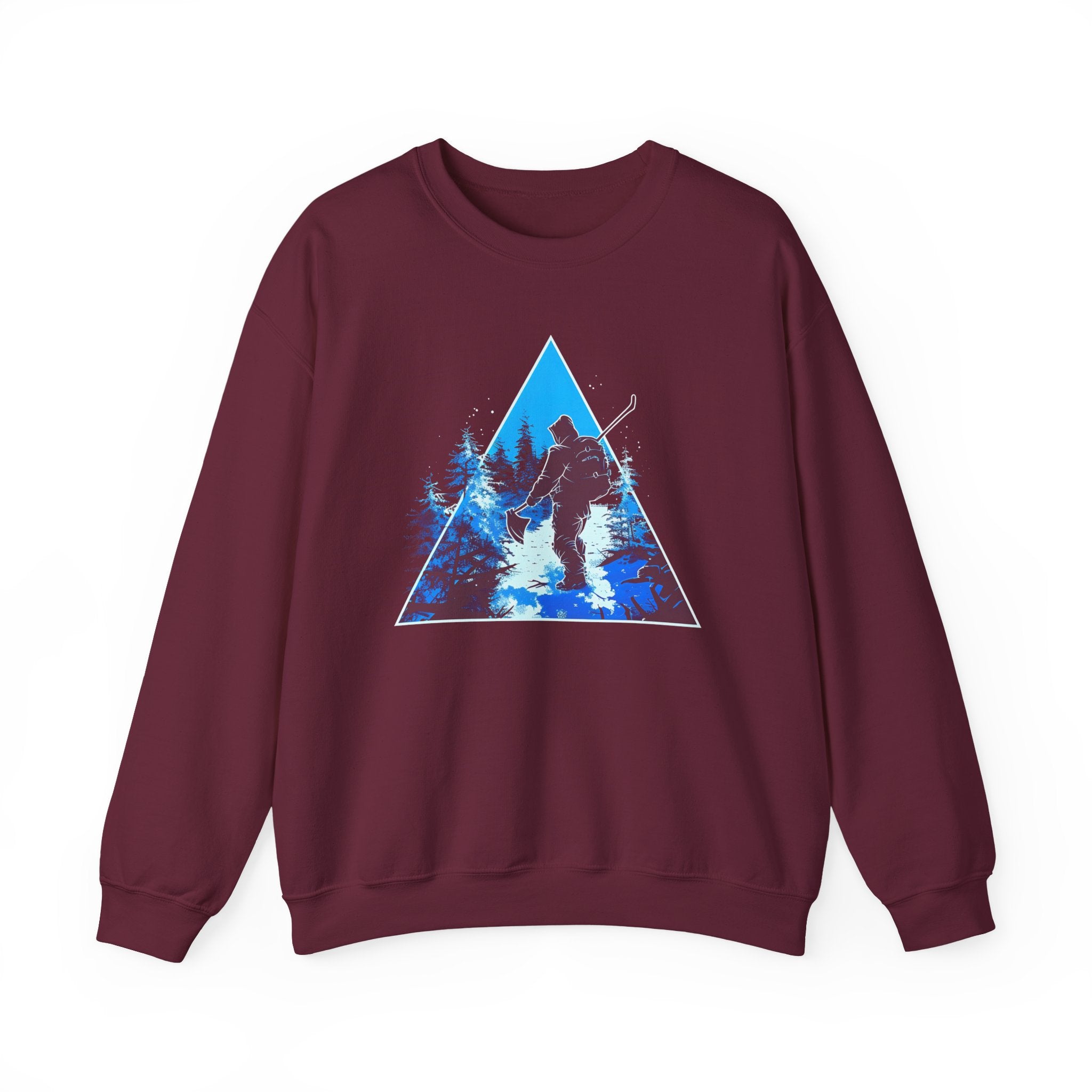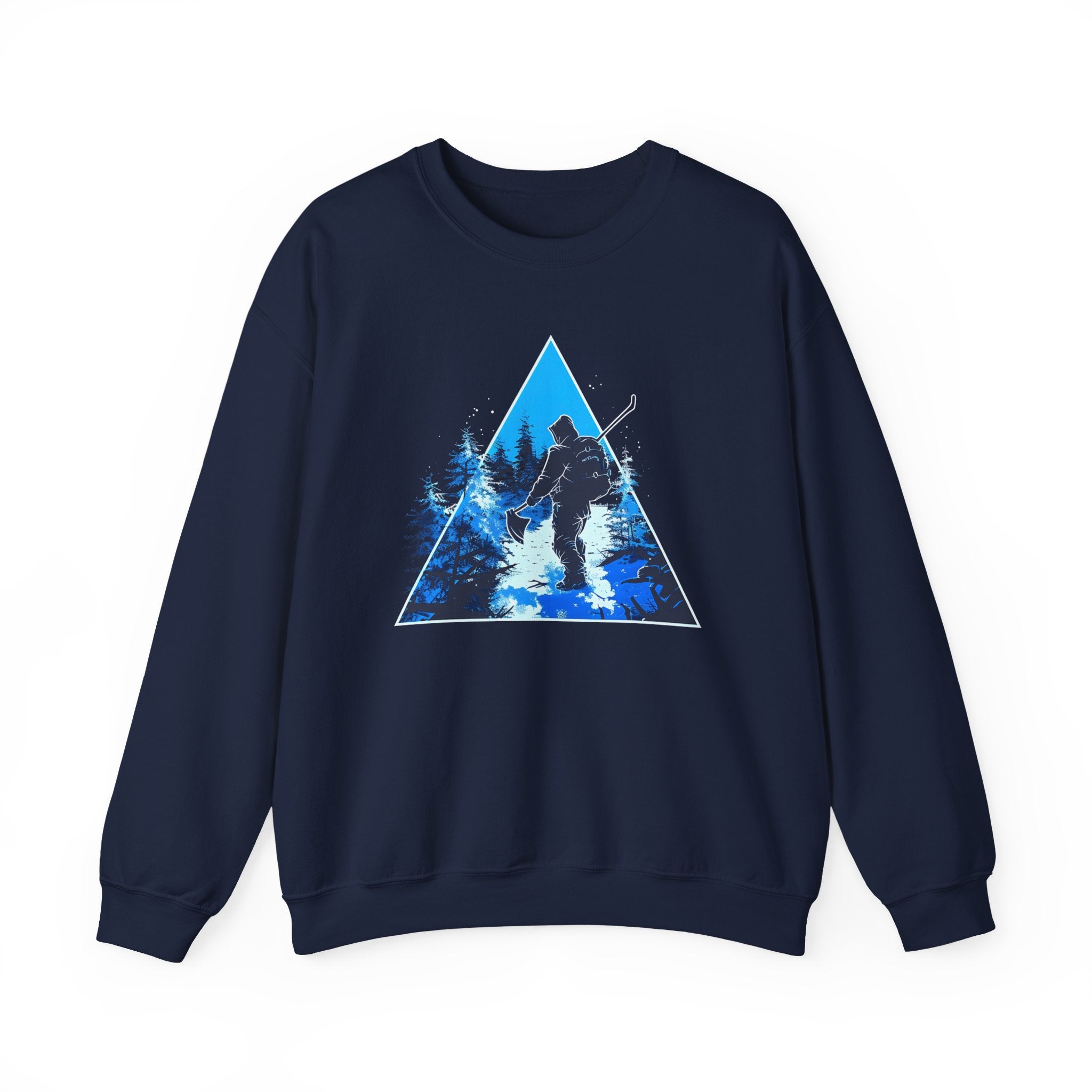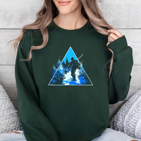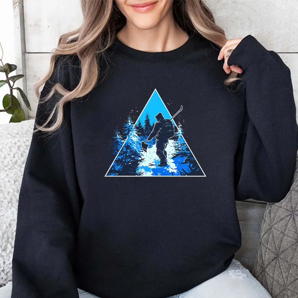 This cozy crewneck captures the hush of a winter night — a lone skier cutting through moonlit trees, rendered in cool blues within a crisp geometric triangle. The medium-heavy cotton-blend holds the print with clarity and feels substantial against the chill. Wear it on early-morning slopes, quiet cabin evenings, or layered for a brisk town walk. The classic fit and ribbed collar sit comfortably while the reinforced stitching keeps it reliable season after season. It’s for people who chase cold-air quiet and the glow of returns to the lodge.