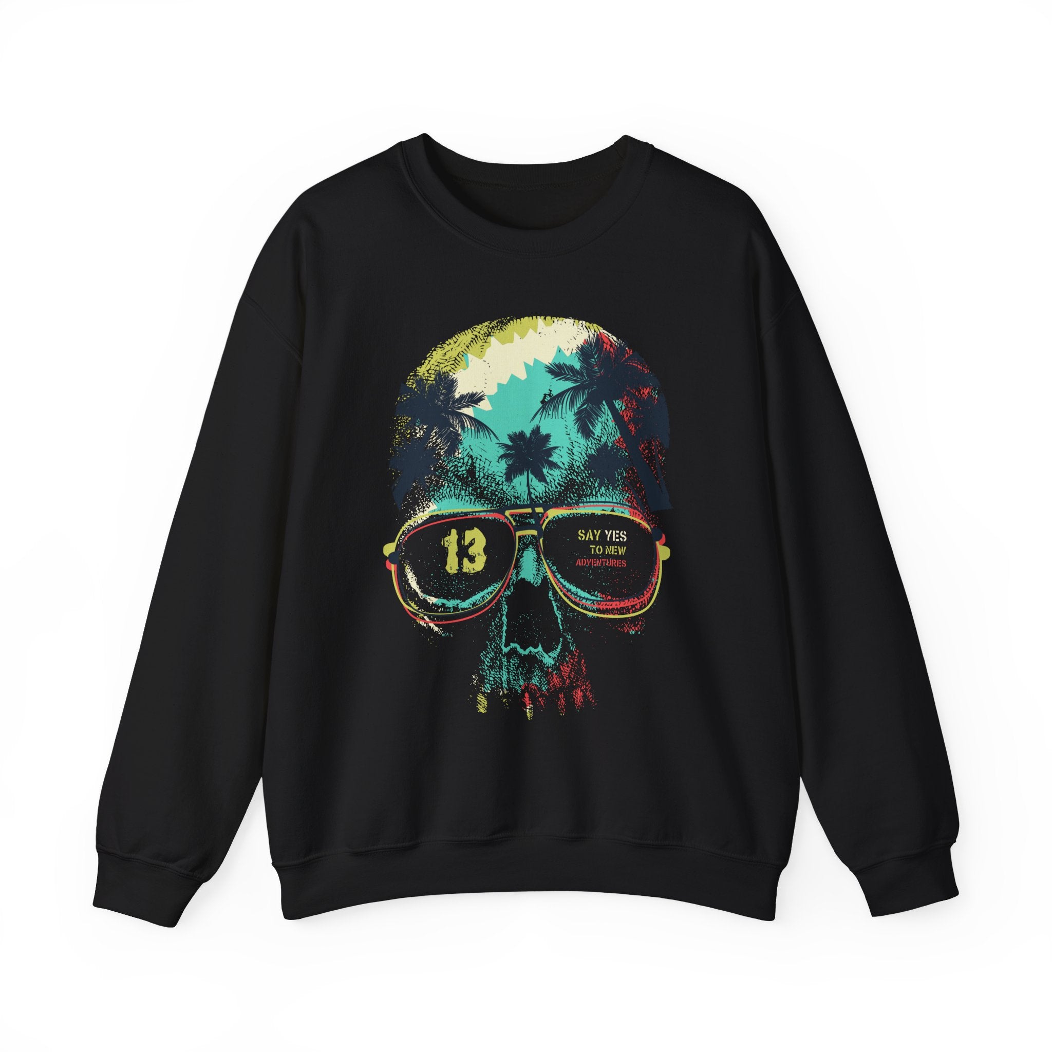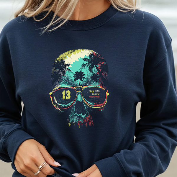 A midweight crewneck that feels lived-in from the first wear. The black cotton-poly blend holds a rich, contrasty print of a tropical skull wearing retro aviator shades — palm silhouettes and sunset hues sit inside the skull, giving it a warm, slightly sinister vacation vibe. The classic crew cut and ribbed collar frame the chest artwork cleanly, while double-needle stitching and a tear-away label keep comfort and durability front and center. Wear it on cool evenings after a long drive, at bonfires near the shore, or layered under a jacket when you want a bold, slightly rebellious statement without shouting for attention.