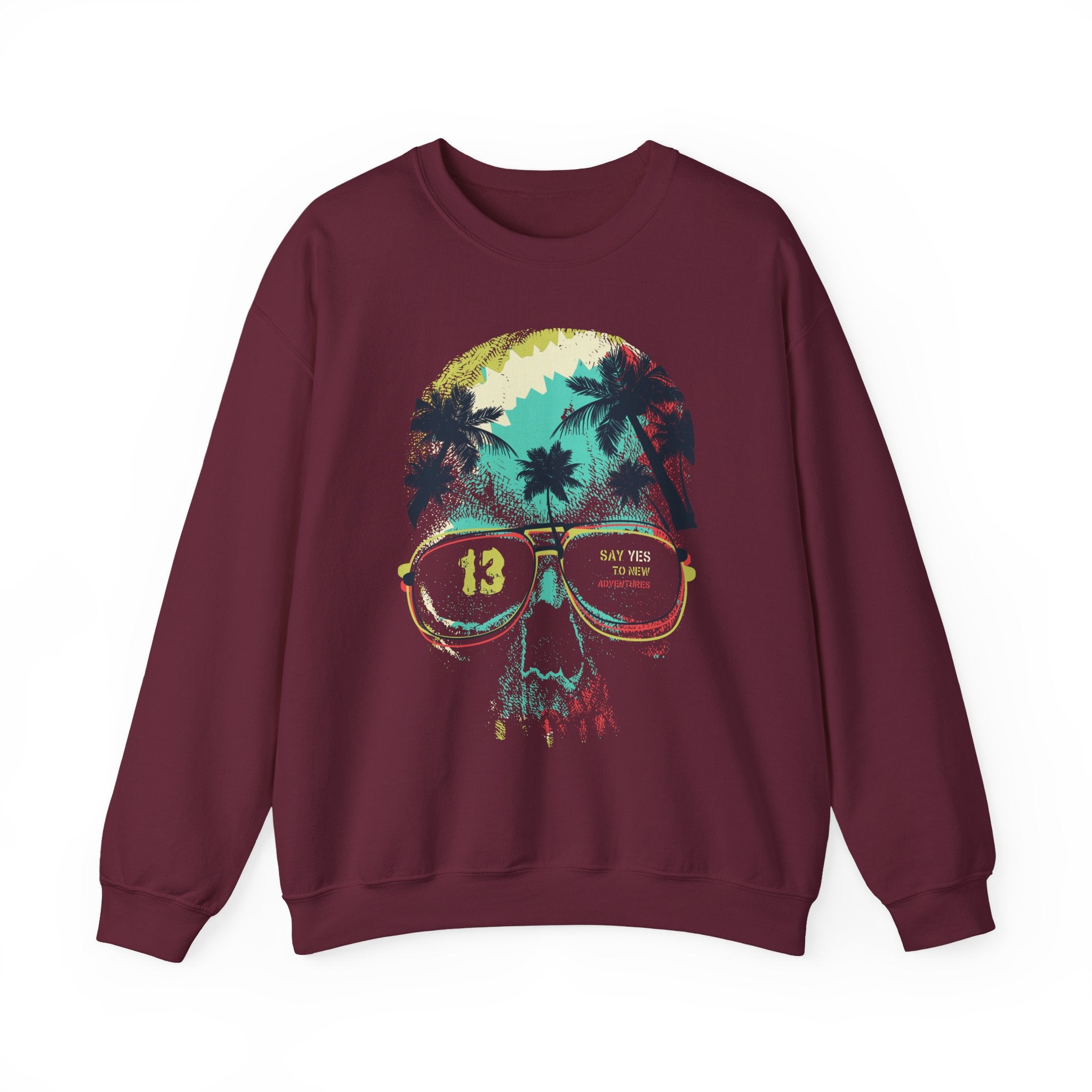 Skull Sunglasses Sweatshirt — Tropical Palm Skull Crewneck ("13" Lens)