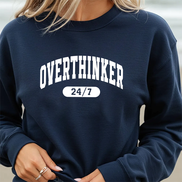 Soft, sturdy, and quietly funny — this crewneck speaks directly to the late-night mind that never stops turning. The black sweatshirt features bold collegiate-style lettering reading "OVERTHINKER" arched across the chest, with a small "24/7" badge underneath. It wears like a familiar hoodie replacement: roomy but not bulky, with a clean crew neckline and ribbed cuffs that hold their shape after repeated wear. Cozy enough for couch sessions and durable enough for everyday routines, it’s a relaxed layer that nods to those who live in contemplation and dry humor.