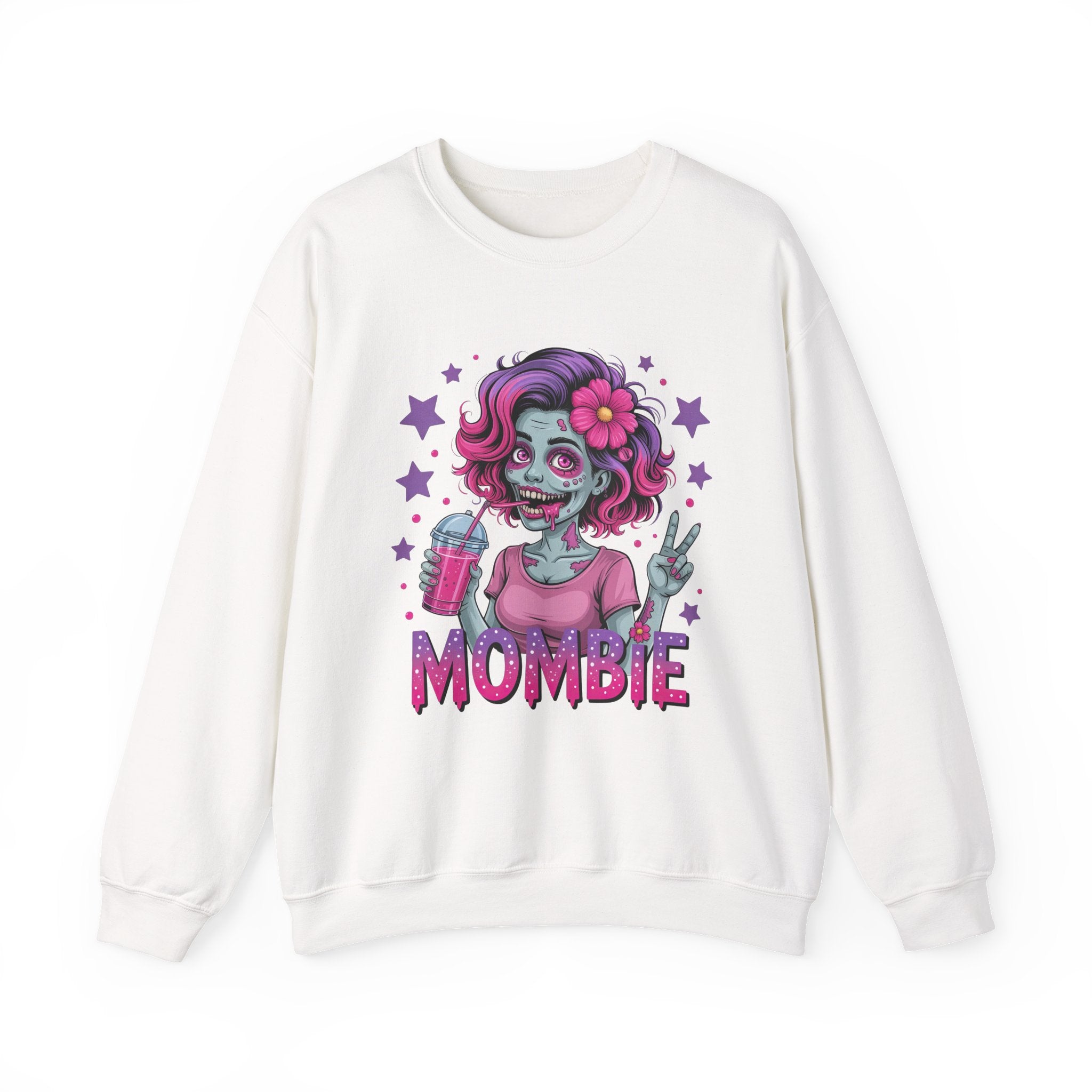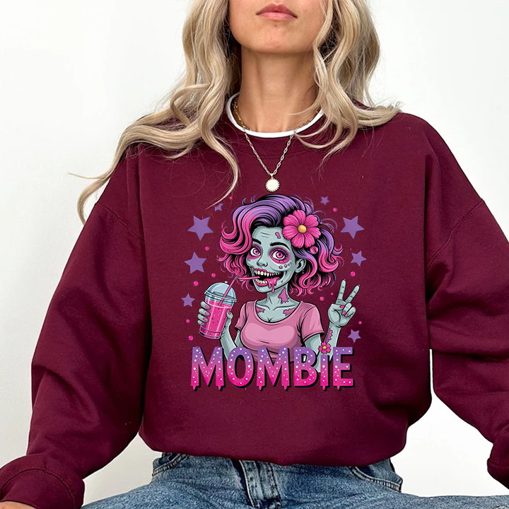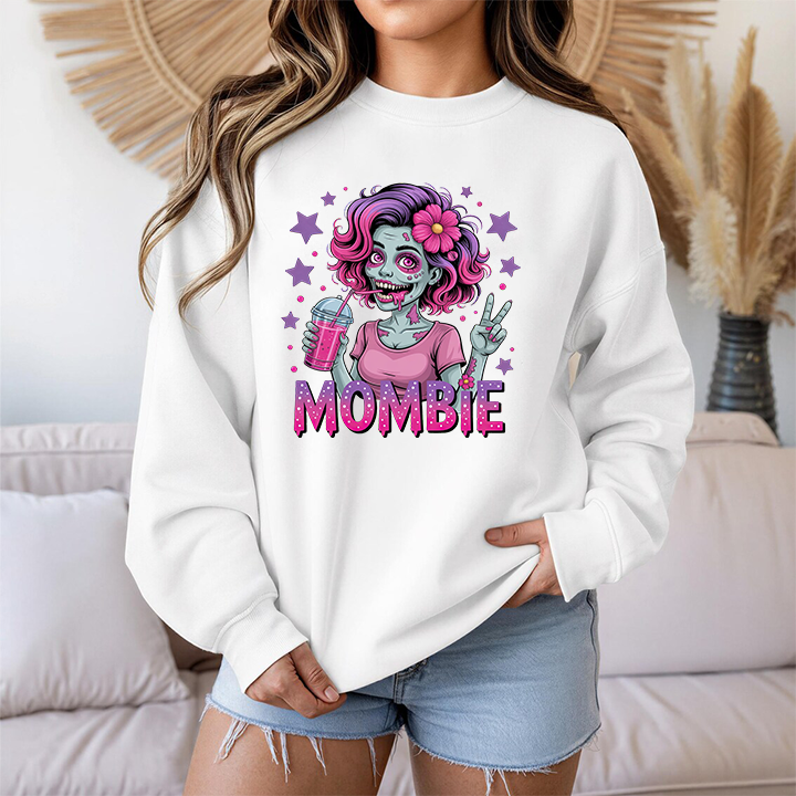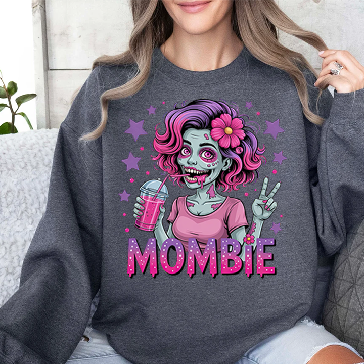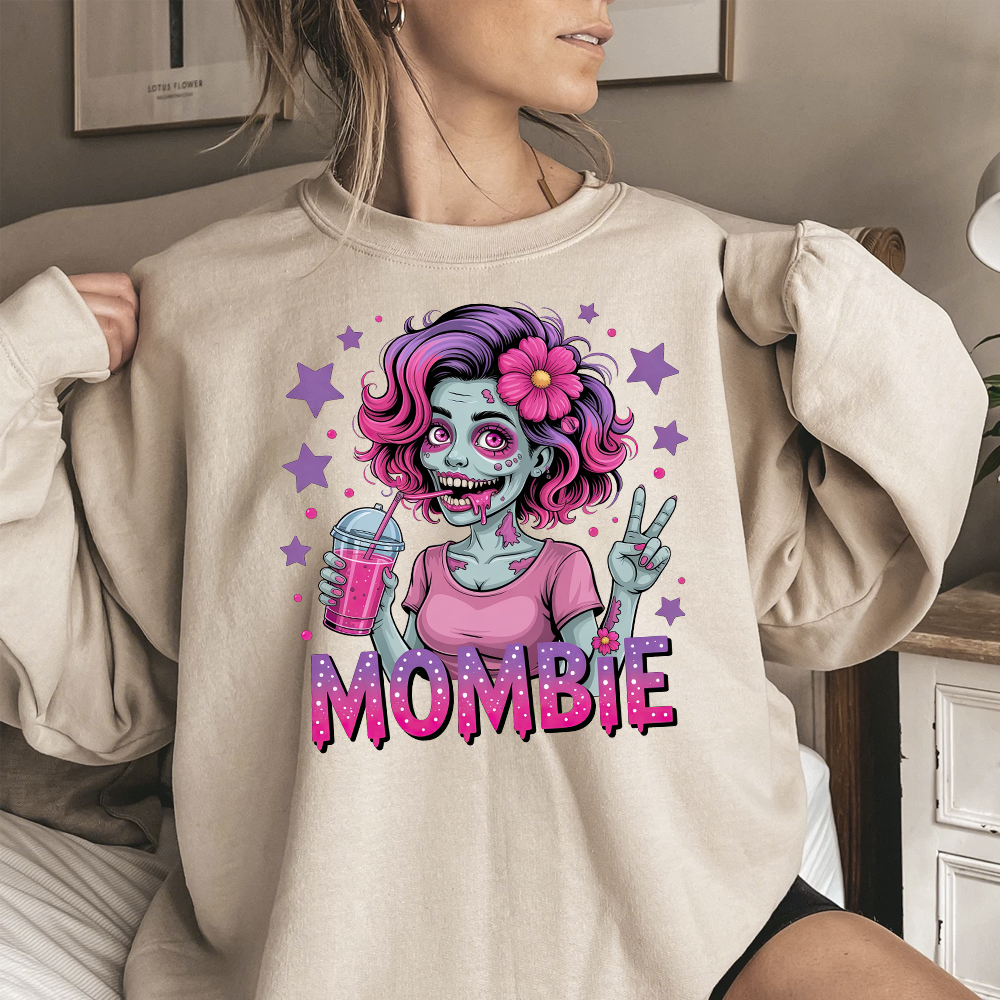 Embrace the chaos of motherhood with a spooky twist! This "Mombie" sweatshirt is the perfect blend of Halloween fun and everyday reality for the tired mom who runs on caffeine and sheer will. The design features a vibrant, high-quality illustration of a stylish "zombie mom" sporting messy-but-cute pink and purple hair, flashing a peace sign, and clutching her lifeline—a refreshing iced drink. Completed with bold, dripping typography, this crewneck is a humorous badge of honor for those days when you feel like the walking dead but still get it all done.
