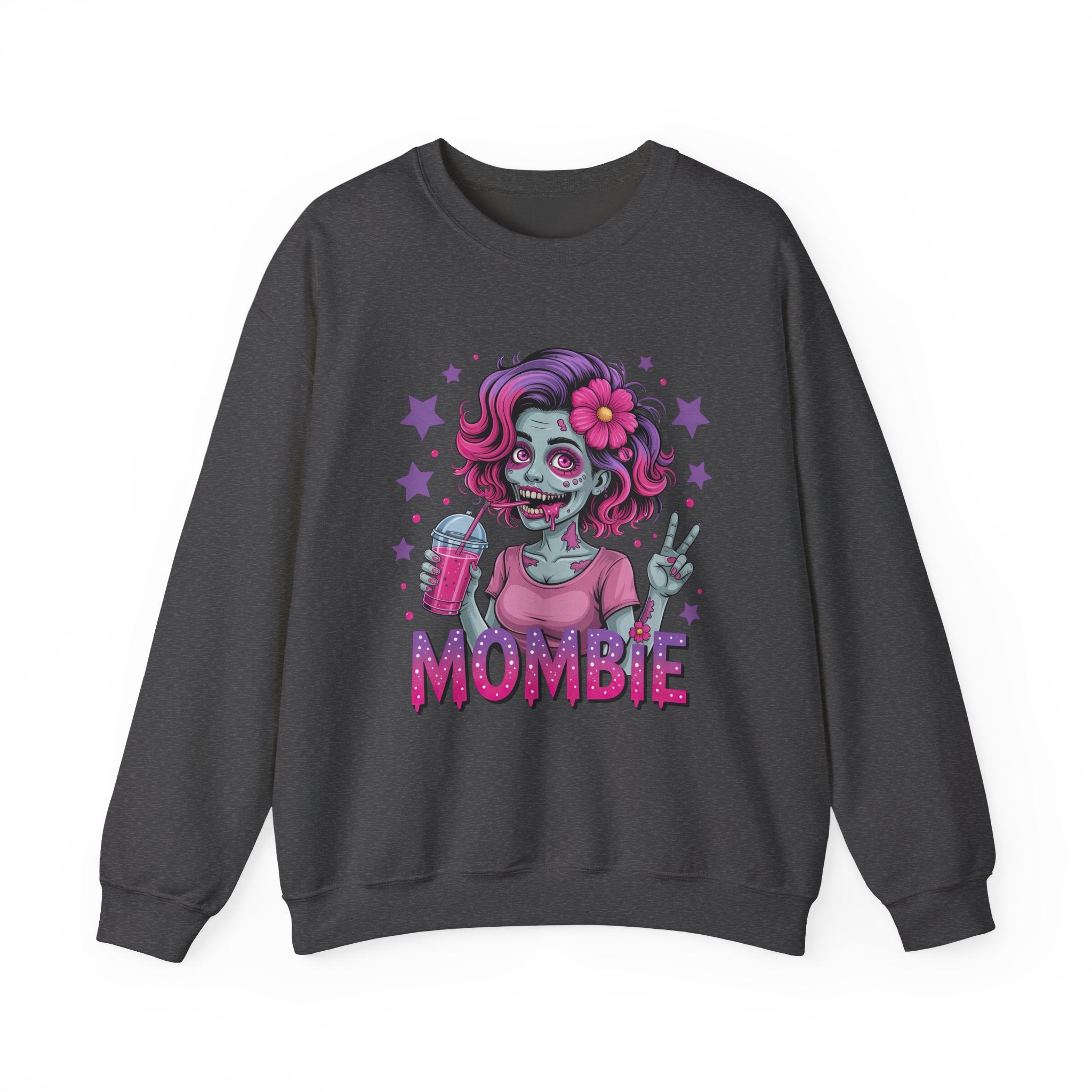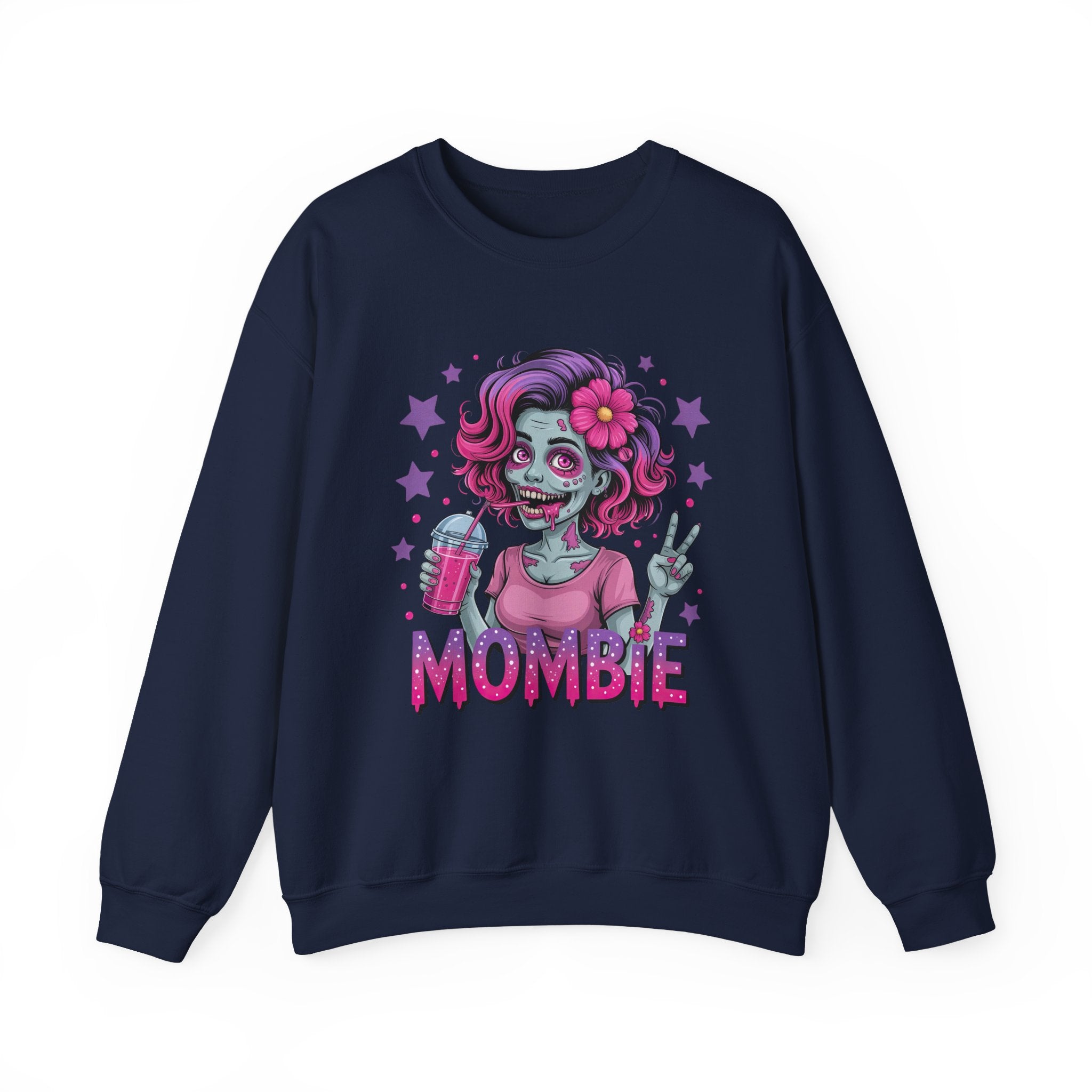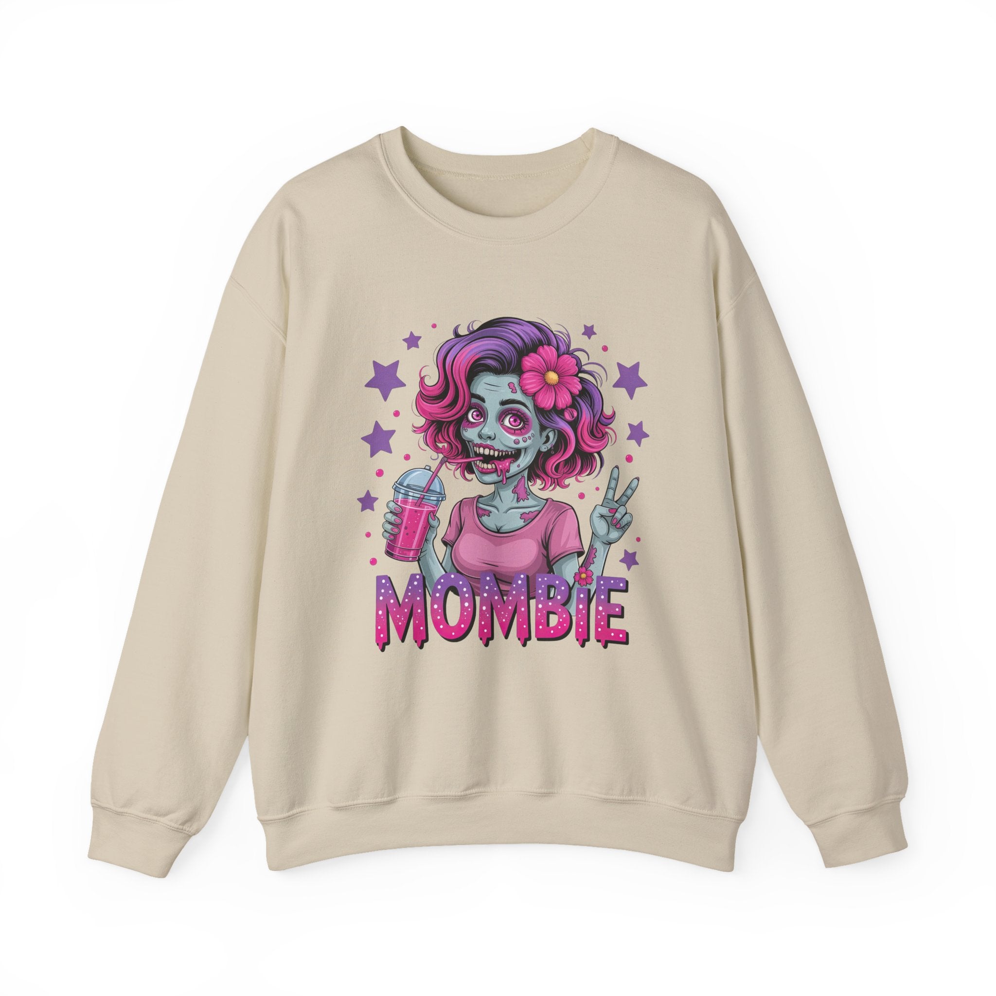 Embrace the chaos of motherhood with a spooky twist! This "Mombie" sweatshirt is the perfect blend of Halloween fun and everyday reality for the tired mom who runs on caffeine and sheer will. The design features a vibrant, high-quality illustration of a stylish "zombie mom" sporting messy-but-cute pink and purple hair, flashing a peace sign, and clutching her lifeline—a refreshing iced drink. Completed with bold, dripping typography, this crewneck is a humorous badge of honor for those days when you feel like the walking dead but still get it all done.