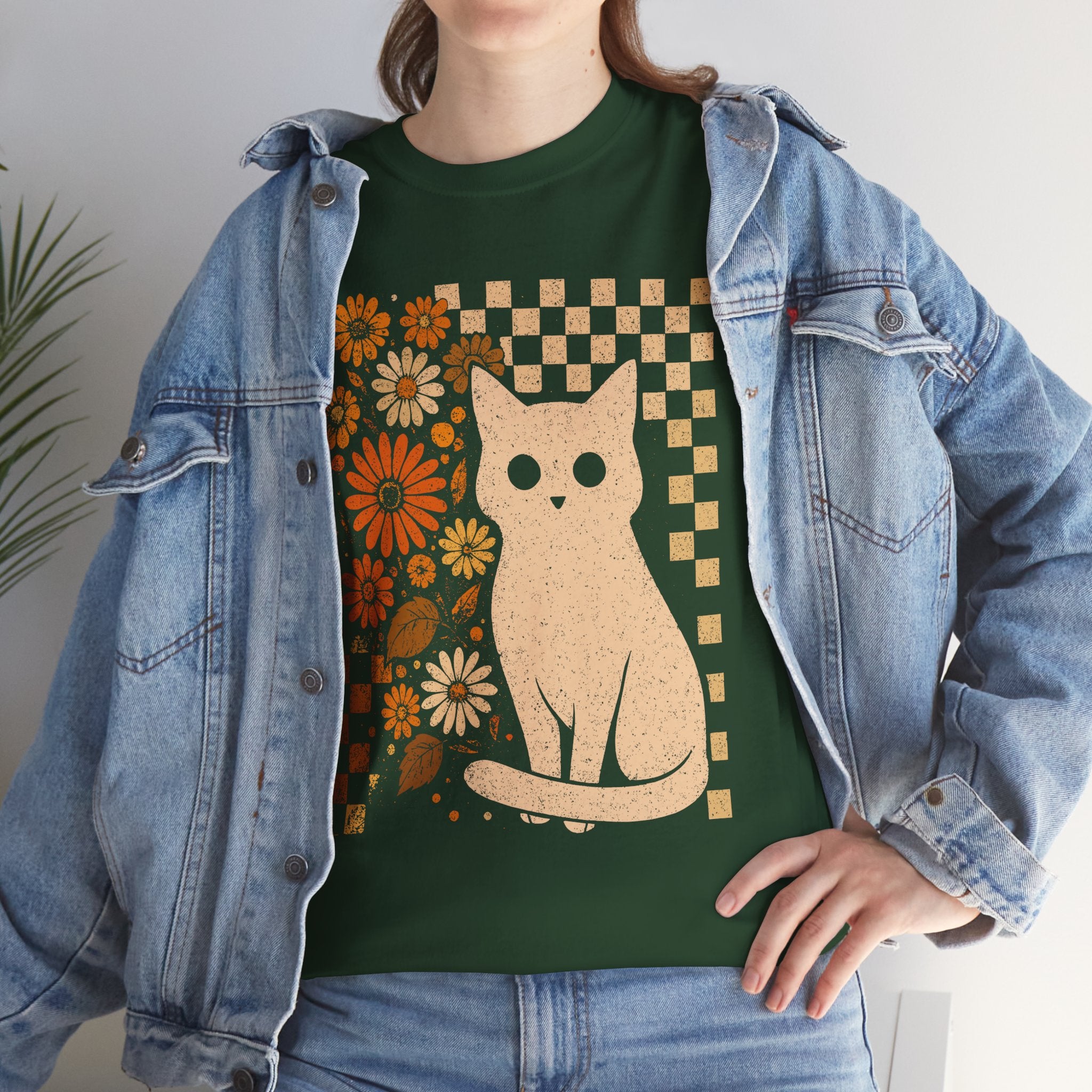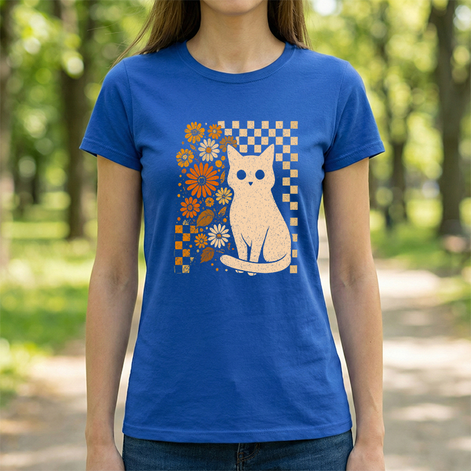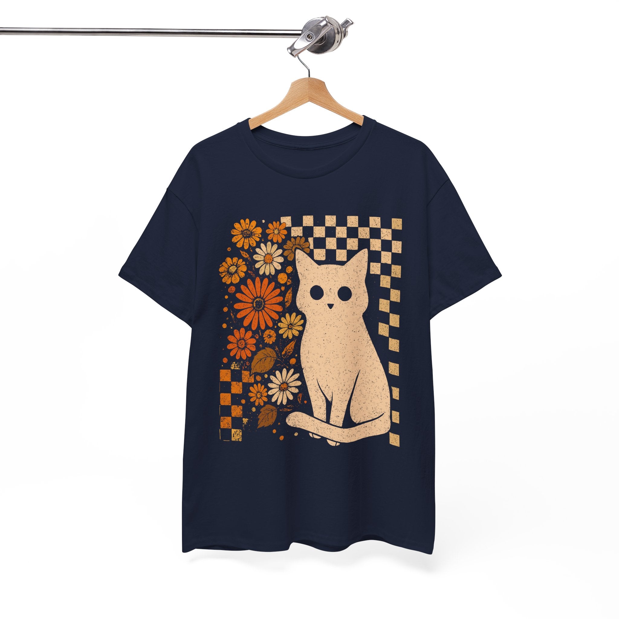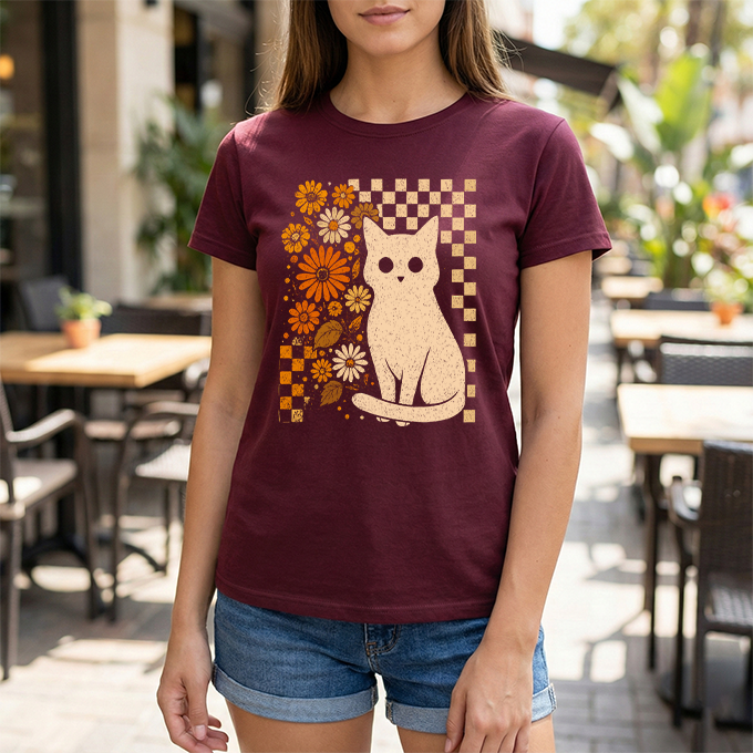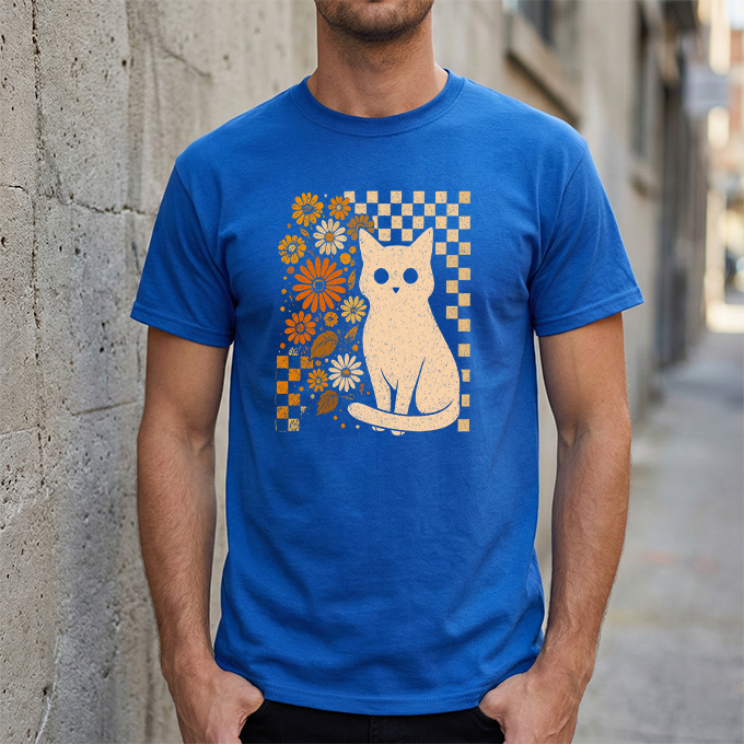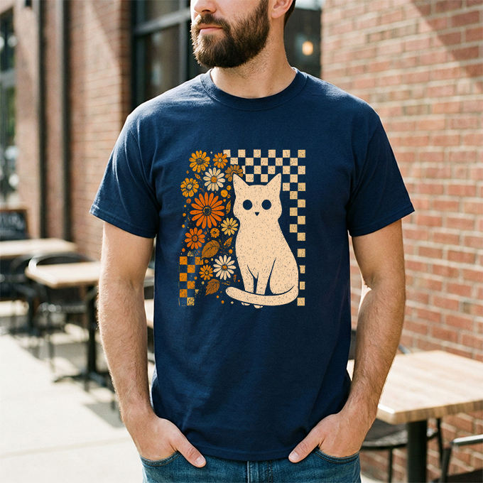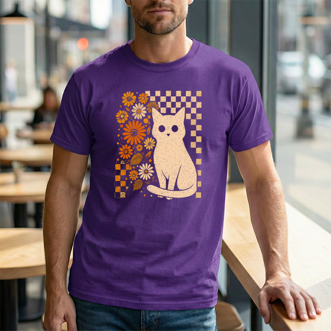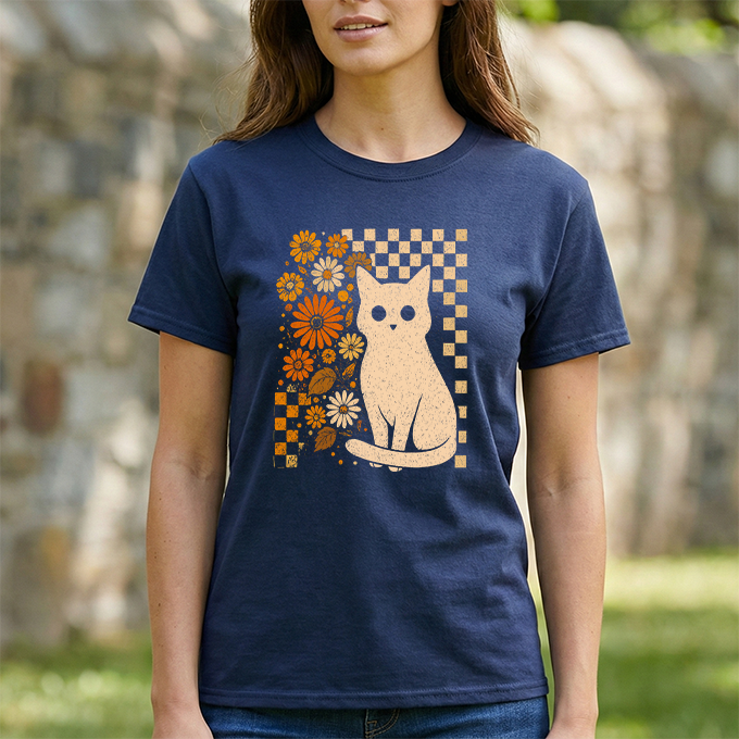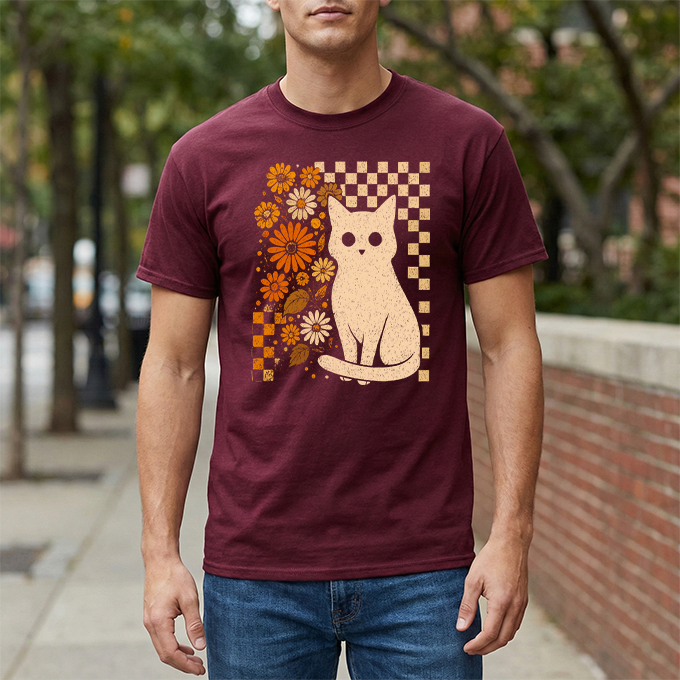Channel some groovy vibes with our Retro Floral Cat T-Shirt. This unique design blends a classic checkerboard pattern with warm, vintage-inspired orange blooms—all centering around an adorable white cat illustration. It’s the perfect mix of "Cat Mom" cute and retro cool. Printed on a soft black cotton tee, this shirt pairs effortlessly with high-waisted jeans or corduroys for that perfect fall or boho look.